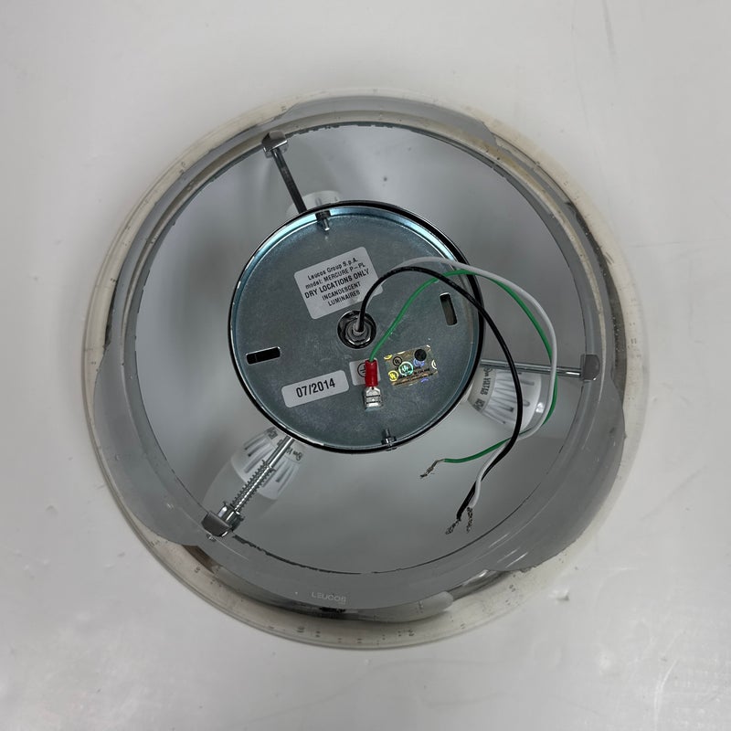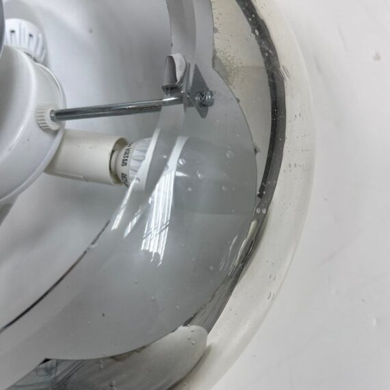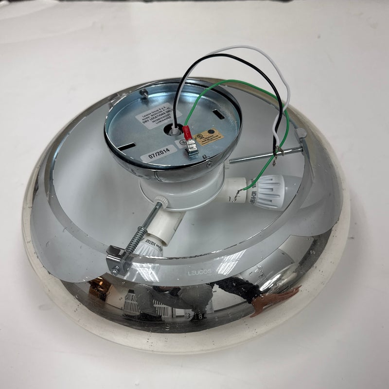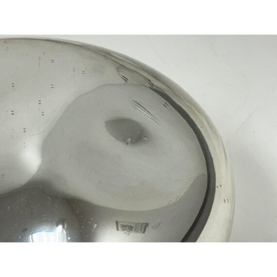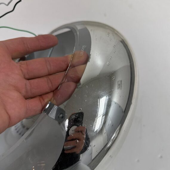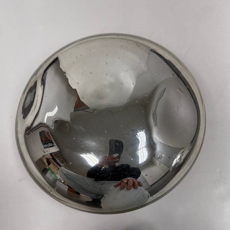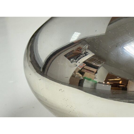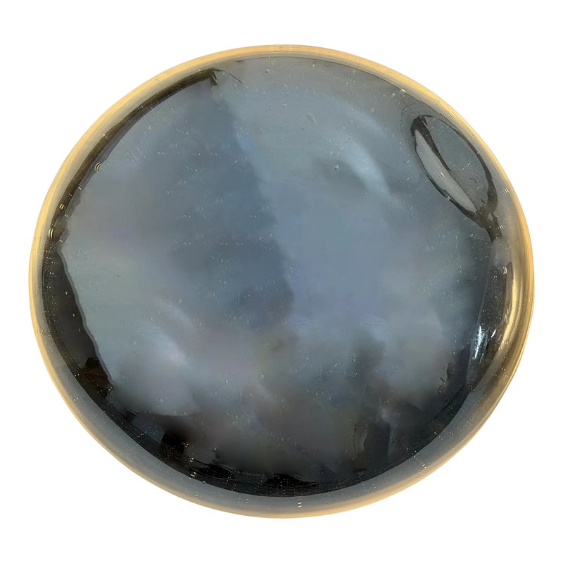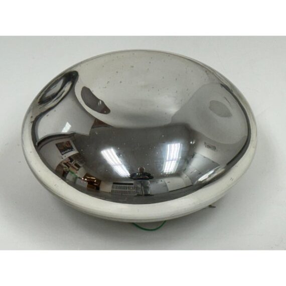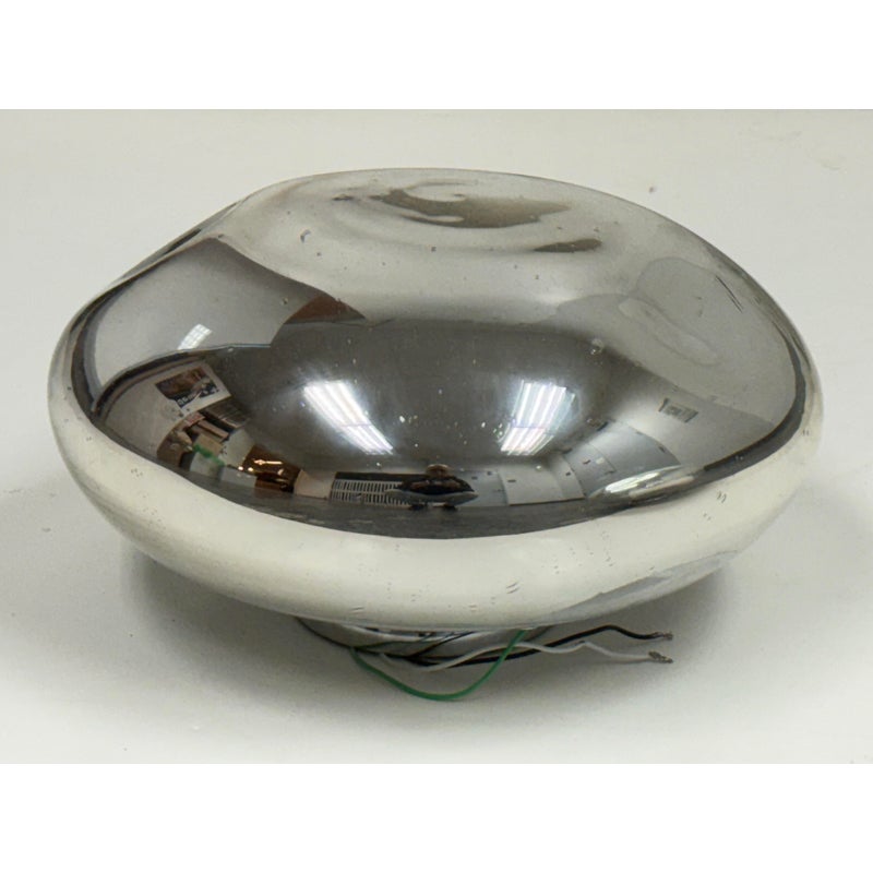 Design Plus Gallery presents a Mercure Ceiling/Wall Lamp Designed by Patrick Jouin and Luecos. Jouin explored a traditional Murano glass blowing technique called pulegoso and up-dated it to create a decidedly contemporary light that dazzles. Mercure is made by adding a mist of water between the layers of the hand-blown glass (vetro incamiciato). The mist evaporates between the layers of molten glass and creates bubble patterns that are unique to each lamp. The glass is then dimpled to create a further ripple effect across the surface and finally an inside portion of the glass is chromed to create a mirror finish. The result is pulegoso stars of light that dance on the chromed front surface while light pours from behind the fixture to create a beautiful, illuminating back light. In good condition, minimal wear from usage.