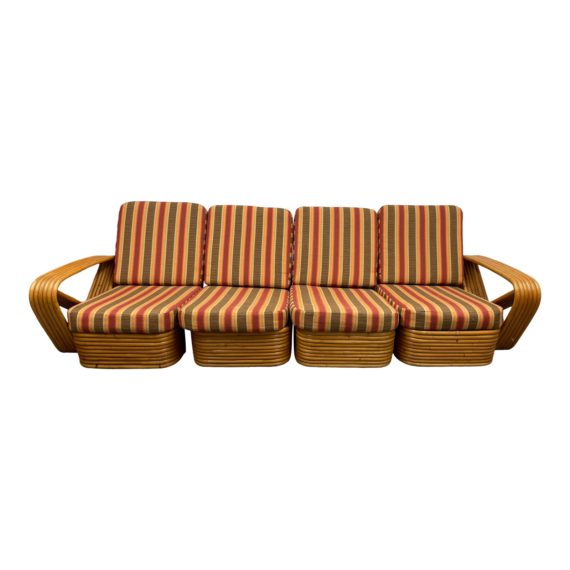 Design Plus Gallery presents a Paul Frankl Pretzel Rattan Four Seat Modular Sofa. Six strand steam bent rattan frames are wrapped in a Deco fashion and coated lightly to showcase the natural tone of the bamboo. Cushions have been customized with a vibrant cranberry, chartreuse, umber and peach stripe upholstery. Visible wear on some of the cushions, but they are reversible. Sofa is in good condition and able to separate for modular configurations.