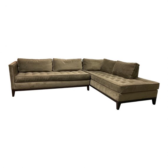 Design Plus Gallery presents a Two Piece large custom sectional. Custom made in San Francisco. Sectional fuses blind tufted bench seating with a solid wood base and micro fiber olive upholstery. The base is wood with an espresso finish. One tufting has come undone. Seat and back cushions are loose. Minor wear on fabric and base. An Inviting statement in a large living or media room lounge.