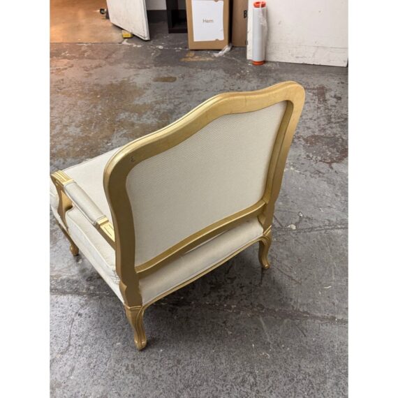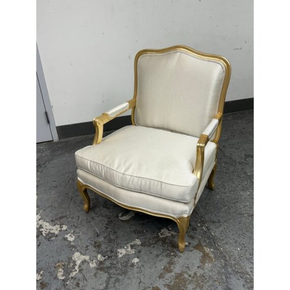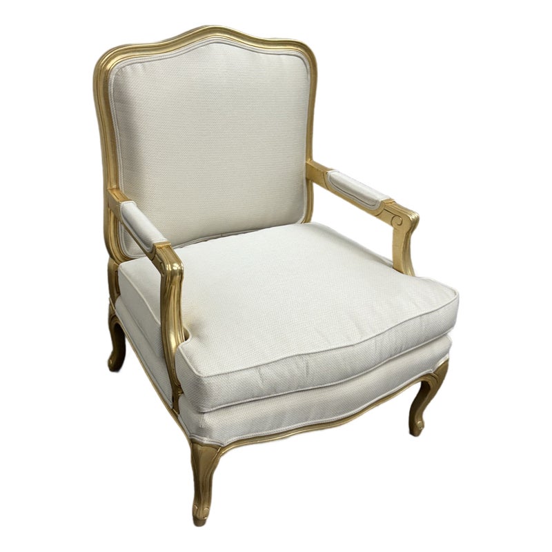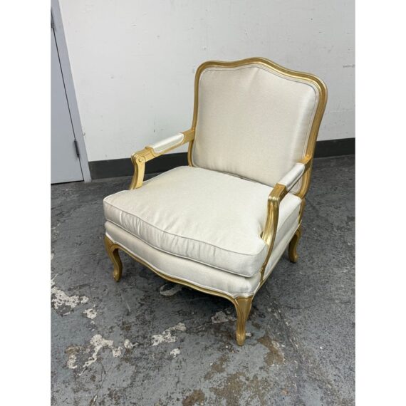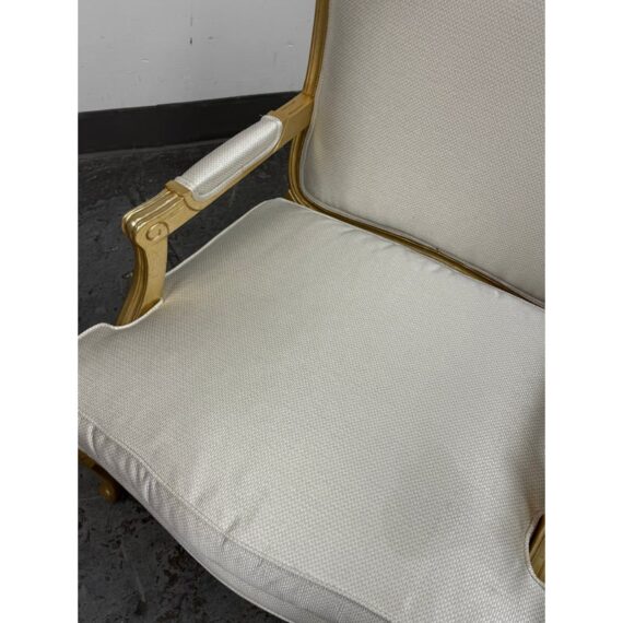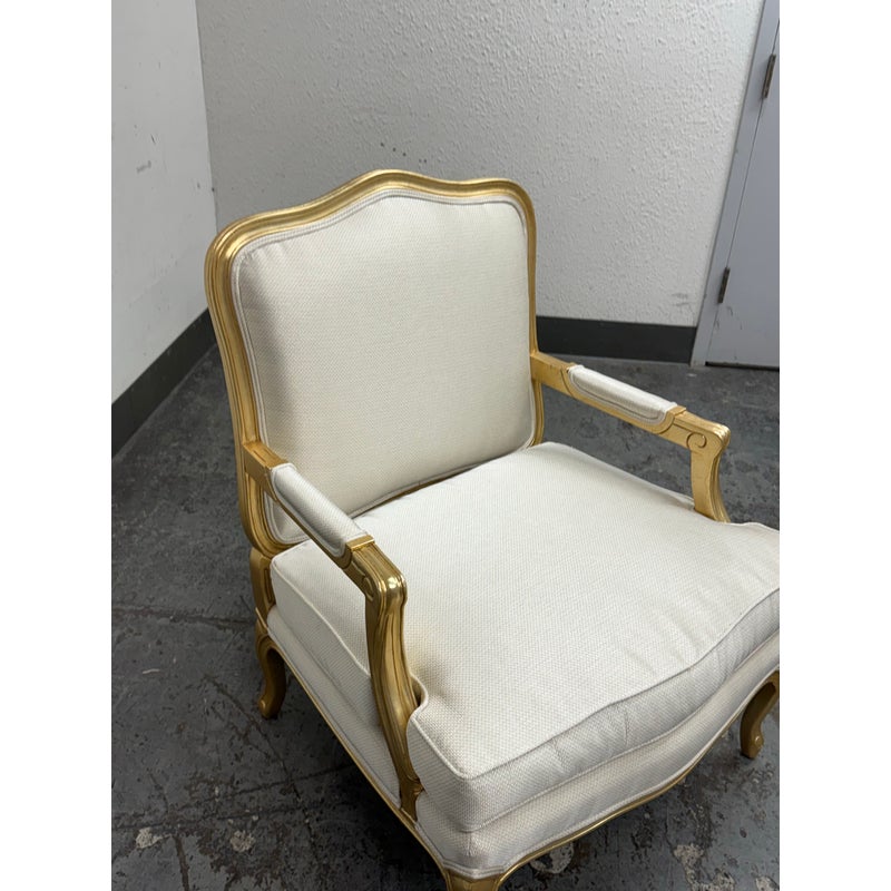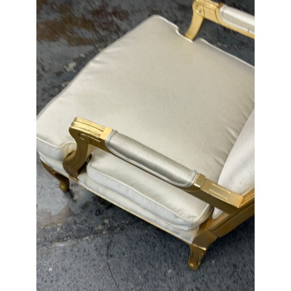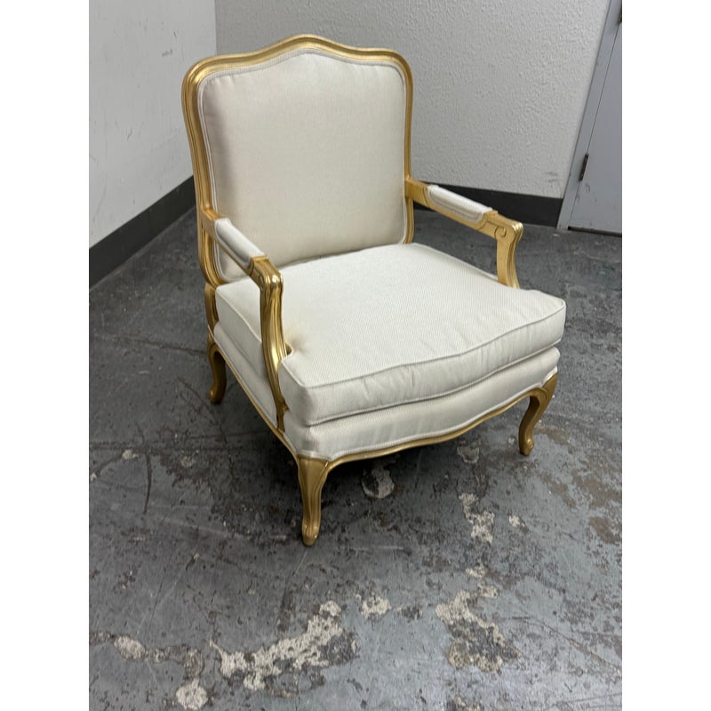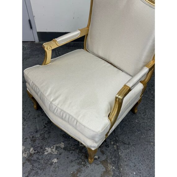 Design Plus Gallery presents the Bonnie Living Room Chair from Pearson for Hickory Chair. The Bonnie Chair was inspired by a French antique. It is hand-carved from beech solids with standardized spring-down seat cushion and a blend of down seat back cushion. The finish to the wood frame is a gilded gold and the fabric material is an off-white woven silk. The chair has been discontent by the brand and is in good condition with minimal surface wear on fabric for its age. Made in the USA.