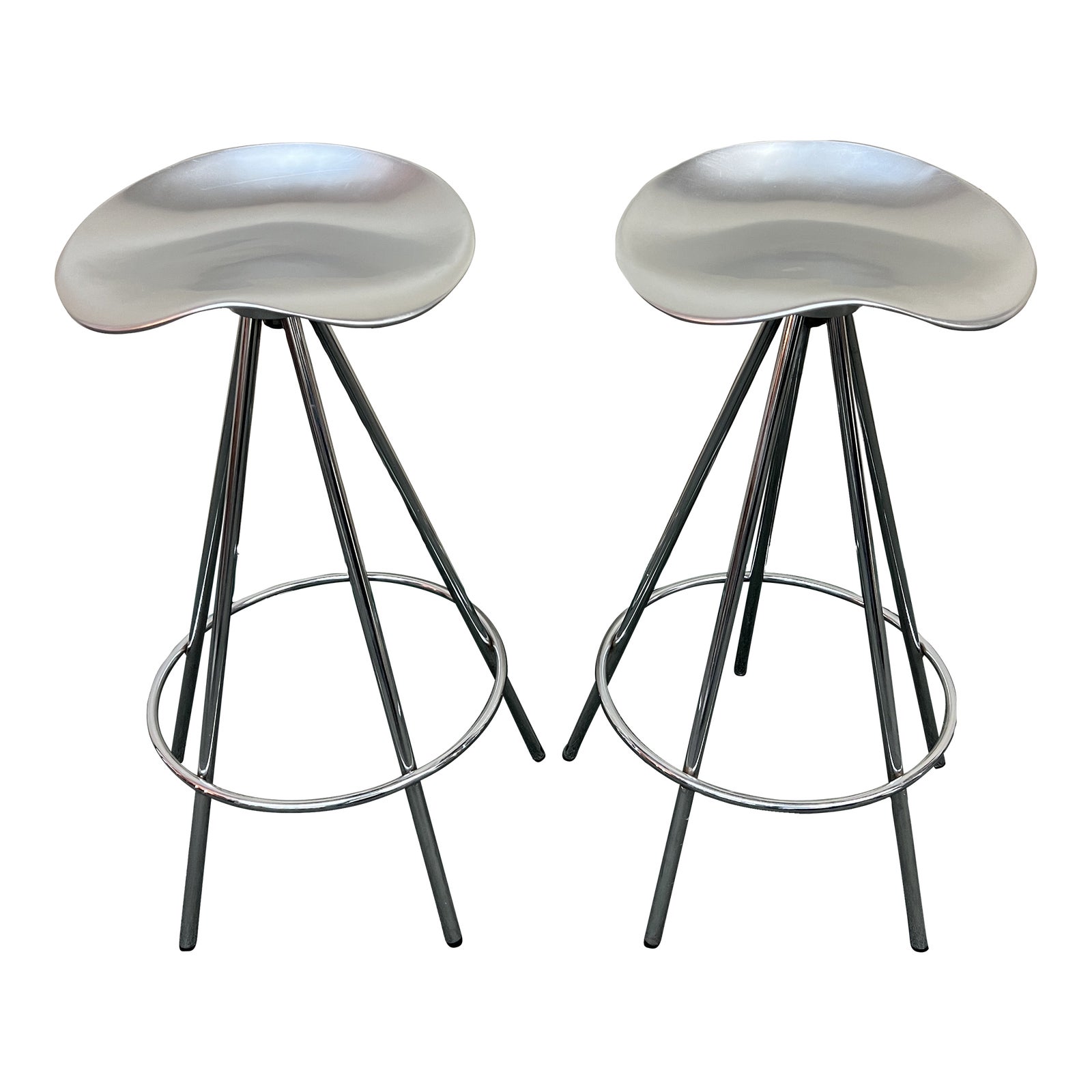 Design Plus Gallery presents a Pair of Jamaica Barstools by Amat-3 Furniture. Designed by Spanish Designer Pepe Cortés in 1991. Intended for use in a multitude of environments both commercial and residential. Cortés with experience in the realm of hospitality wanted to design a stool, an essential piece of seating, that was both function and elegant. A durable polished aluminum build, sculpted organic seat and its 360° swivel capability. Each stool’s underside has a stamp of authenticity. Minor wear on the finish. Made in Spain.