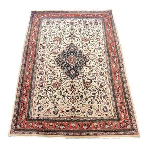 Design Plus Gallery presents the 3ft7in X 5ft2in Persian Handmade Wool Border Rug. A medallion with a black background and colorful floral accents rests in the center. Across the whole rug are displayed an array of floral motifs, particularly vines and buds. Wear is consistent with use; rug is in good condition. A spiraling vine pattern exudes playfulness on the surfaces with a red background.