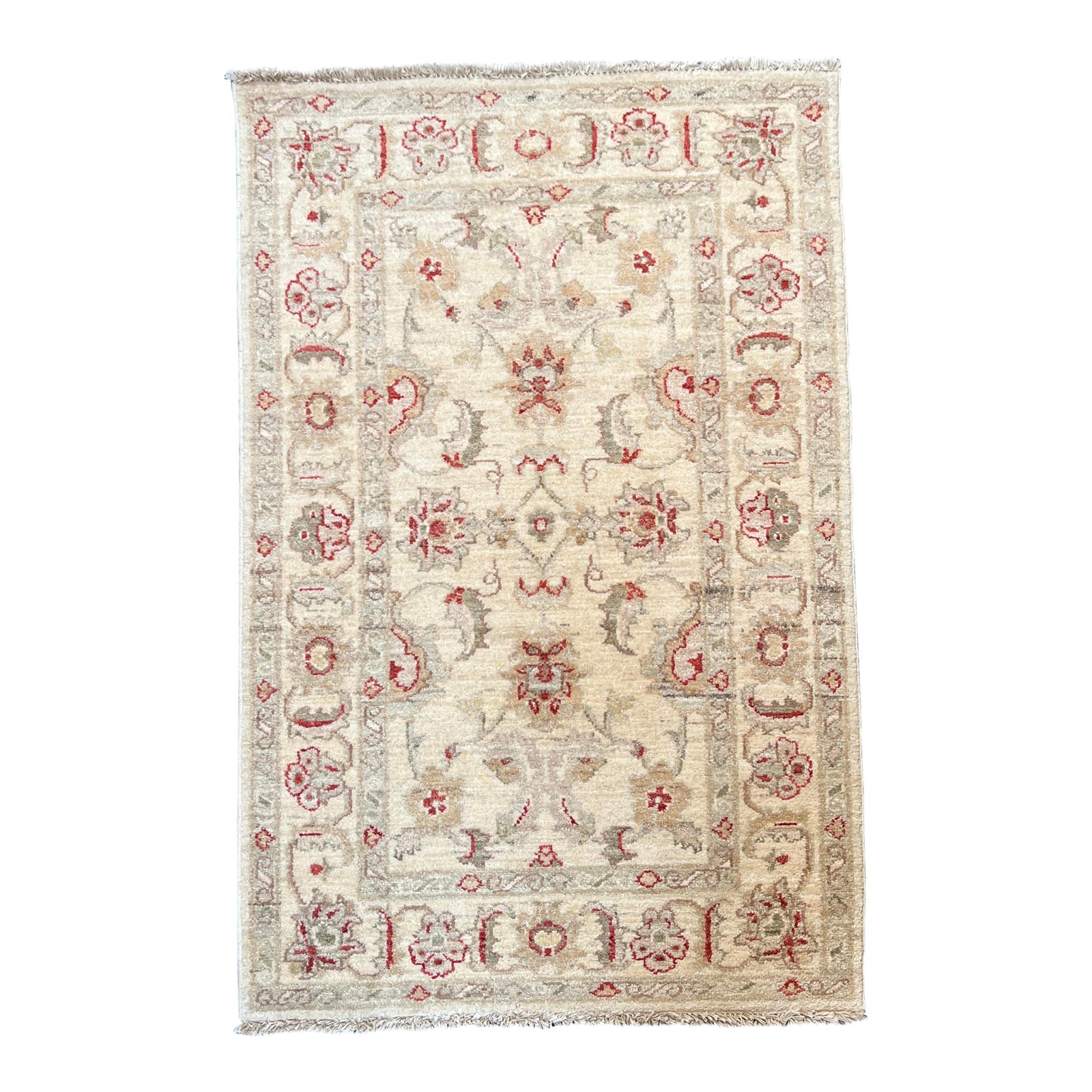 Design Plus Gallery presents a Persian Style Area Rug. Petite and neutral, the lovely ivory ground rug can easily find a space in your home. Large border in taupe along with the floral pattern is accented with deep ruby details. Light evidence of wear; short fringe; overall good condition.