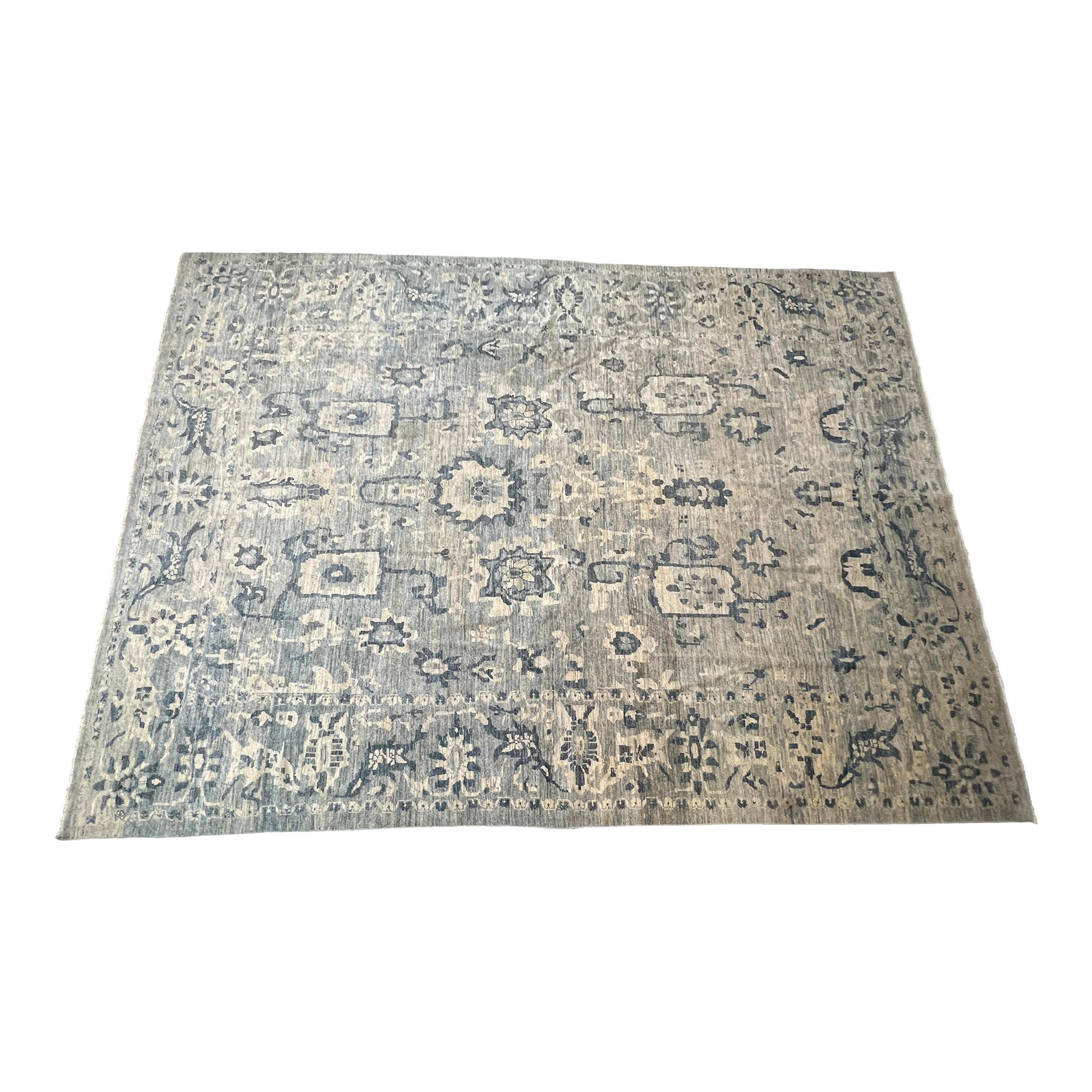 Design Plus Gallery presents a 9ft9in × 14ft1in Persian Sultanabad Style Rug. Hand knotted with multicolor blues, cream and grays. Visible markings and will need a professional cleaning.