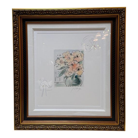 Design Plus Gallery presents an Etching by Peter Max Titled “Vase with Flowers II (Angel with Heart/Profile), 2017. The etching with hand drawn colored pencil remarries of an Angel with Heart in the lower left corner and Profile in the upper right corner on woven paper from the Peter Max Studio. Hand signed in pencil in the lower right margin and annoted. Is in good condition for its usage.