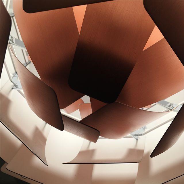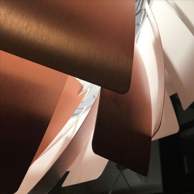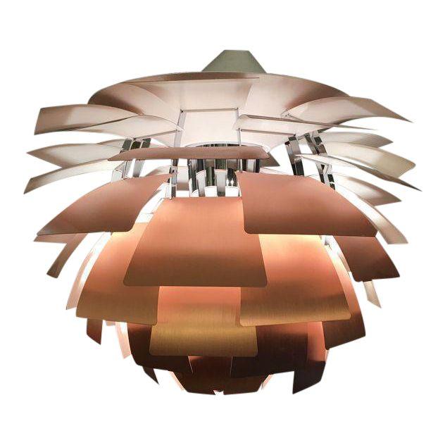 Design Plus Consignment Gallery has a Extra Large P.H. Artichoke Pendant Light was designed in 1958 by Poul Henningsen for the Langelinie Pavillonen restaurant in Copenhagen, where it still hangs today. PH Artichoke has a world–famous unique sculptural aesthetic, and is viewed internationally as an iconic design. The fixture displays 72 leaves, positioned to provide totally glare–free light from any angle. The metal is a copper finish.