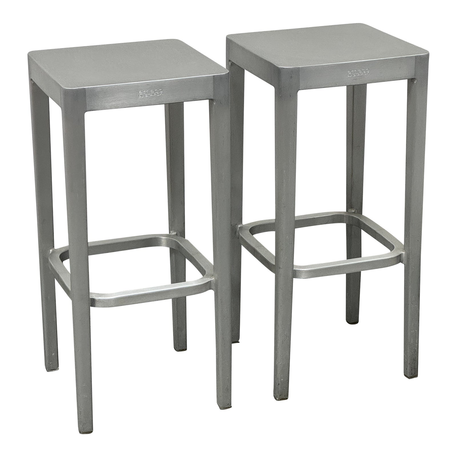 Design Plus Gallery presents a Pair of Emeco Barstools by Design Within Reach. Designed by Philippe Starck in 2001. The straightforward Emeco Stool is crafted using the same 77-step process that Emeco perfected to satisfy the military’s need for lightweight, corrosion-resistant chairs for submarines during WWII. The company’s proprietary metal processing method yields aluminum three times stronger than steel and a stool so durable that it has an estimated life span of 150 years. Stool with brushed finish suitable for outdoor use. In good condition, visible and minor wear.