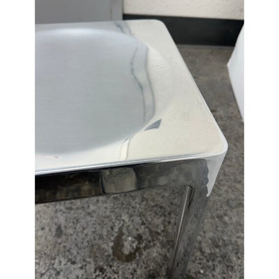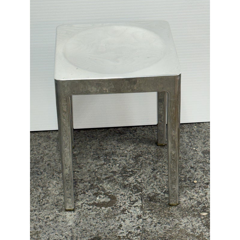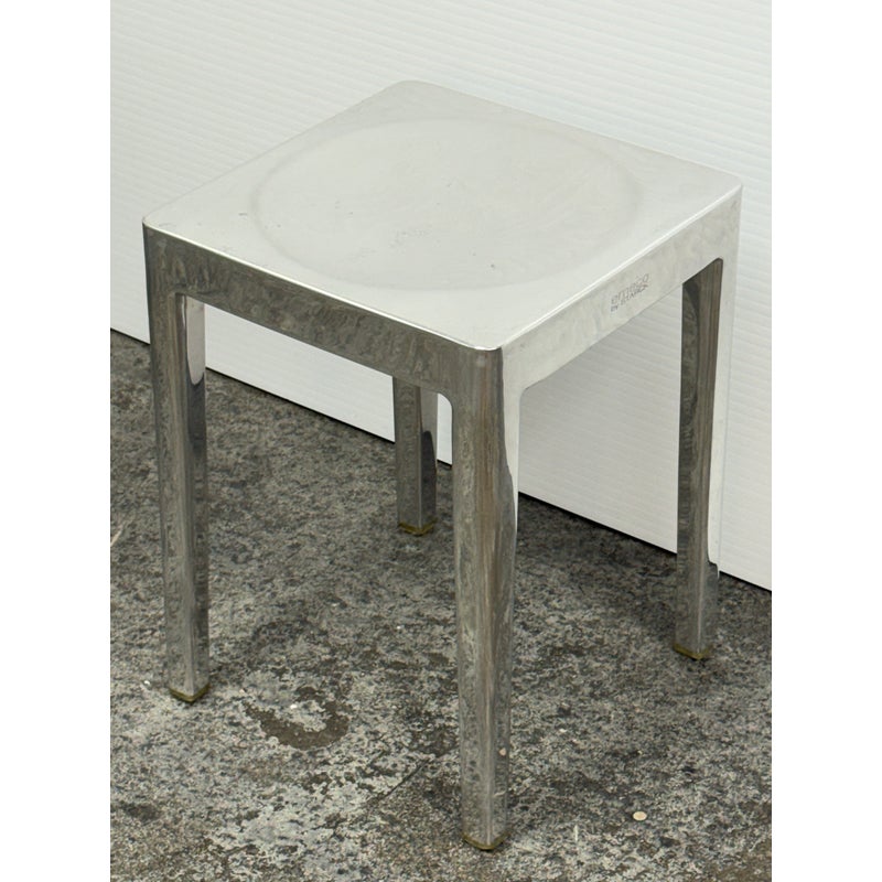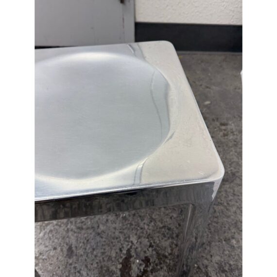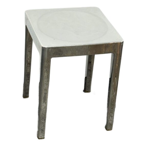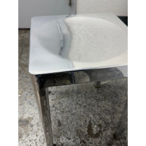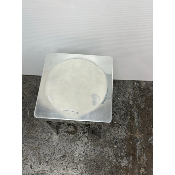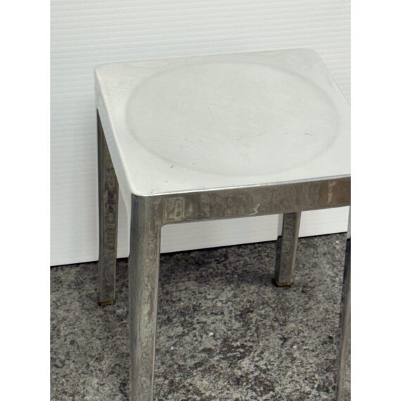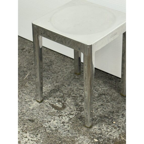 Design Plus Gallery presents the Emeco Stool by Philippe Starck for Emeco. The stool seamlessly blends sleek, modern style with everyday comfort, resulting in a timeless contemporary furniture piece. Crafted using Emeco’s legendary 77-step manufacturing process, originally developed during WWII to meet the U.S. Navy’s demand for lightweight, corrosion-resistant seating. the stool is made from proprietary aluminum that is three times stronger than steel and engineered to last an estimated 150 years. The distinctive “circle in a square” design was created by Starck at the request of the Museum of Modern Art for its Mies van der Rohe in Berlin retrospective, further cementing the stool’s place in modern design history. Durable, lightweight, and easy to clean, the Emeco Stool is both highly functional and visually refined, making it a lasting favorite in any interior. In good condition, visible patina and minimal wear form usage. Made in USA.