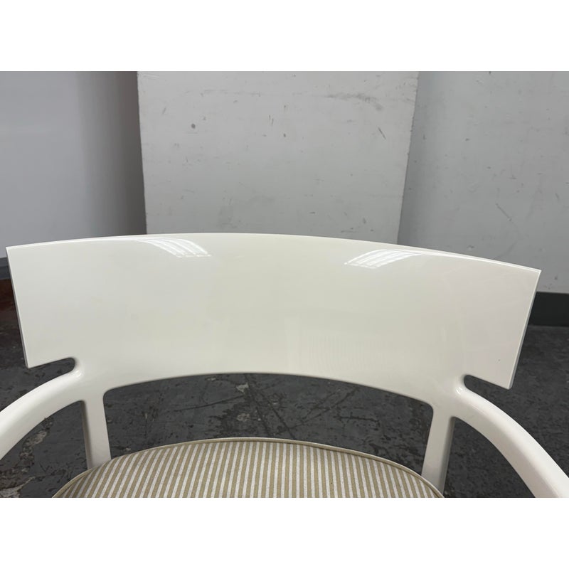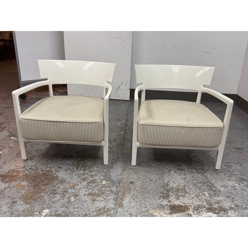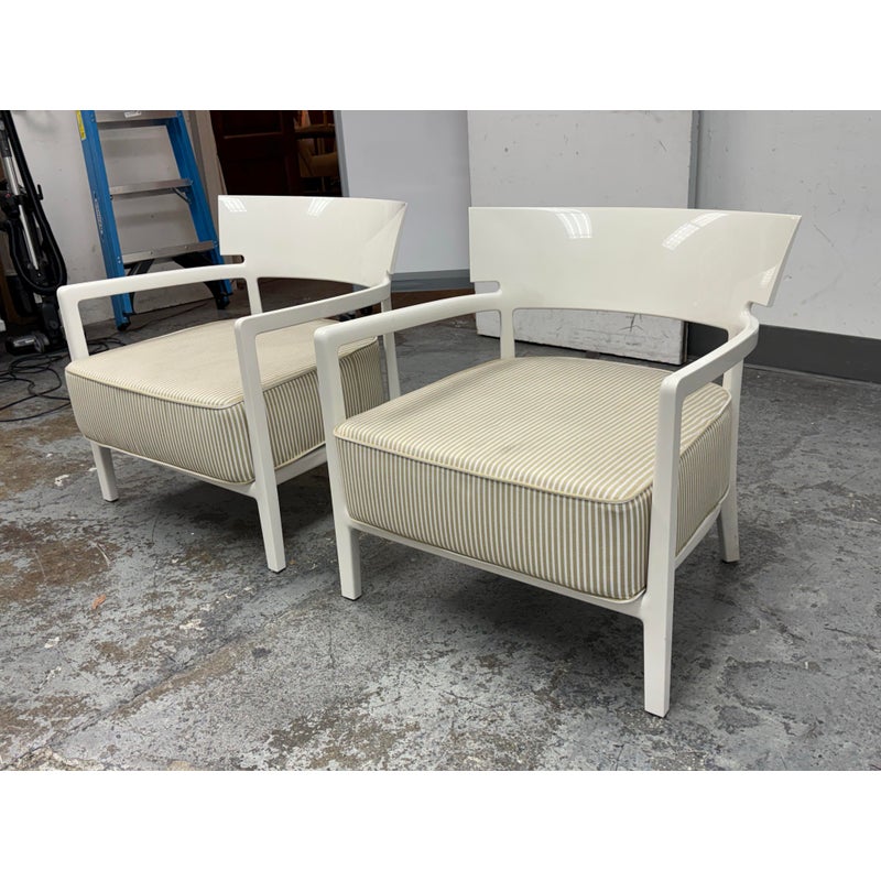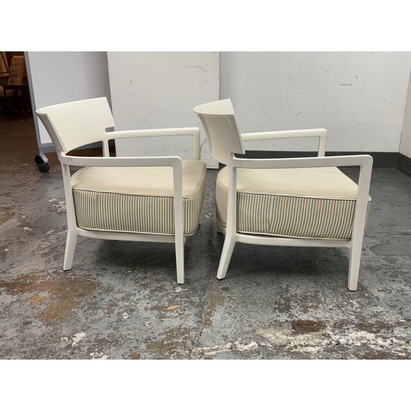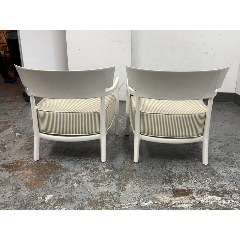 Design Plus Gallery presents a Pair of Cara Outdoor Lounge Chairs by Philipe Starck for Kartell Outdoor. The Cara chair has classically rigorous lines surrounding a comfortable seat. The perfect combination of formalism and technical innovation. They are in their white batch dyed polycarbonate with beige/ivory striped seat pad. They show visible wear to the fabric that is consistent with usage but overall considered to be in good condition.