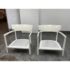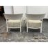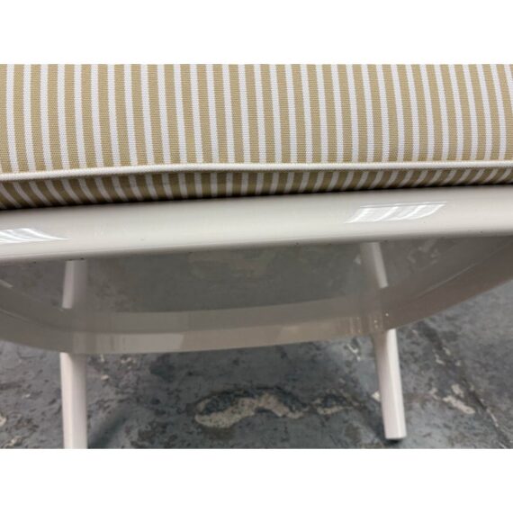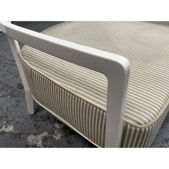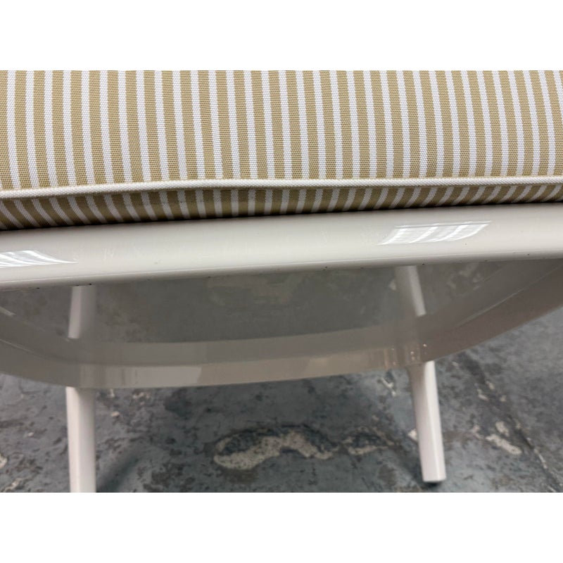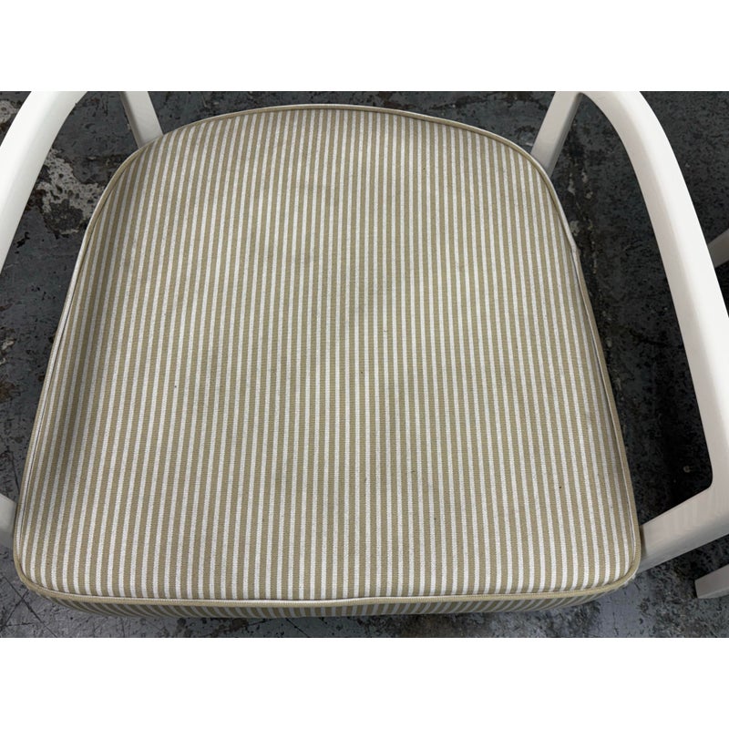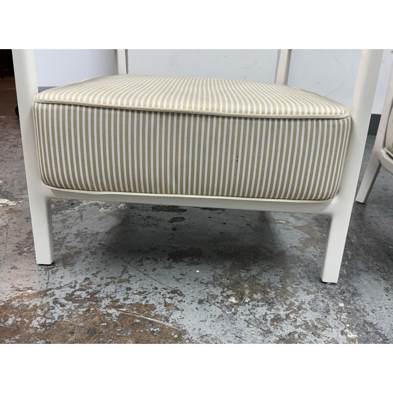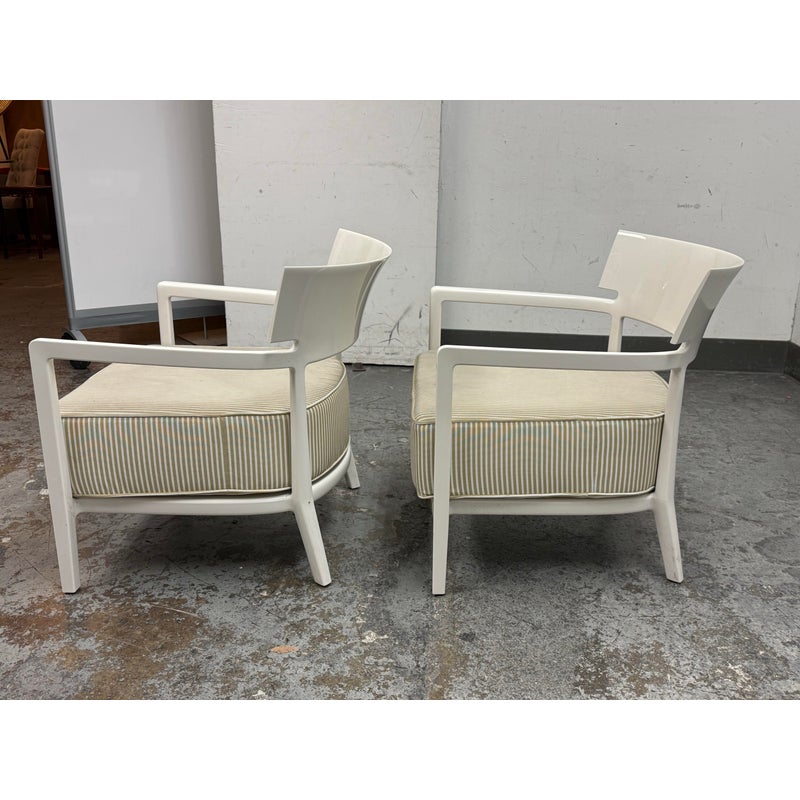 Design Plus Gallery presents a Pair of Cara Outdoor Lounge Chairs by Philipe Starck for Kartell Outdoor. The Cara chair has classically rigorous lines surrounding a comfortable seat. The perfect combination of formalism and technical innovation. They are in their white batch dyed polycarbonate with beige/ivory striped seat pad. They show visible wear to the fabric that is consistent with usage but overall considered to be in good condition.