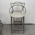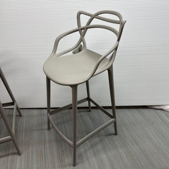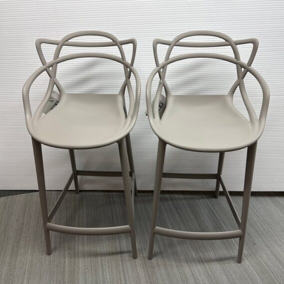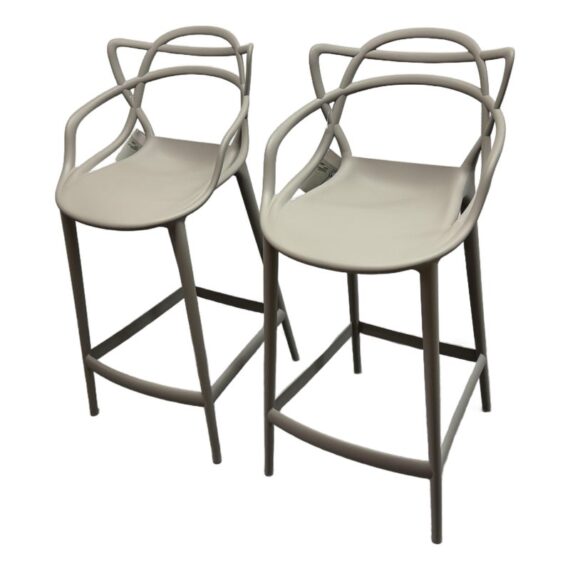 Design Plus Gallery presents a Pair of Masters Stools by Phillippe Starck for Kartell. The pair of stools were new, out of boxed in their color way #5 Gray. The Kartell Masters Stool was created to pay the same tribute to the Series 7 Chair by Arne Jacobsen, the Tulip Armchair by Eero Saarinen and the Eiffel Chair by Charles Eames. This version puts these signature designs on an even higher pedestal, having been adapted to suit bar and counter height installations. Both the stools are in good showroom like condition with minimal visible wear for their usage. Made in Italy.