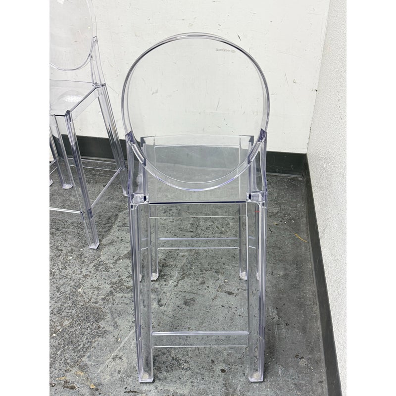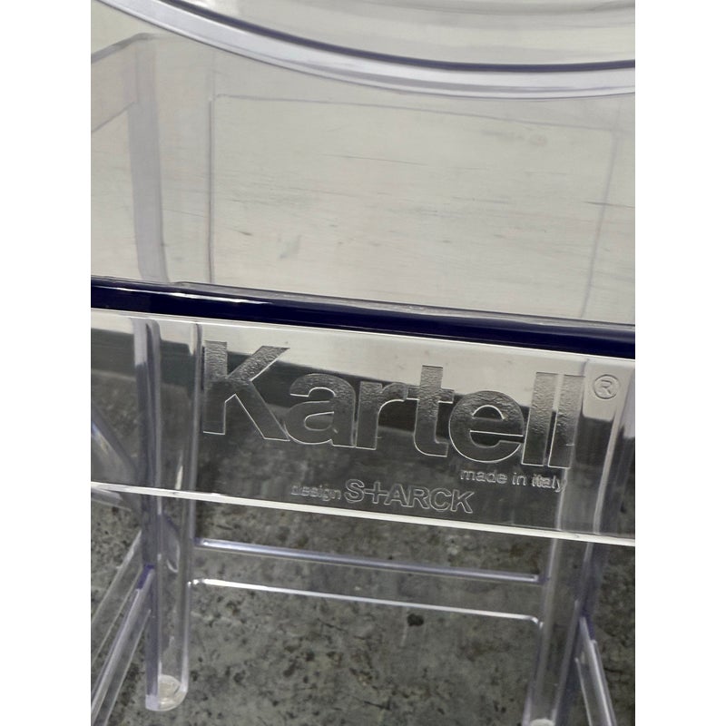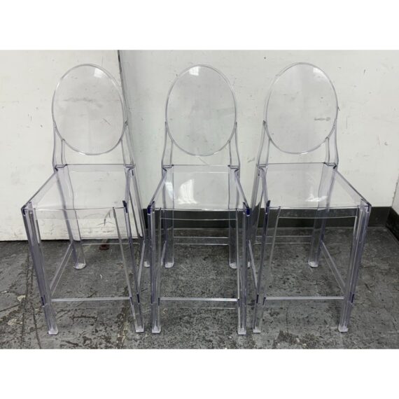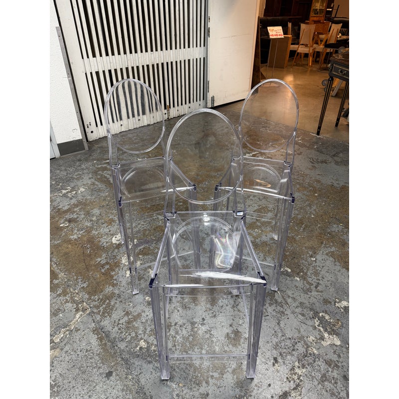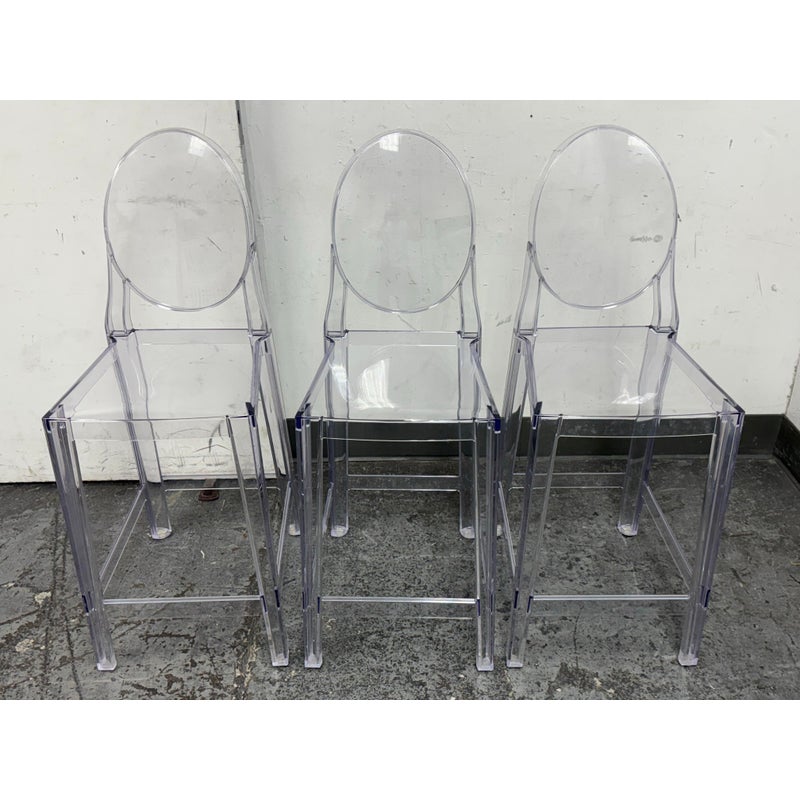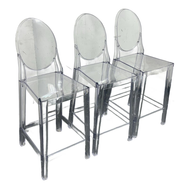 Design Plus Gallery presents a Set of Three One More Counter Stools from Kartell. These stools were designed by Philippe Starck in 2012. Kartell’s famous Ghost Collection family had consumers asking for “One More”. The results, Its tall, flexible oval back, chic footrest make your bar time even more relaxing. Made from polycarbonate and completely transparent, they will be the invisible to the eye. In good condition, visible and minimal scratches form usage.