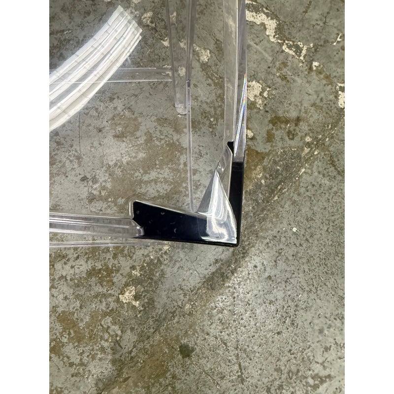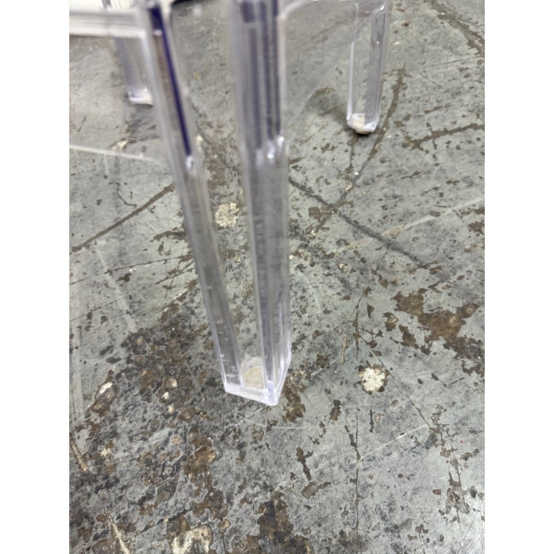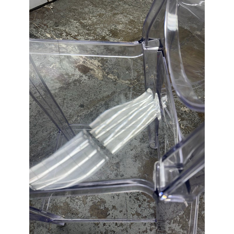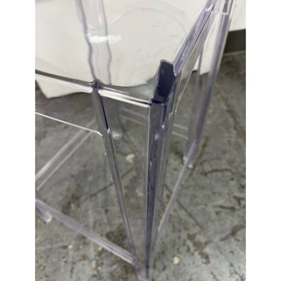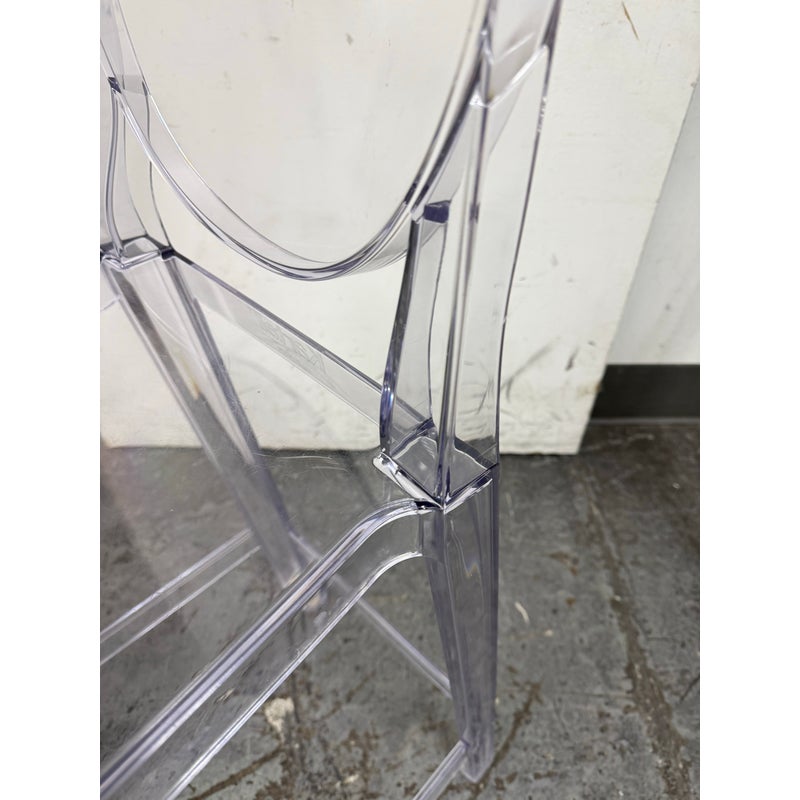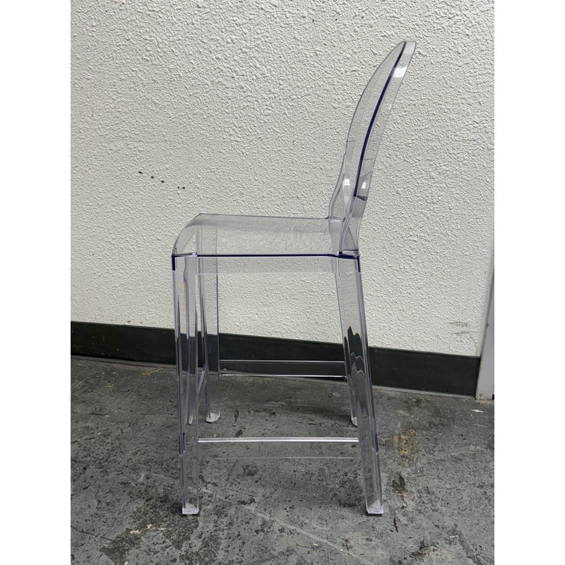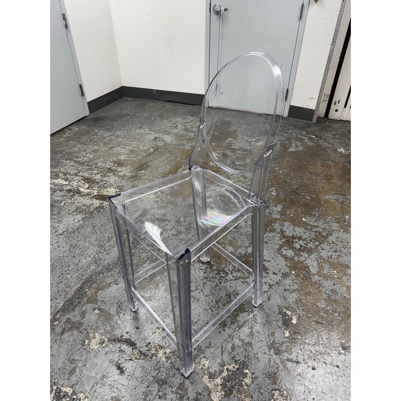 Design Plus Gallery presents a Set of Three One More Counter Stools from Kartell. These stools were designed by Philippe Starck in 2012. Kartell’s famous Ghost Collection family had consumers asking for “One More”. The results, Its tall, flexible oval back, chic footrest make your bar time even more relaxing. Made from polycarbonate and completely transparent, they will be the invisible to the eye. In good condition, visible and minimal scratches form usage.