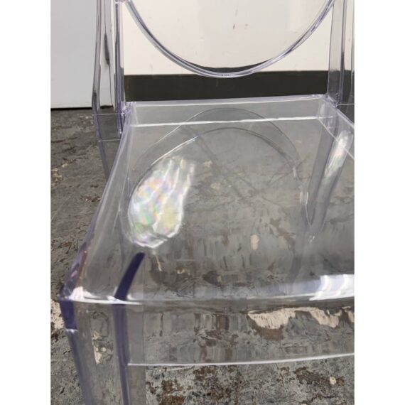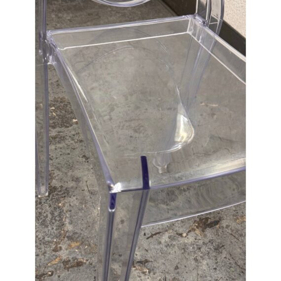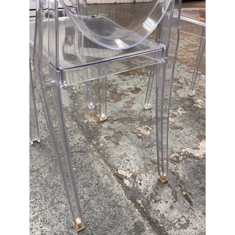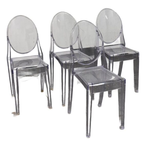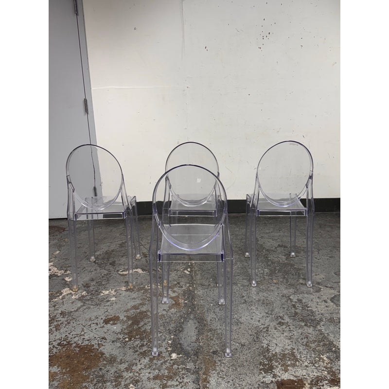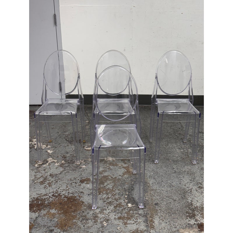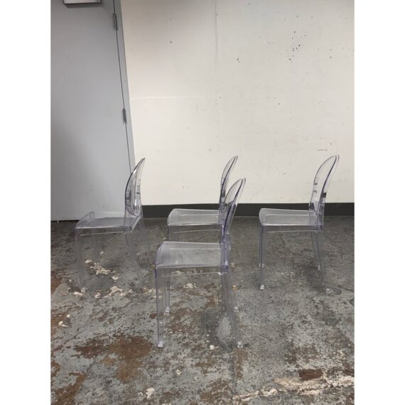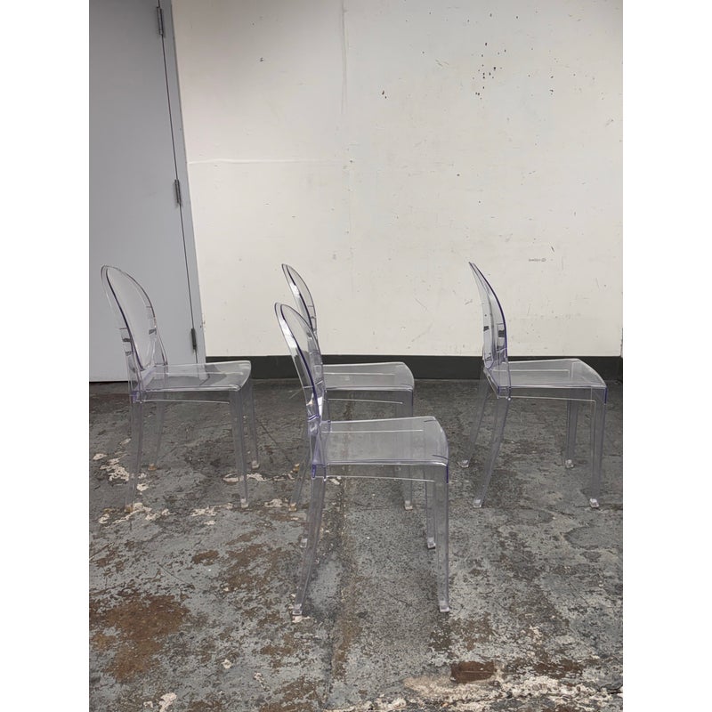 Design Plus Gallery presents a Set of Four Philippe Starck Style Ghost Side Chairs. These transparent side chairs are inspired by iconic contemporary design, blending a classic oval-back silhouette with modern materials. The clear construction allows them to visually disappear into a space without overwhelming surrounding décor. Lightweight yet sturdy, the chairs are stackable for convenient storage and flexible use, ideal for both residential and commercial interiors. In good condition, visible and minimal wear from usage.