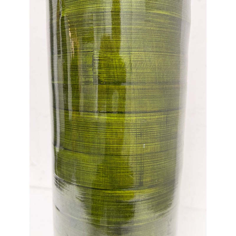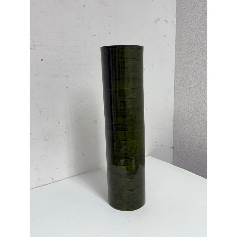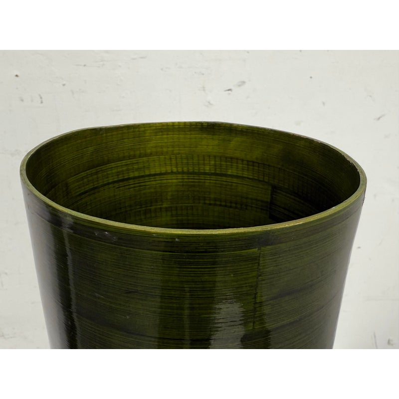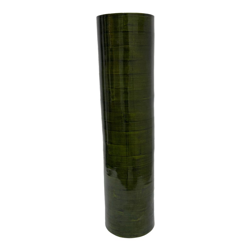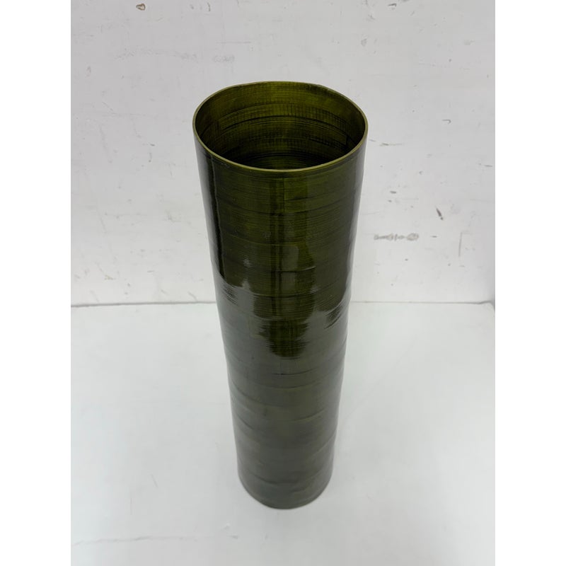 Design Plus Gallery presents a Tall Green Finish Bamboo Floor Vase. Crafted from natural bamboo, with a glossy green finish, and features a sleek, contemporary cylindrical shape. These vases are typically used for decorative purposes and can be displayed on their own or filled with dried branches, silk flowers, or tall wispy grass. Its tall design makes it suitable for placement in various rooms. In good condition, visible and minimal wear.
