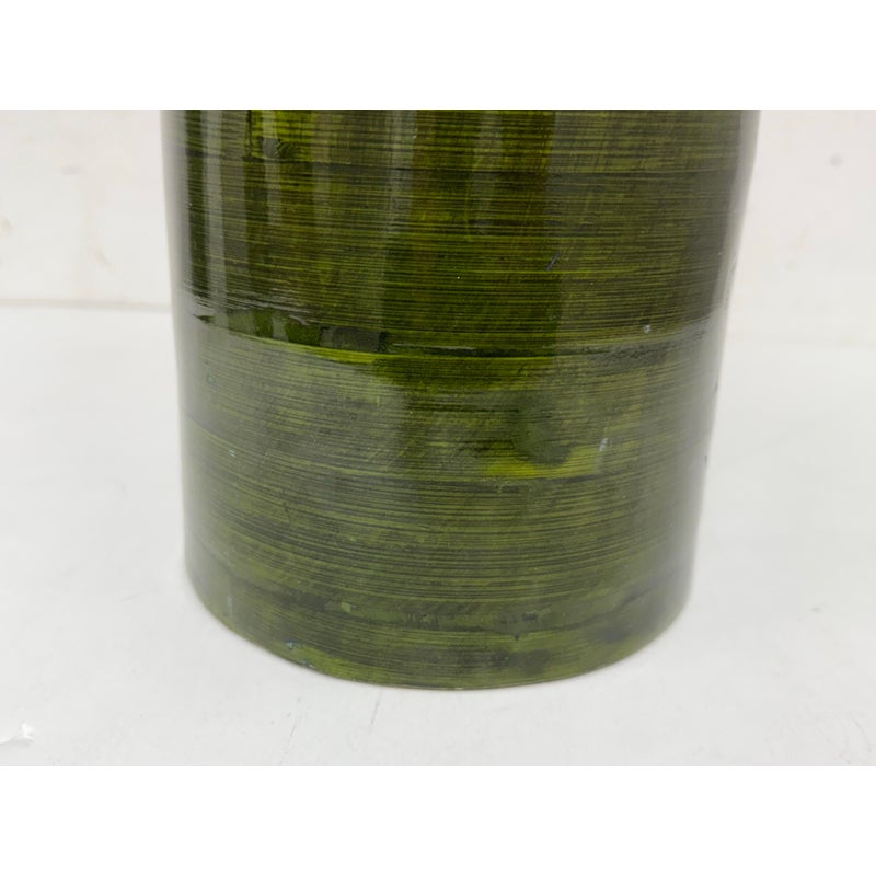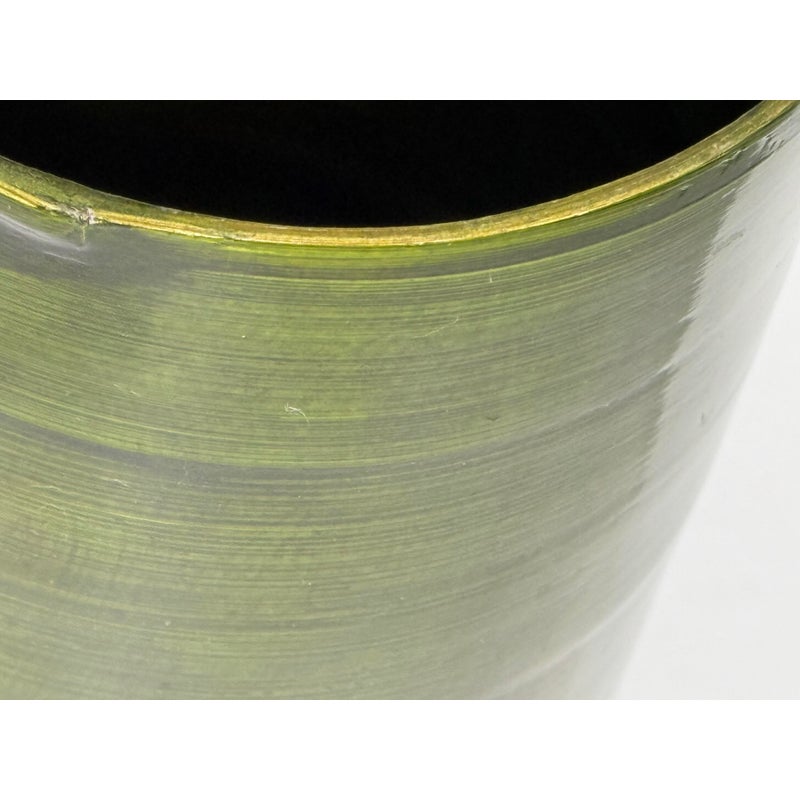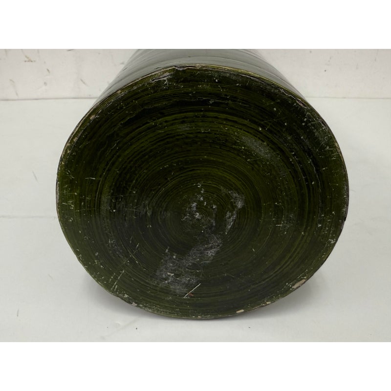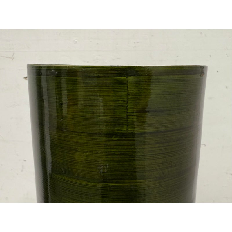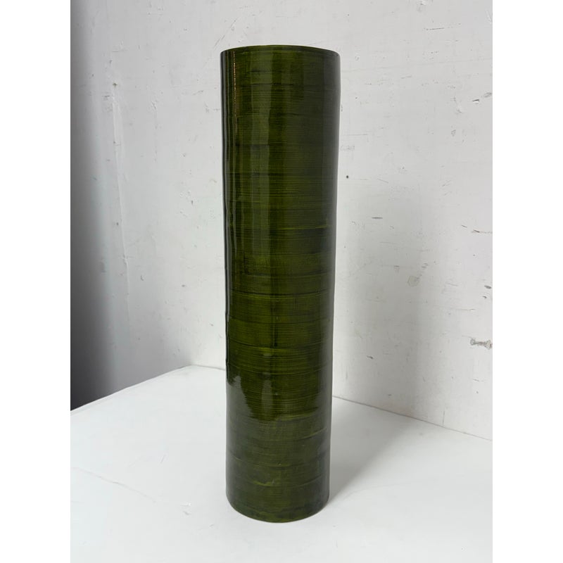 Design Plus Gallery presents a Tall Green Finish Bamboo Floor Vase. Crafted from natural bamboo, with a glossy green finish, and features a sleek, contemporary cylindrical shape. These vases are typically used for decorative purposes and can be displayed on their own or filled with dried branches, silk flowers, or tall wispy grass. Its tall design makes it suitable for placement in various rooms. In good condition, visible and minimal wear.