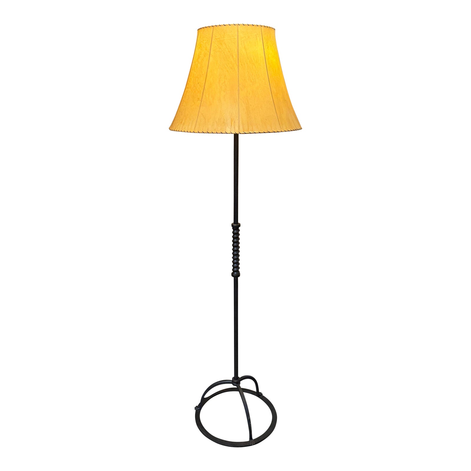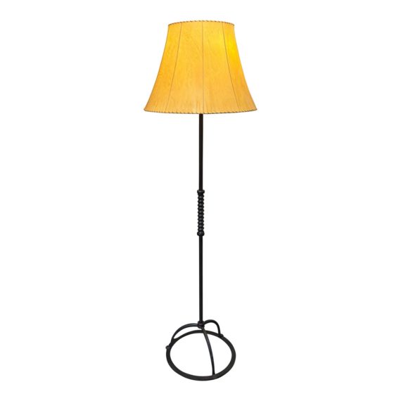 Design Plus Gallery presents the Ahwahnee Floor Lamp by Phoenix Day. Hand forged and twisted into a rustic but elegant statement piece, this light was designed for the Yosemite legendary lodge. Two 75 watt light cluster has pull chains; tapered shade is natural calf skin. Little evidence of wear; condition is good for age and use. Made in the USA