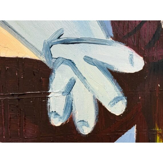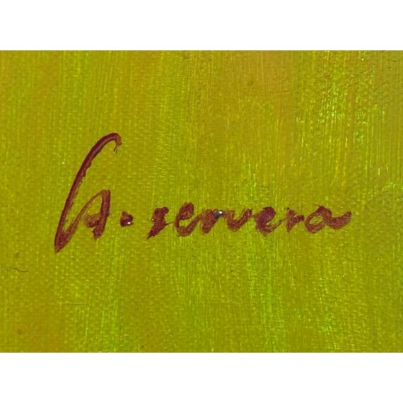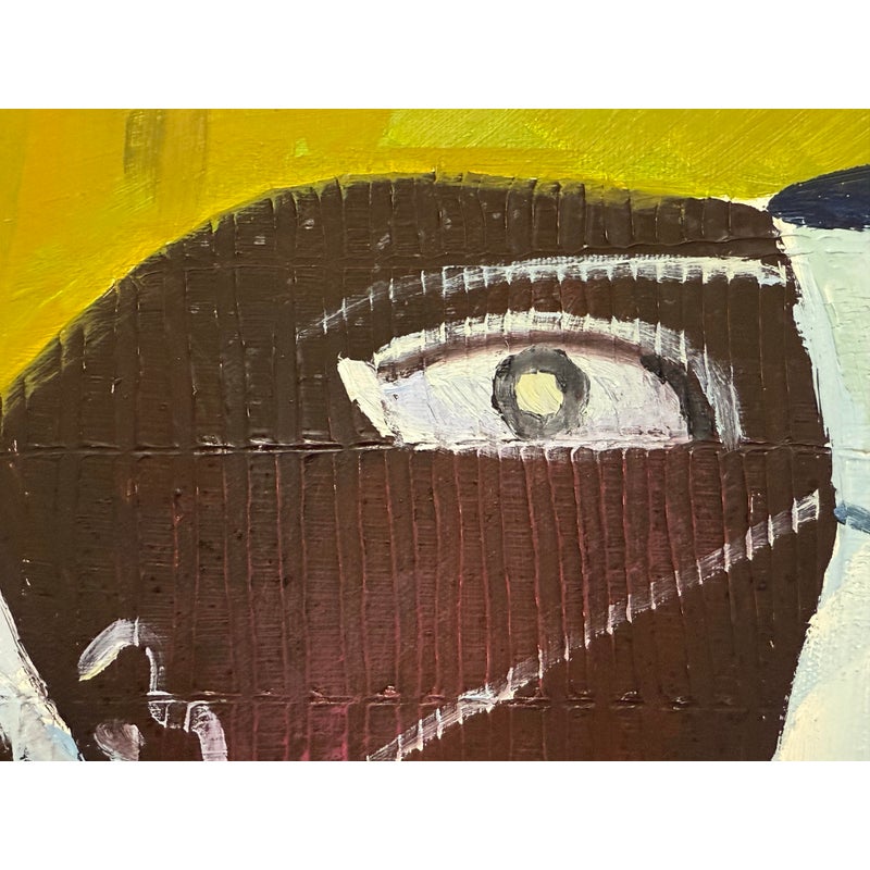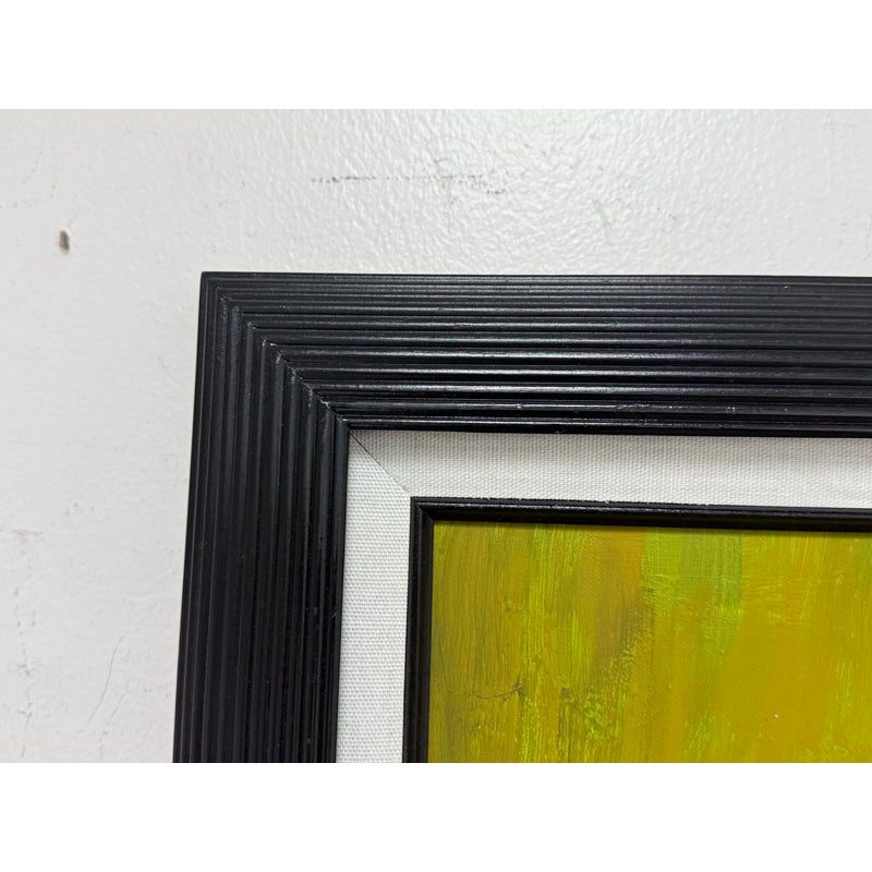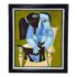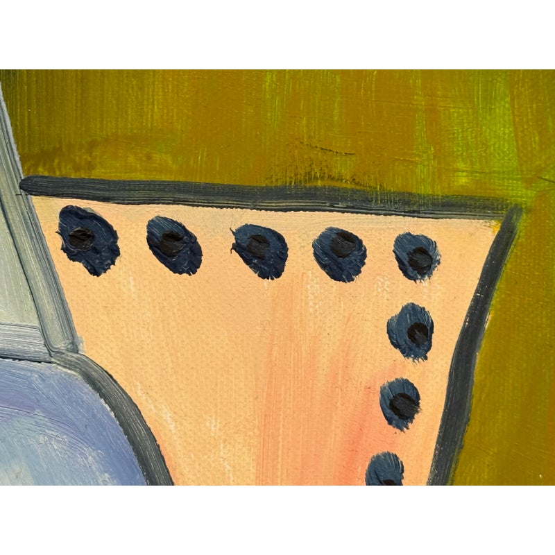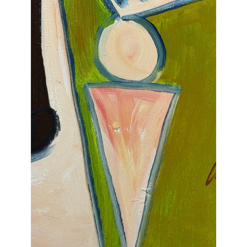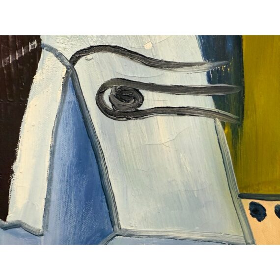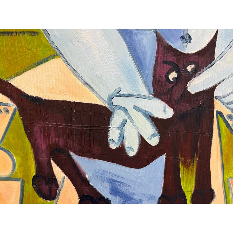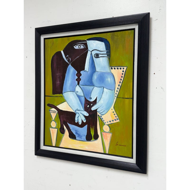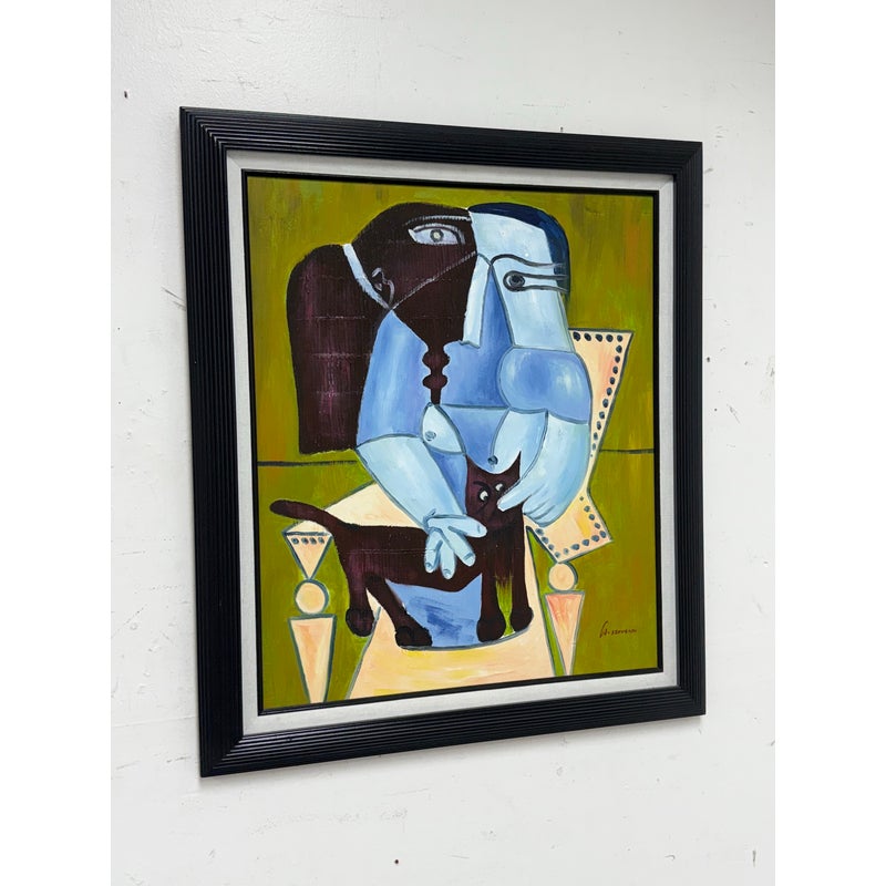 Design Plus Gallery presents a painting in homage to Picasso’s portrait of his first wife Olga. “Woman Sitting on a Cat”, in a Cubist style features framgemented and geometric forms in rich hues a bit more dynamic than the muted hues of the original. The painting is over a print. Simply framed in black wood. Light wear; condition is consistent with age and use.