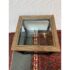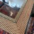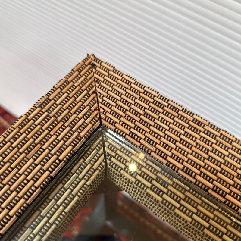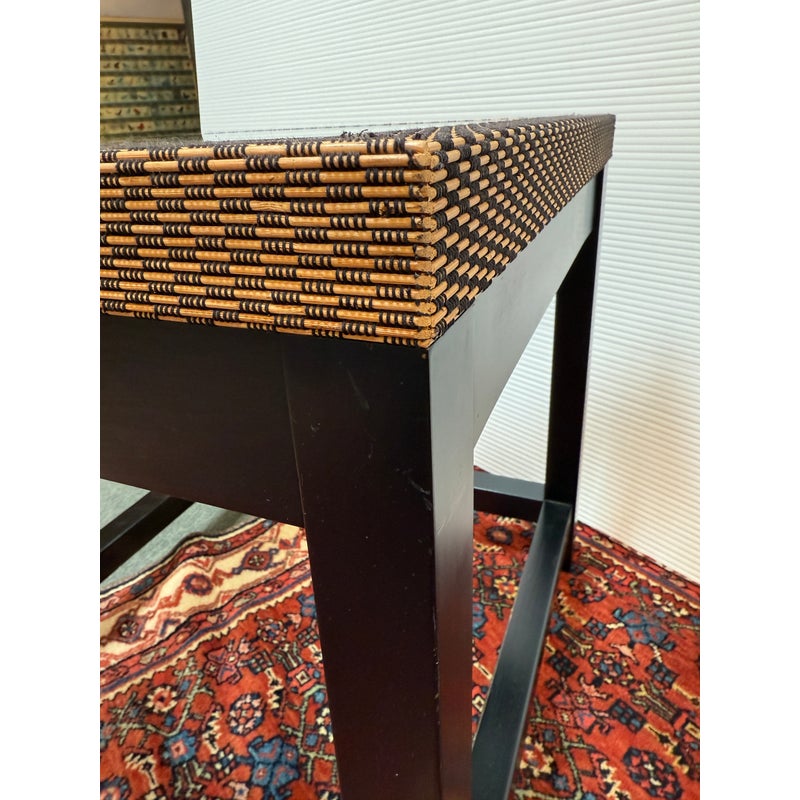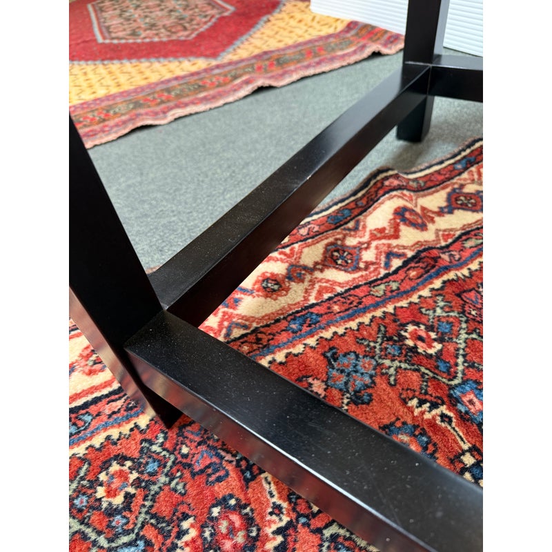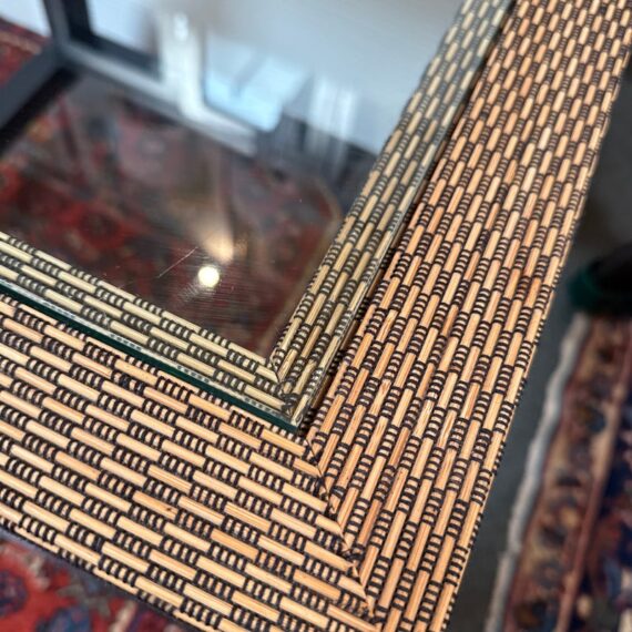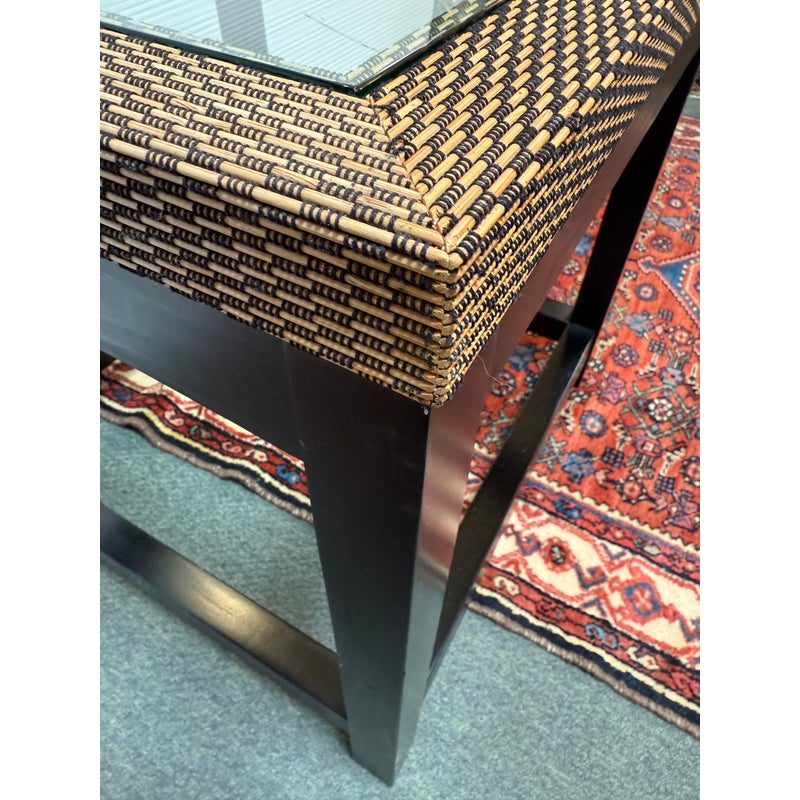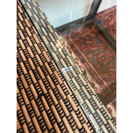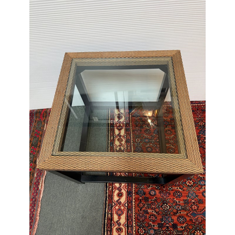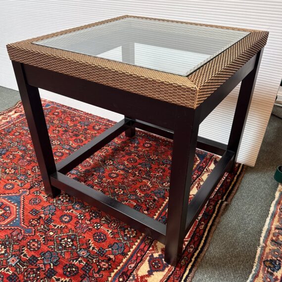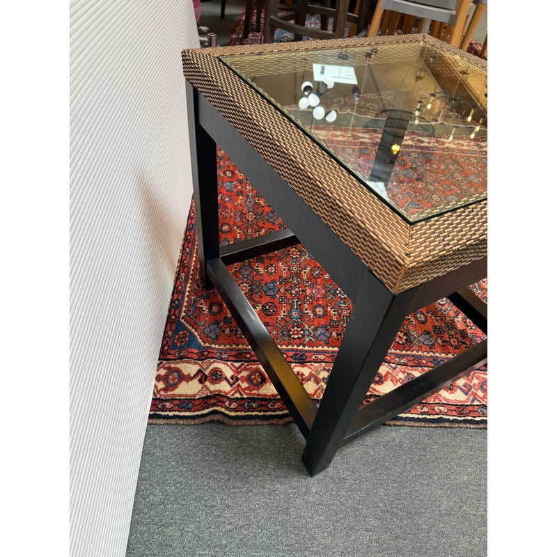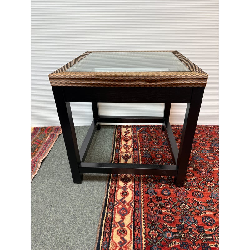 Design Plus Gallery presents a Side Table from Pier 1. The table has an espresso finish wood frame with an African inspirited trim around the upper perimeter. This thick trim is of wood piece in tan and black, repeating themselves on multiple layers. The texture is unique and feels great. It holds the glass in place. The table is in good condition and no longer in production with the brand.