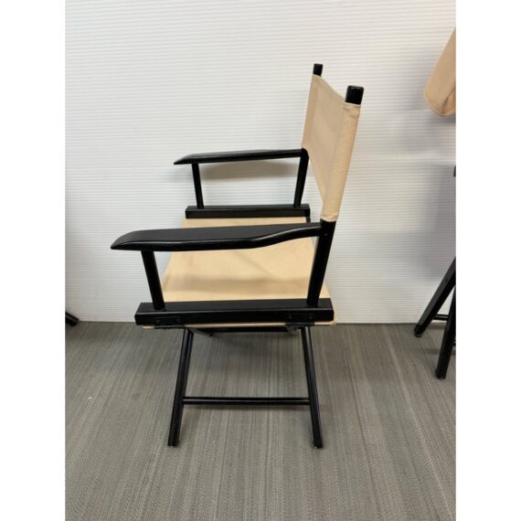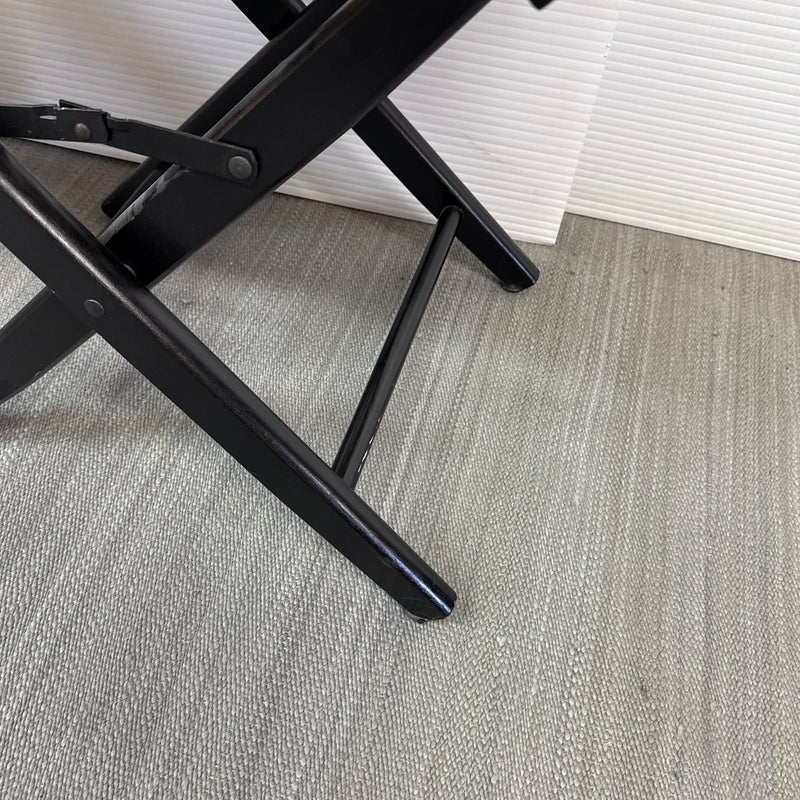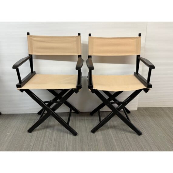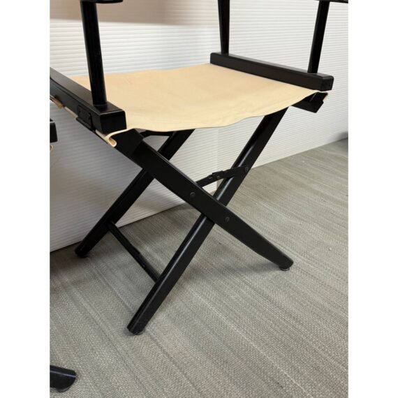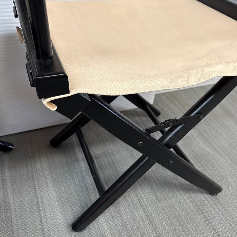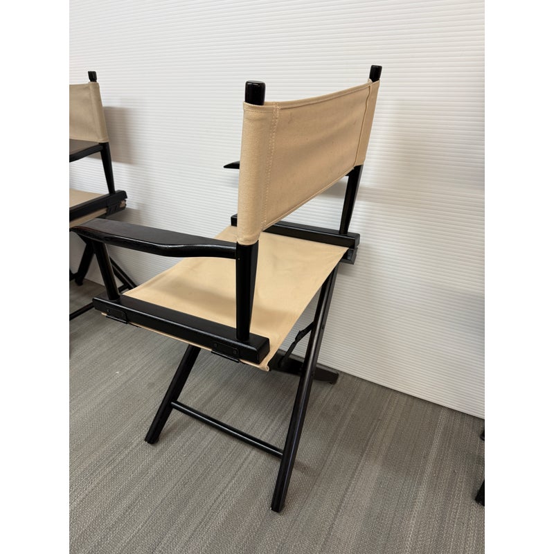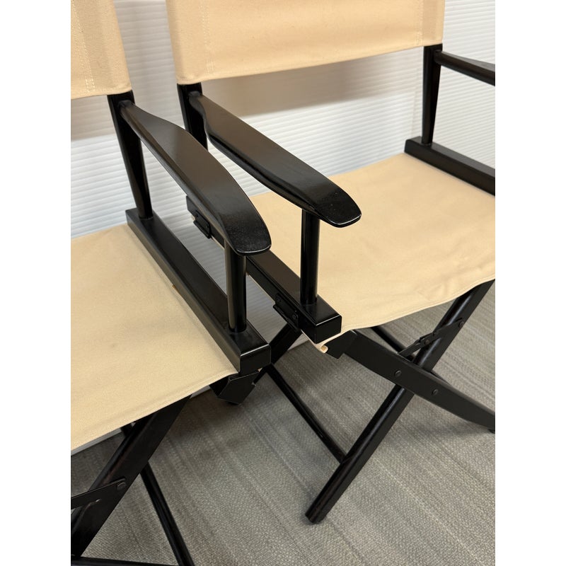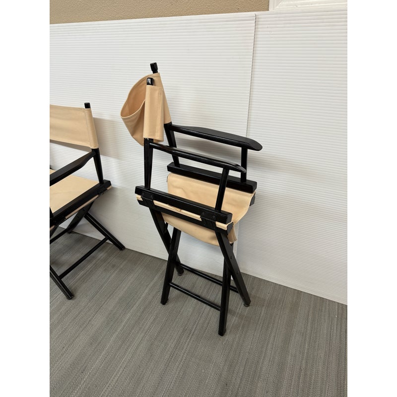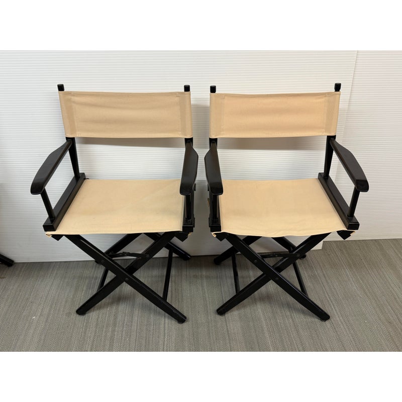 Design Plus gather presents a Pair of Folding Directors Chairs from Pier One Imports. Timeless chairs with an all black finish to its folding frame and two cloth pieces that are attached to the edges of the seat back and seat rest. they simply fold away for easy storage and you can take them anywhere you need to go. They are both in good condition with wear that is consistent with their usage.
