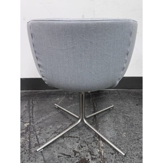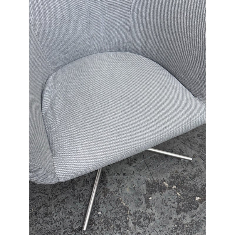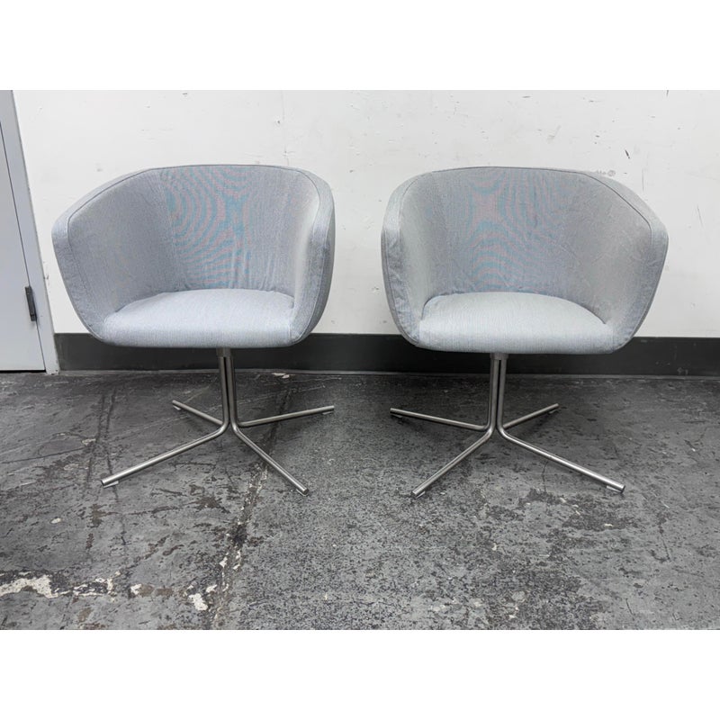 Design Plus Gallery presents a Pair of Mini Jelly Chairs by Living Divani Designed by a Piero Lissoni in 2013. A small armchair with one-piece frame with steel insert and flexible, cold-expanded polyurethane foam padding and seat padded with polyurethane foam. Covering in needle punched, resinated, non-woven polyester fibre, bonded onto a polyamide velveeten backing. Swiveling base in shiny chromed finish steel. The fabric is a slipcover. The chair has visible and minor wear that is consistent with usage. Made in Italy.
