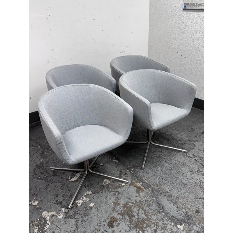 Design Plus Gallery presents a Set of Four Mini Jelly Chairs by Living Divani Designed by a Piero Lissoni in 2013. A small armchair with one-piece frame with steel insert and flexible, cold-expanded polyurethane foam padding and seat padded with polyurethane foam. Covering in needle punched, resinated, non-woven polyester fibre, bonded onto a polyamide velveeten backing. Swiveling base in shiny chromed finish steel. The fabric is a slipcover. The chairs has visible and minor wear that is consistent with usage. Made in Italy.