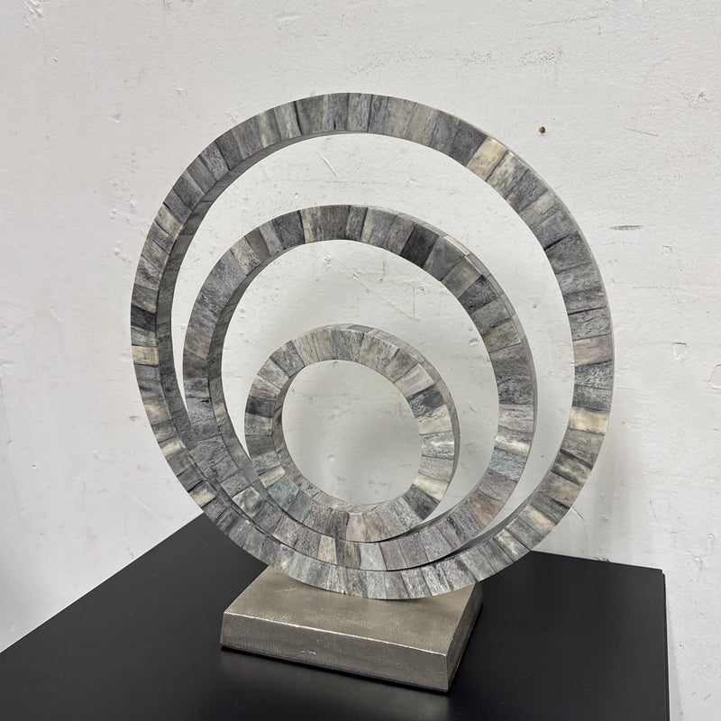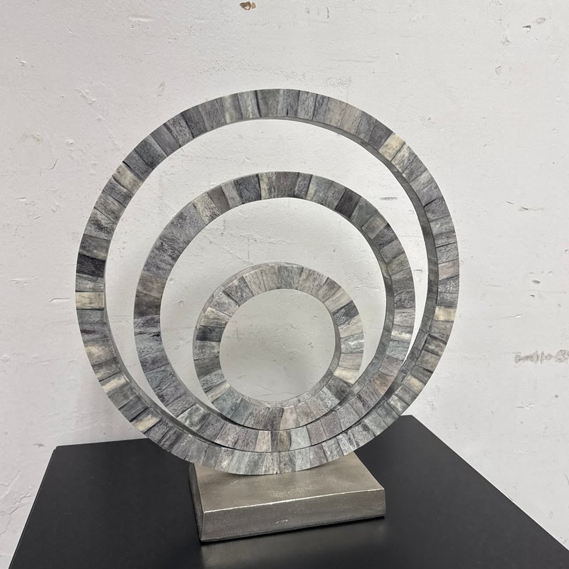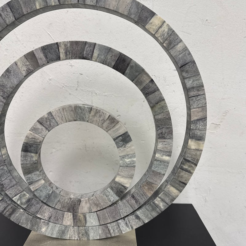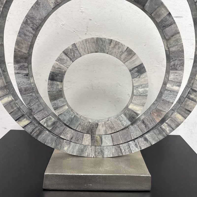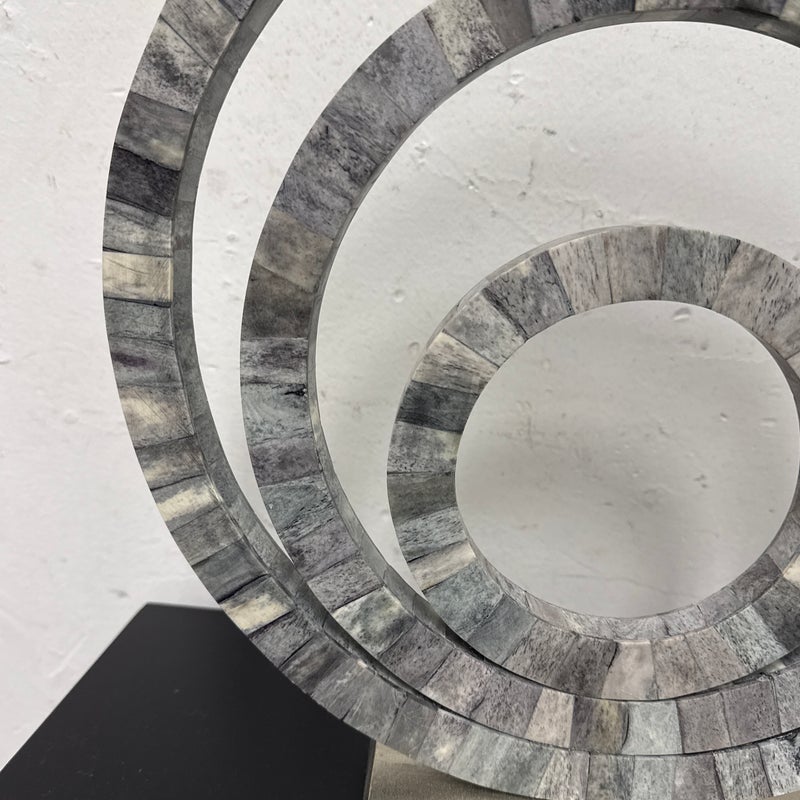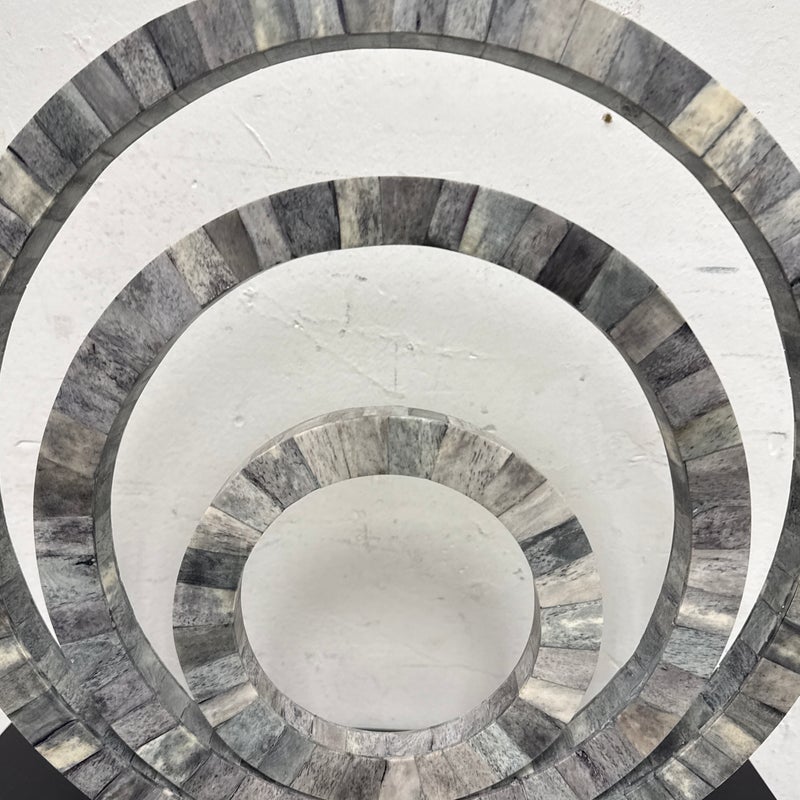 Design Plus Gallery presents an Inlaid Bone Sculpture from Pierz. The metal stand holds three rings of staggering size held onto each other, each touching the base. The rings are steel with bone tile inlays giving this a textually appealing item to add to your shelves for home decor. Is in good condition with minimal wear.