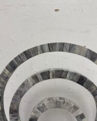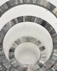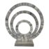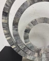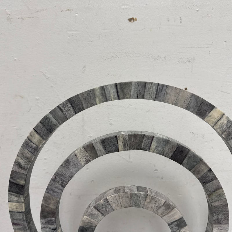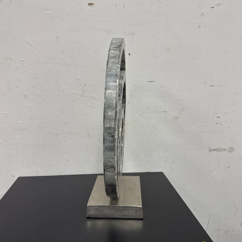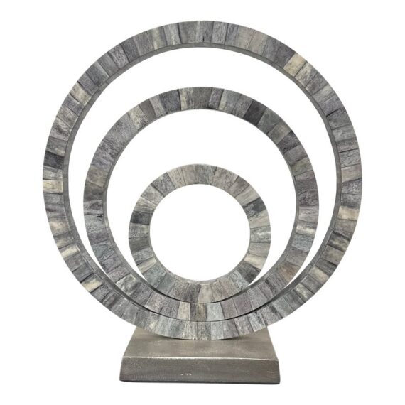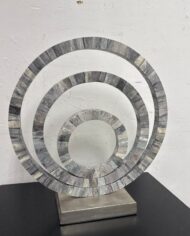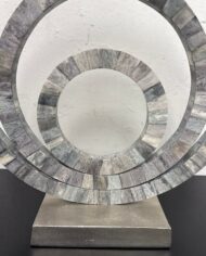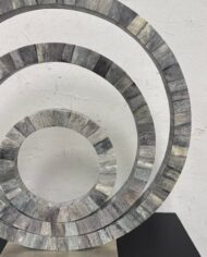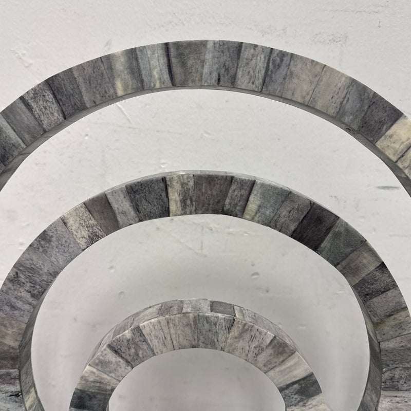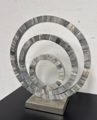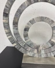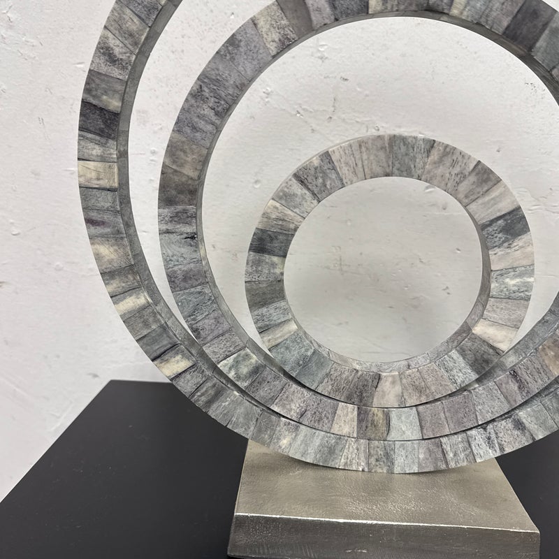 Design Plus Gallery presents an Inlaid Bone Sculpture from Pierz. The metal stand holds three rings of staggering size held onto each other, each touching the base. The rings are steel with bone tile inlays giving this a textually appealing item to add to your shelves for home decor. Is in good condition with minimal wear.