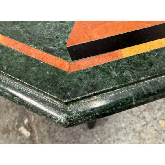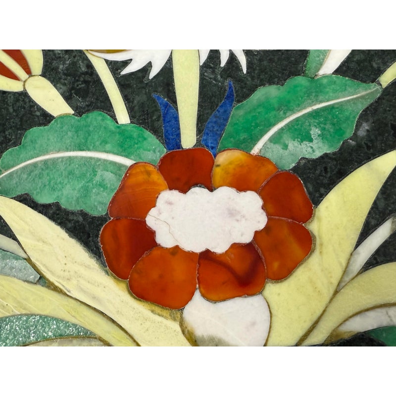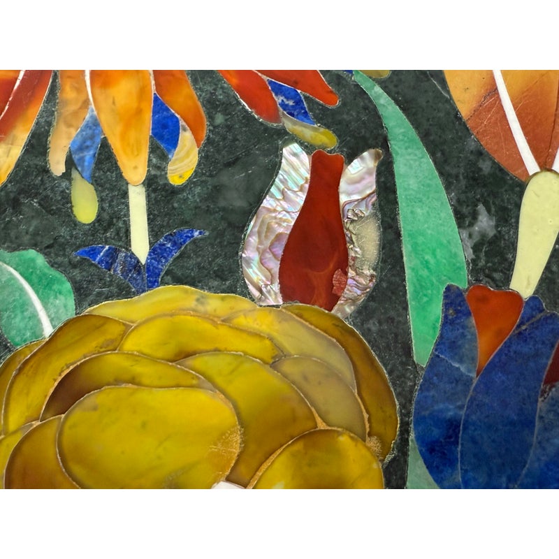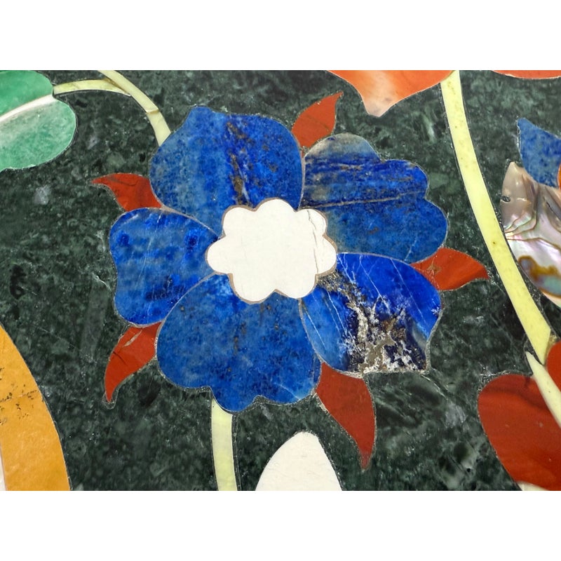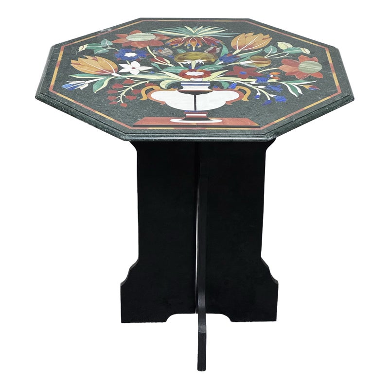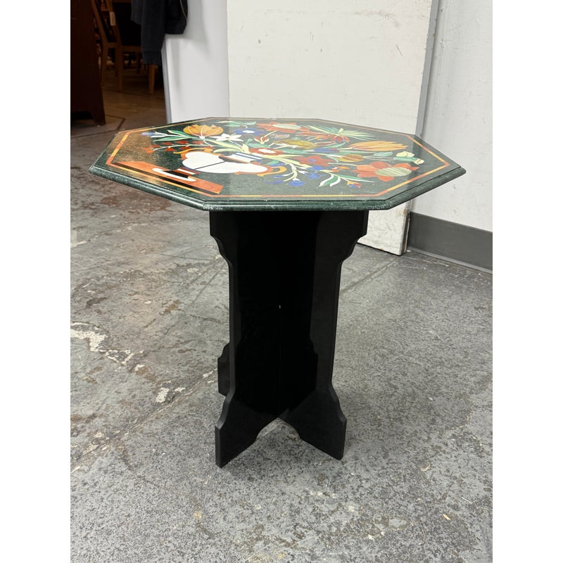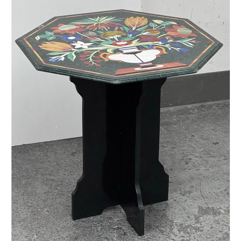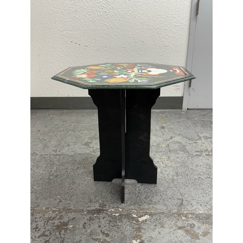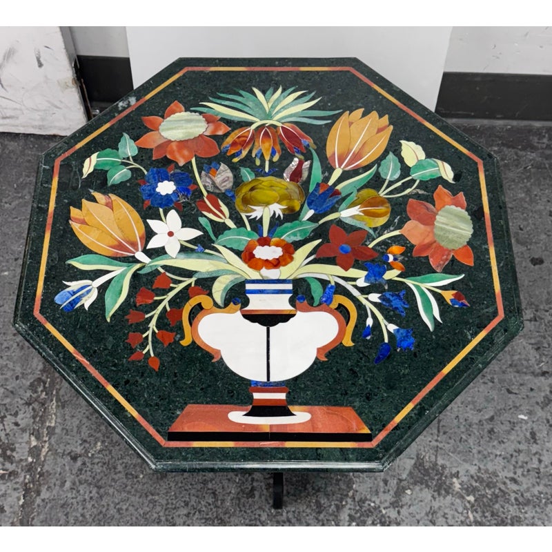 Design Plus Gallery presents a Green Marble Octagonal Side Table with Pietra Dura Flower Bouquet. Stunning work of intricate design and incredible detail of inlaid materials in colors found in: lapis lazuli, malachite, turquoise, mother of pearl, coral, jade and more. A sincerely welcoming table that will bring joy + glee into any room, or patio. Is in good condition for its age with noticeable crack to the black stone pedestal base that may need repair down the road.