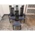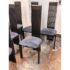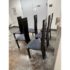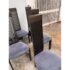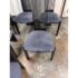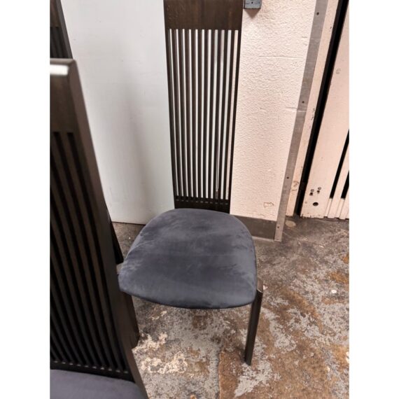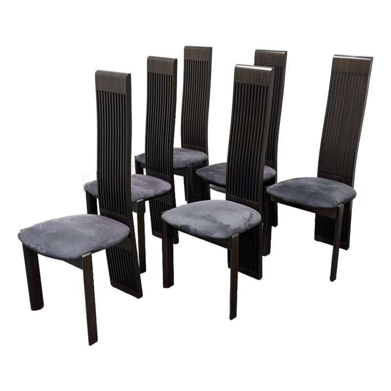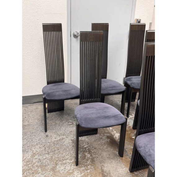 Design Plus Gallery presents a Set of Six Late 20th Century Italian dining chairs Costantini Pietro for Ello Furniture. Each chair shows the maker’s distinctive high back silhouette with narrow vertical slats, an ebonized wood frame, and a soft gray blue upholstered seat. The elongated proportions and disciplined lines give the set a strong architectural presence, while the upholstery adds visual contrast against the linear wood structure. Maker labels are present beneath the seats. This is a discontinued model with the brand and they are in good condition with visible and minimal wear from usage. Made in Italy.