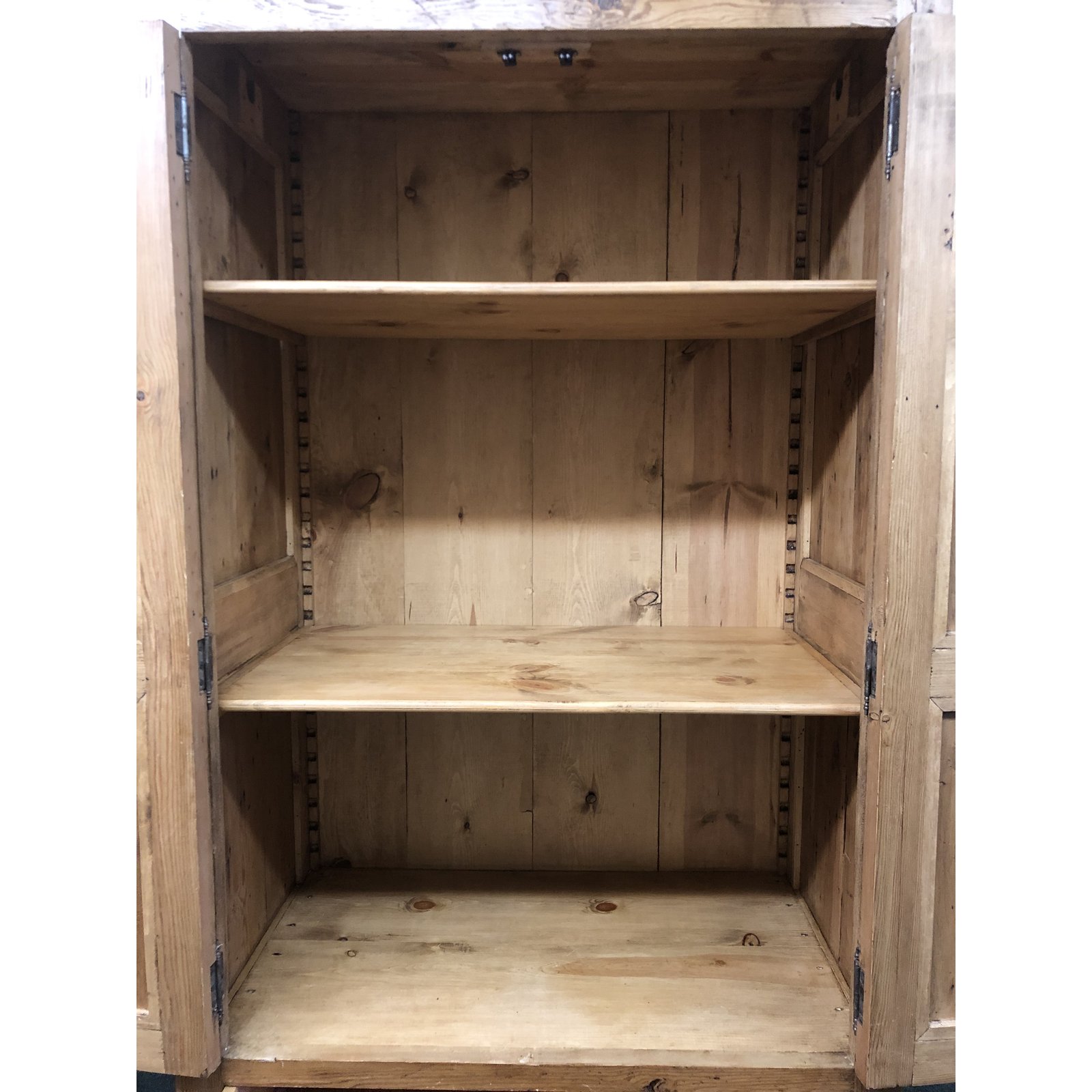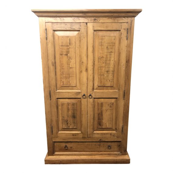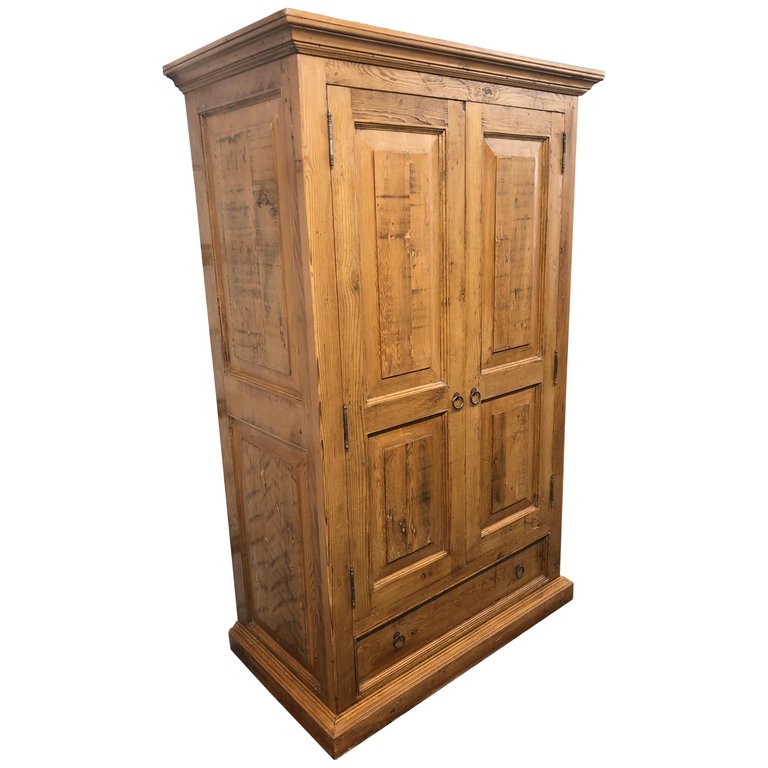 Design Plus Gallery presents an antique pine armoire. Charming with only the simplest of details, it offers a huge amount of storage on adjustable shelves and in lower drawer. Natural steel fittings.
