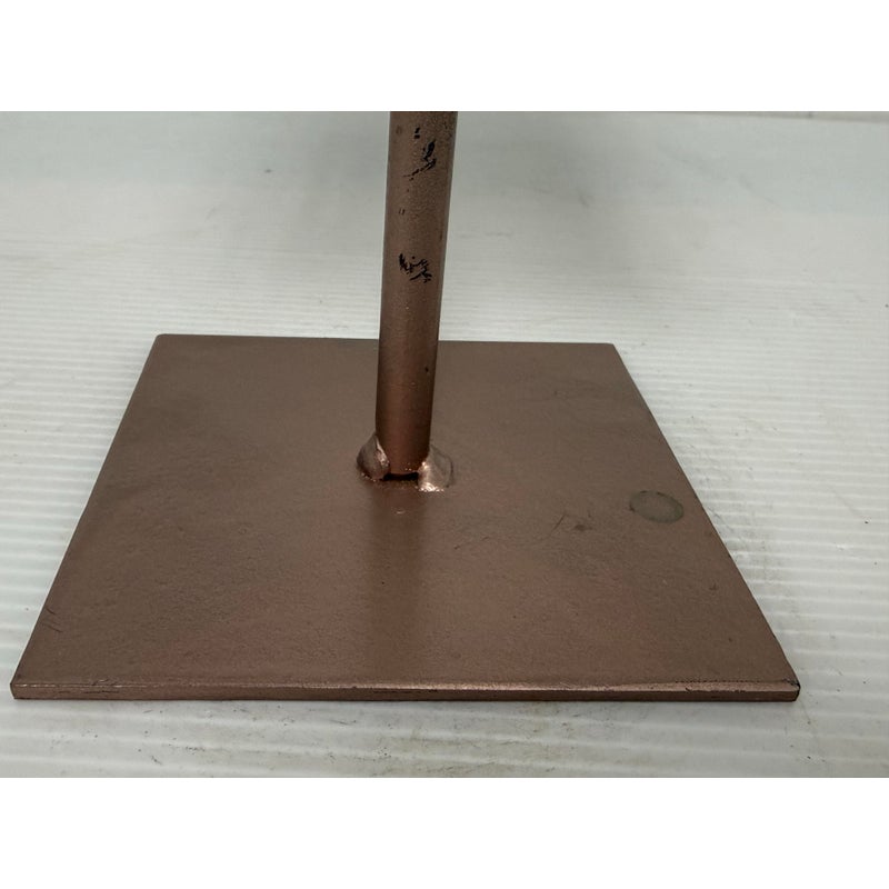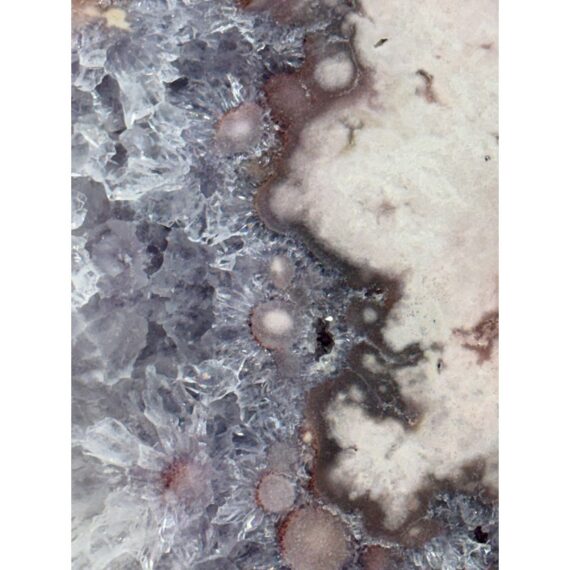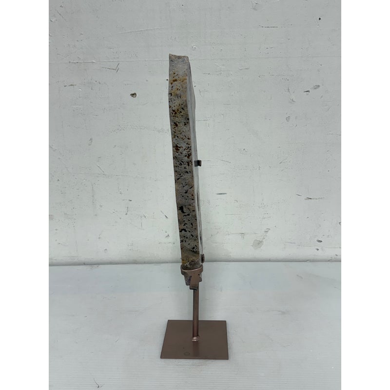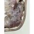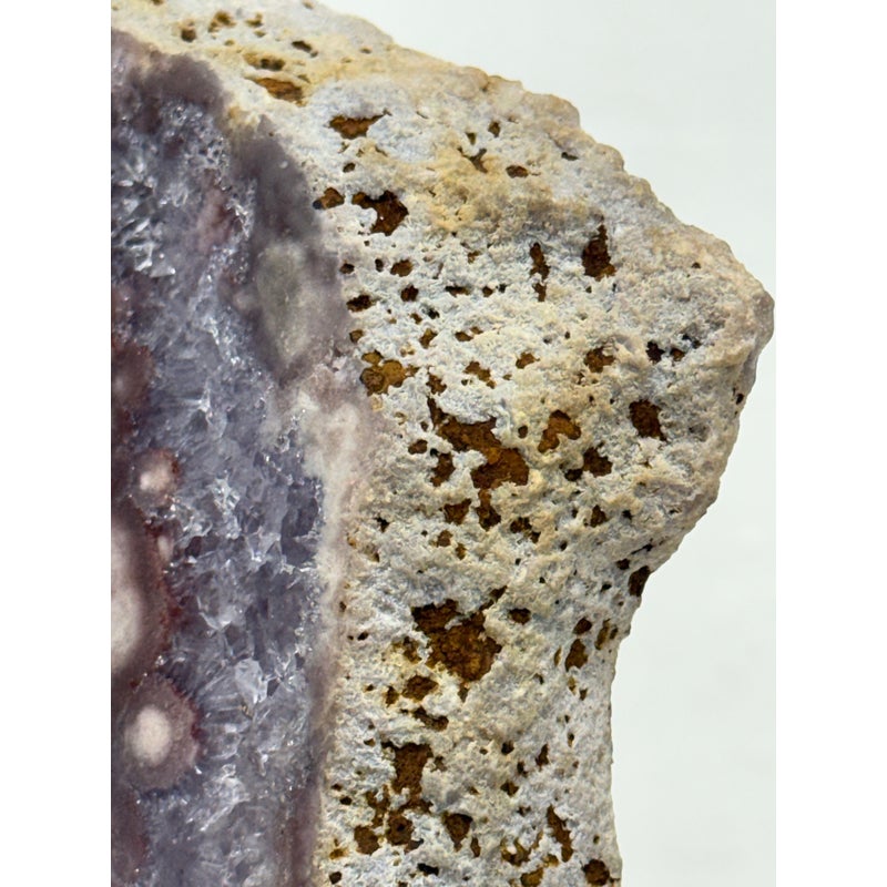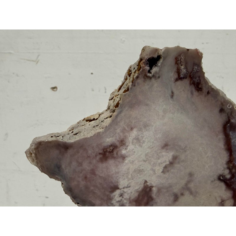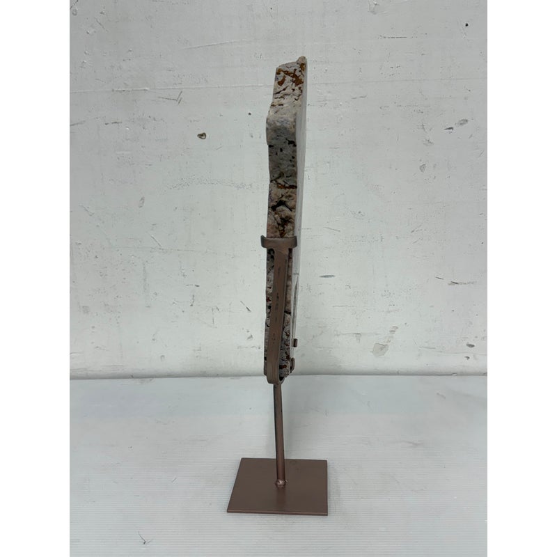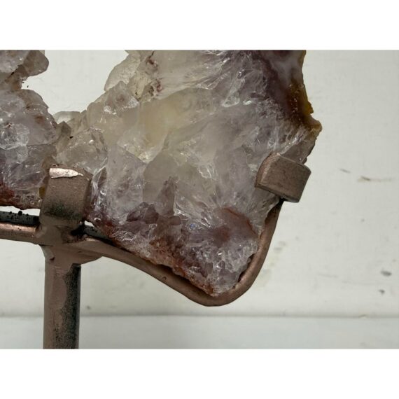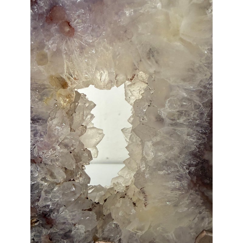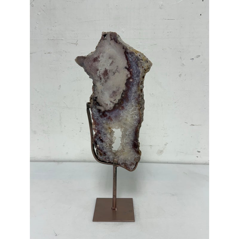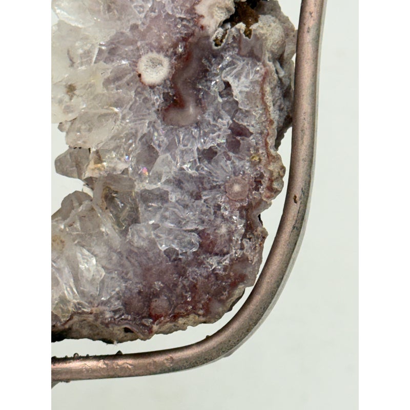 Design Plus Gallery presents a Pink Amethyst Geode Slice on Stand. This natural mineral formation is cut to reveal a crystalline interior with soft violet, white, and translucent tones, along with an open center framed by clustered crystal growth. The irregular organic silhouette is secured within a metal support and raised on a matching square base, giving the piece a sculptural presence that highlights the contrast between raw stone exterior and sparkling crystalline surfaces. It is in good condition with visible and minimal wear from usage.