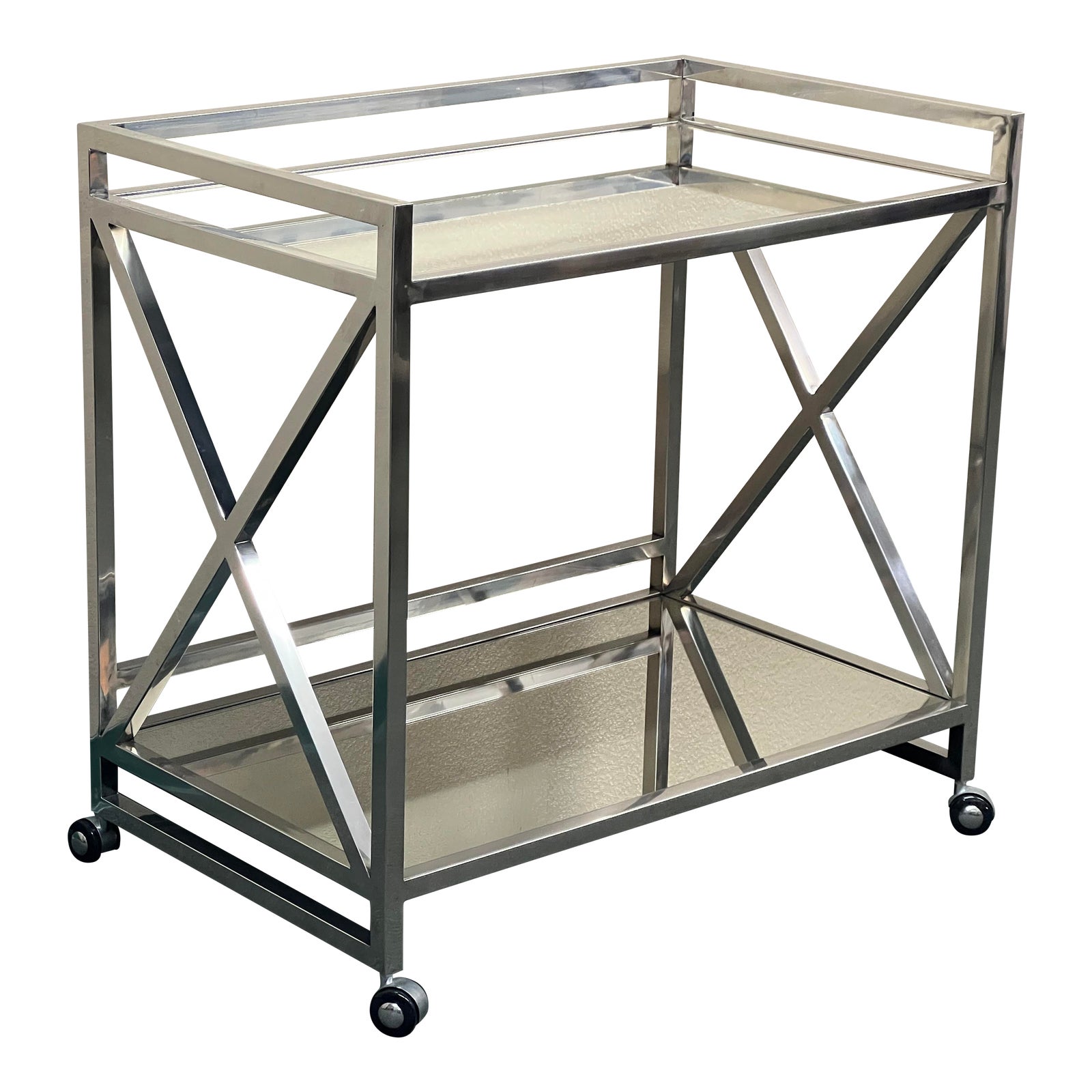 Design Plus Gallery presents a Bateman Bar Cart by Plantation. Entertaining essential moves on an X-shaped frame polished in stainless steel. Mirrored shelves and a bottom rail keep bottles and barware in place, while sturdy handles make it easy to work the room. Due to the handcrafted nature of the steel frame, slight imperfections are inspected. The frame has casters for easily mobility. Minor wear from usage.