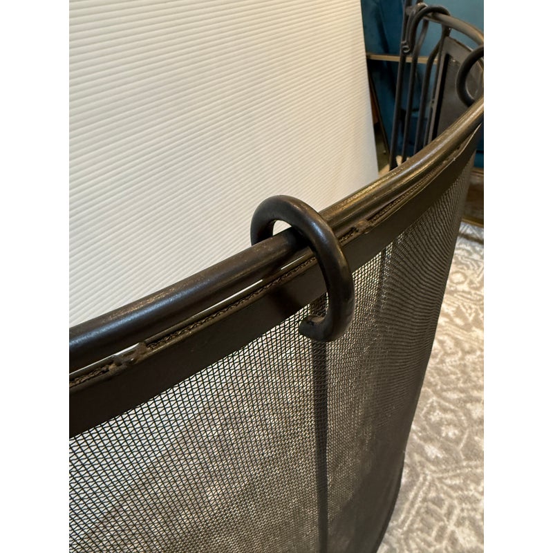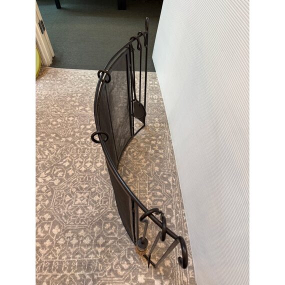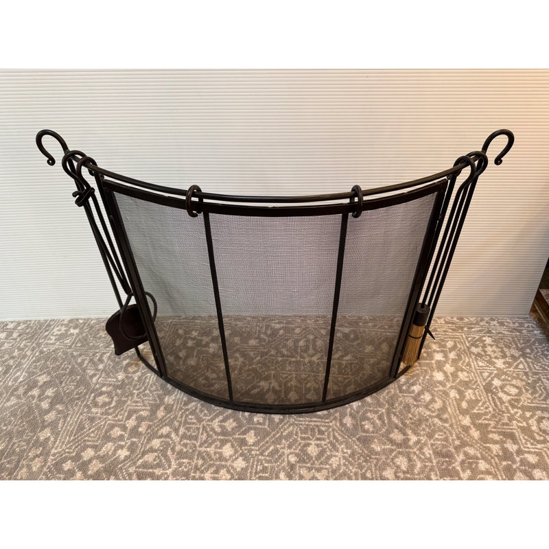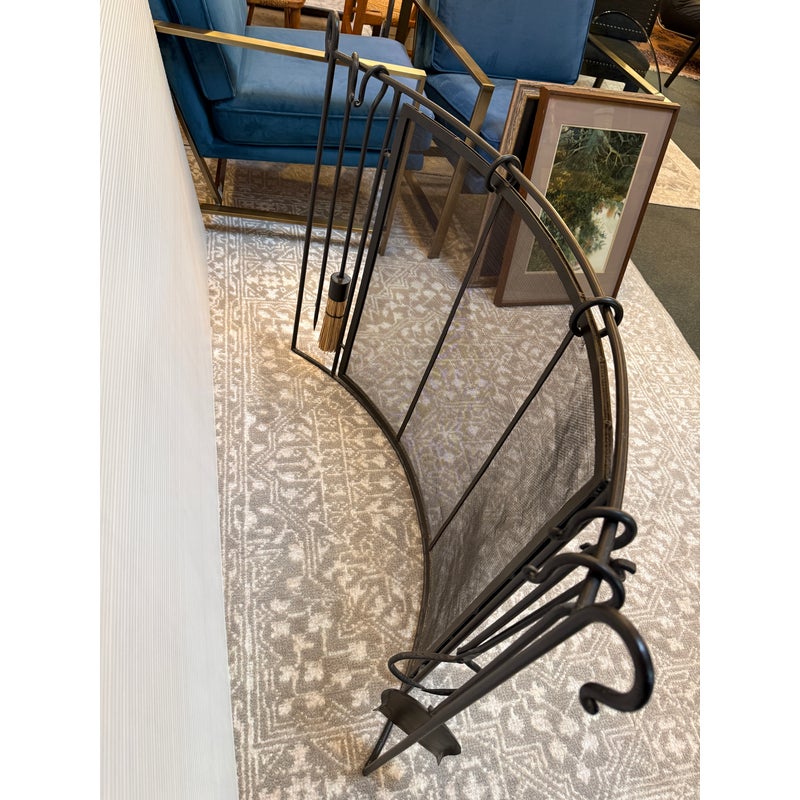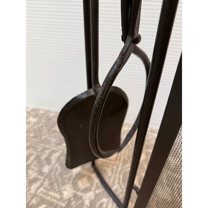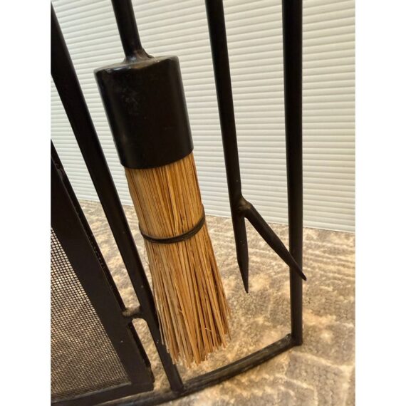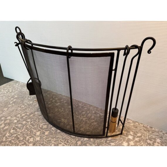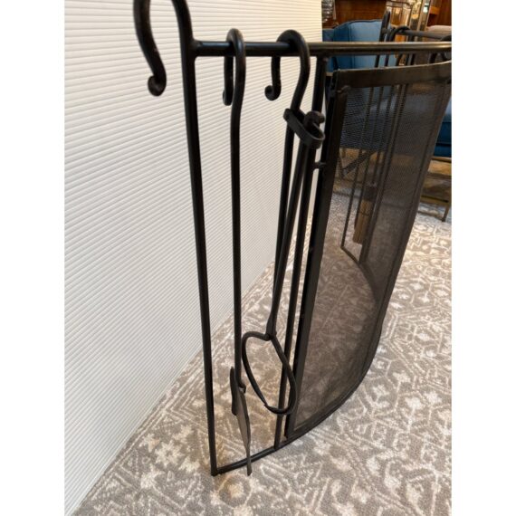 Design Plus Gallery presents a Set of Five Fireplace Tools from Plow & Hearth. The screen offers a gentle curvature to gently go around the hearth of the fireplace. The screen is designed to hold the accompanying tools on the top rail, out of the way and off the ground and includes four pieces to maintain the fire. Light wear; good condition