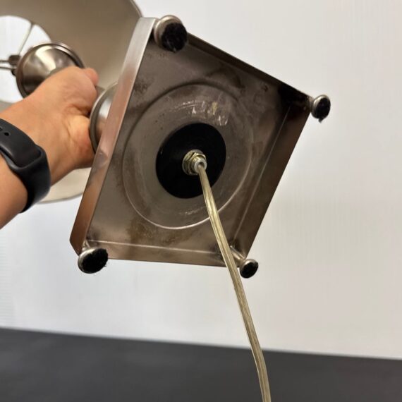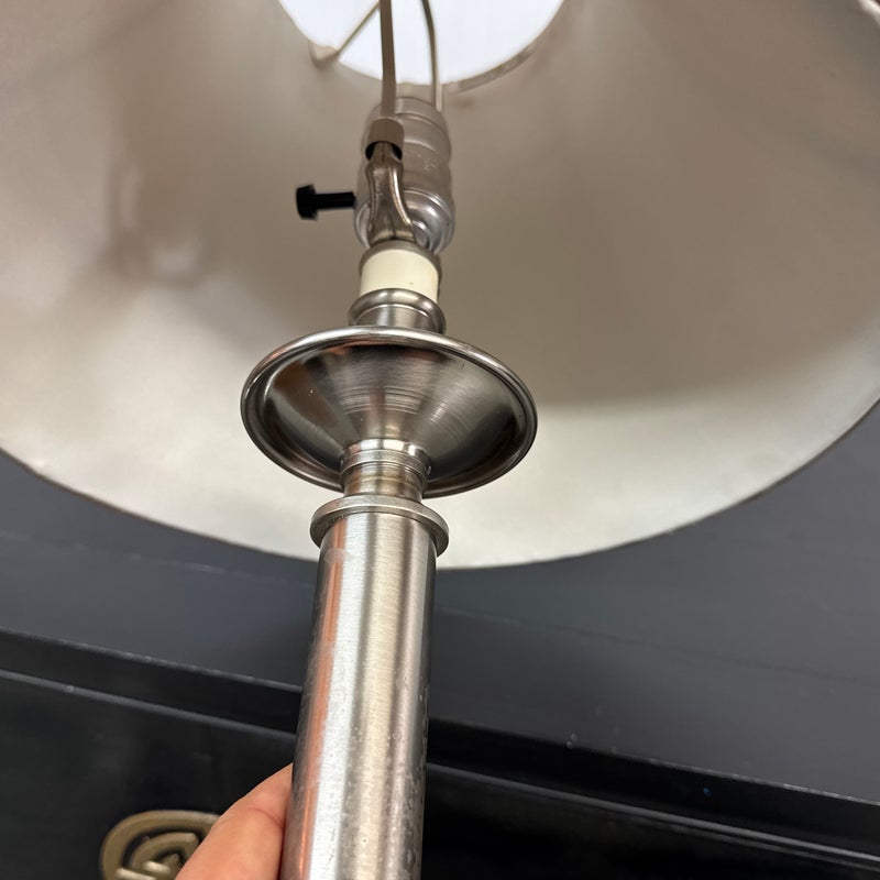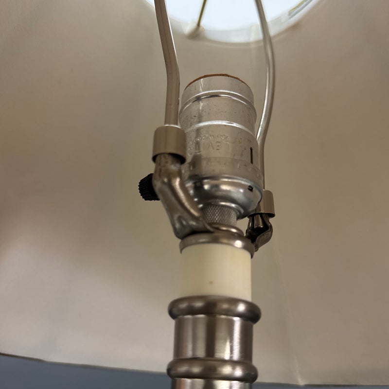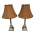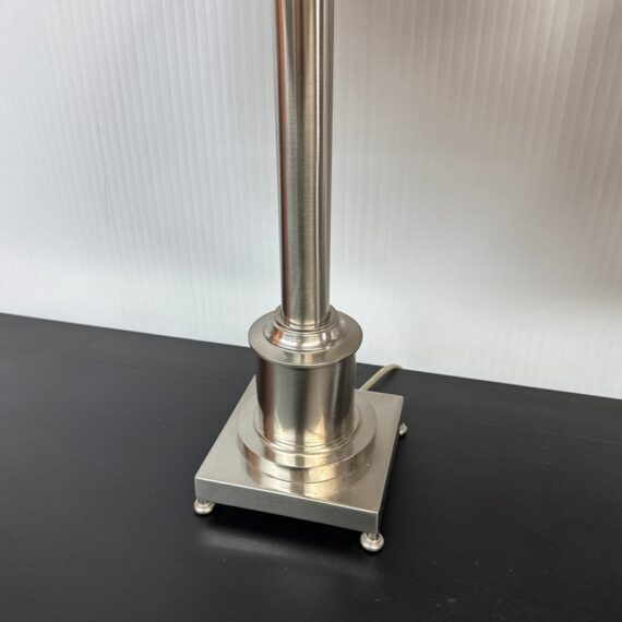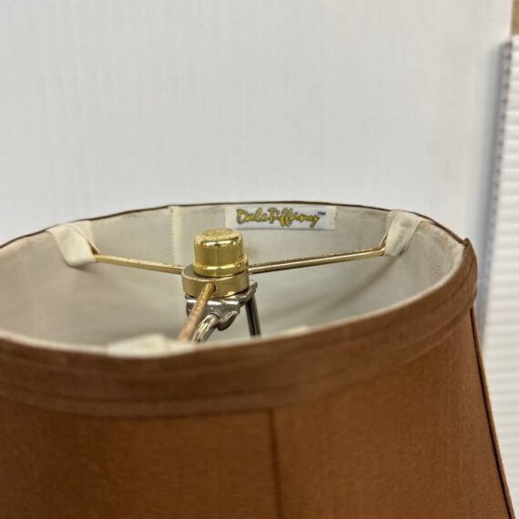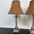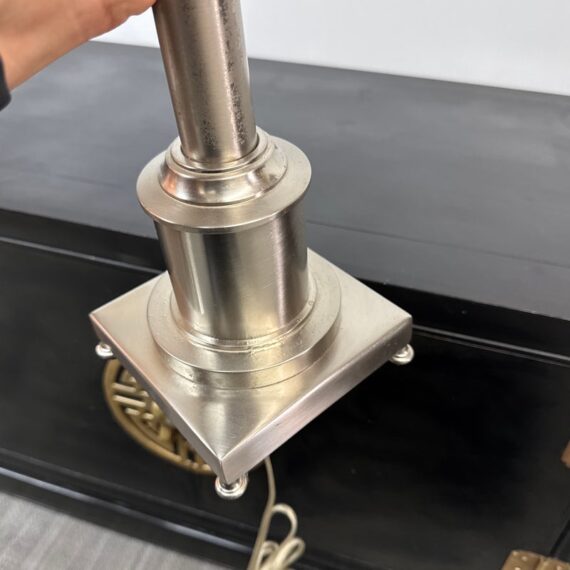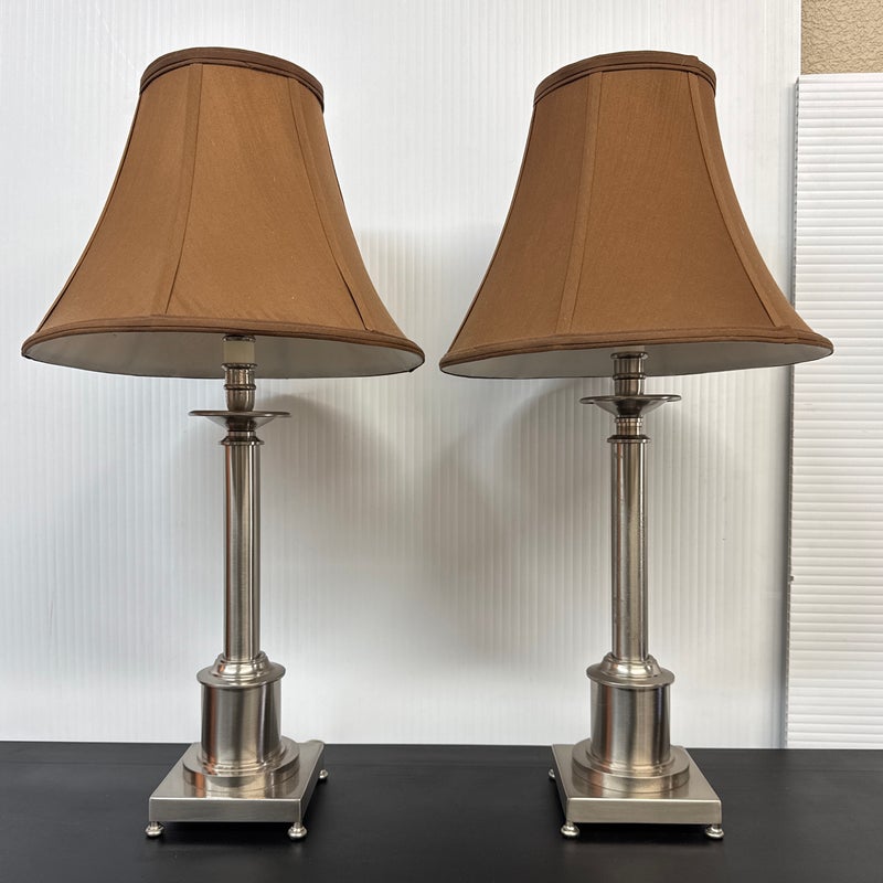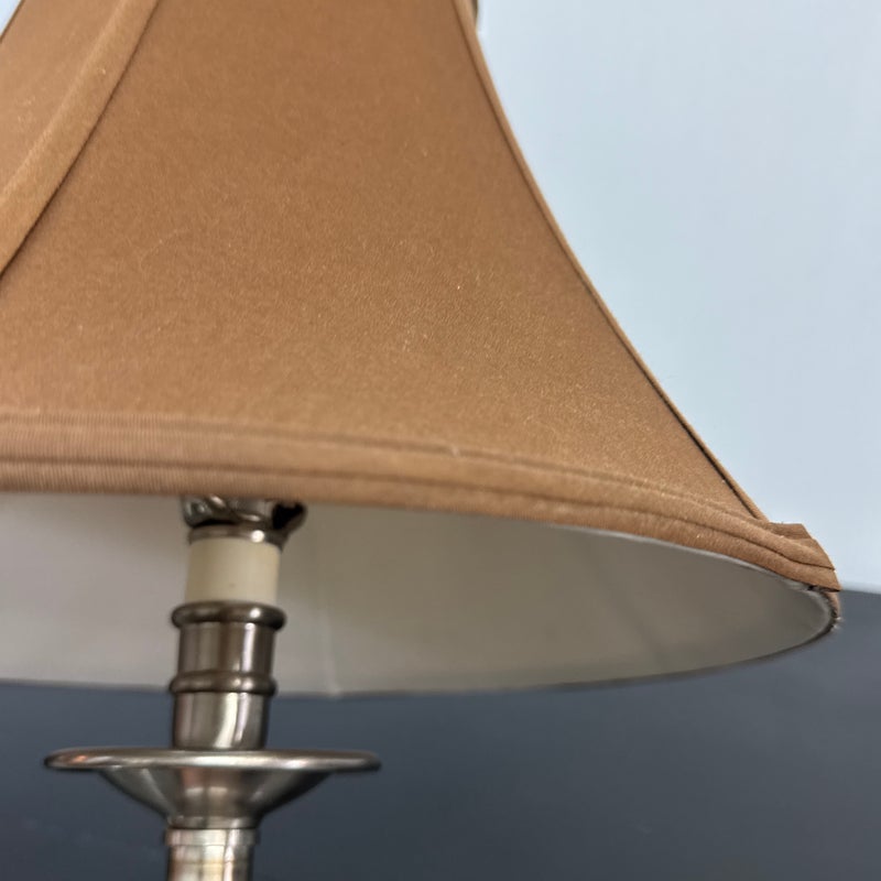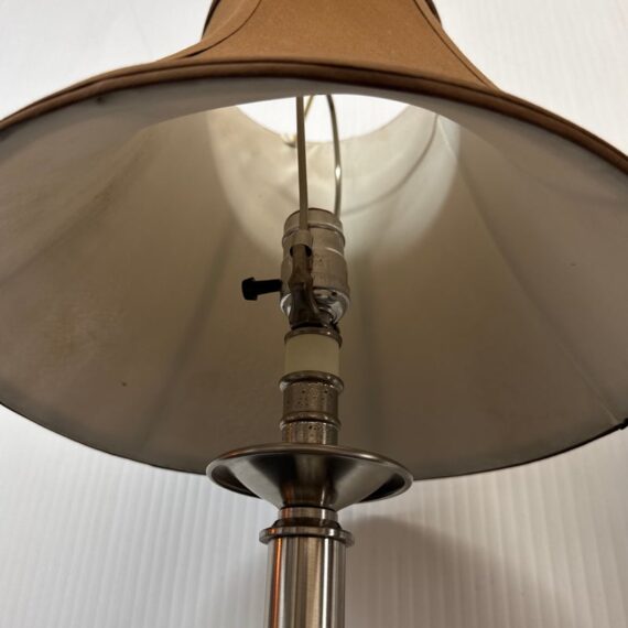 Design Plus Gallery presents a Pair of Corinthian Style Table Lamps. They have a high shine nickel finish that is polished and appears like new. They each have trumpet shades in a medium brown tone with brass finials, that aren’t a match but are not noticeable. They are in good condition, with finials + shades that are not original.