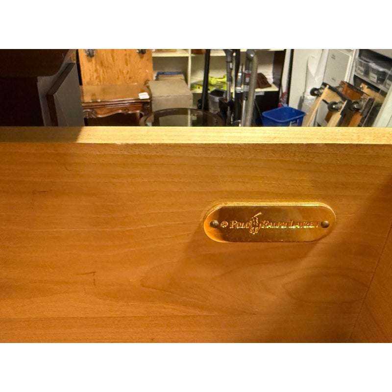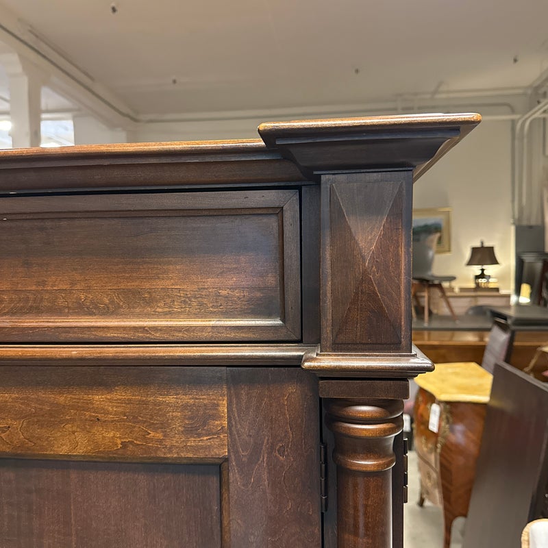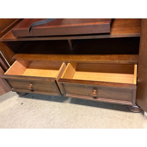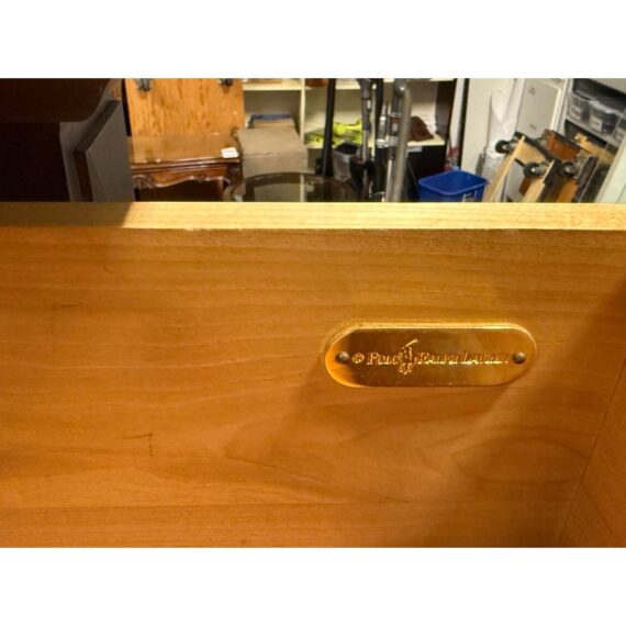 Design Plus Gallery presents a Media Armoire from Polo x Ralph Lauren. The dark wood cabinet is great for keeping your television tucked out of site and maintaining a polished rooms decor + finish. The cabinet has design elements synonymous with Ralph Lauren’s aesthetic, a Hunters Lodge comes to mind. The cabinet offers a top drawer at the upper cornice, two doors opening to reveal an inner shelf that pulls forward + back, and a large inner cavity space. There are two concealed drawers at the base. The outside offers pillars + button feet, with crown molding. The entire cabinet is finished with the back side have a large square opening for cord maintenance.