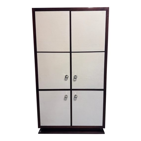 Design Plus Gallery presents a Leather Wrapped + Mahogany Media Cabinet. Solid wood and fine veneers in its entirety with white leather wrapped around the outer door cabinetry for the most luxurious appearance. There are four total nickel finish ring pulls that are used to open up the cabinetry. Inside you will reveal an open section for likely a TV, with an open shelf above and two cubby shelving below the open cavity. The lower doors open to reveal four staggered sized shelves! This piece can be converted into a wardrobe or fun dry bar. This is a discontinued model.