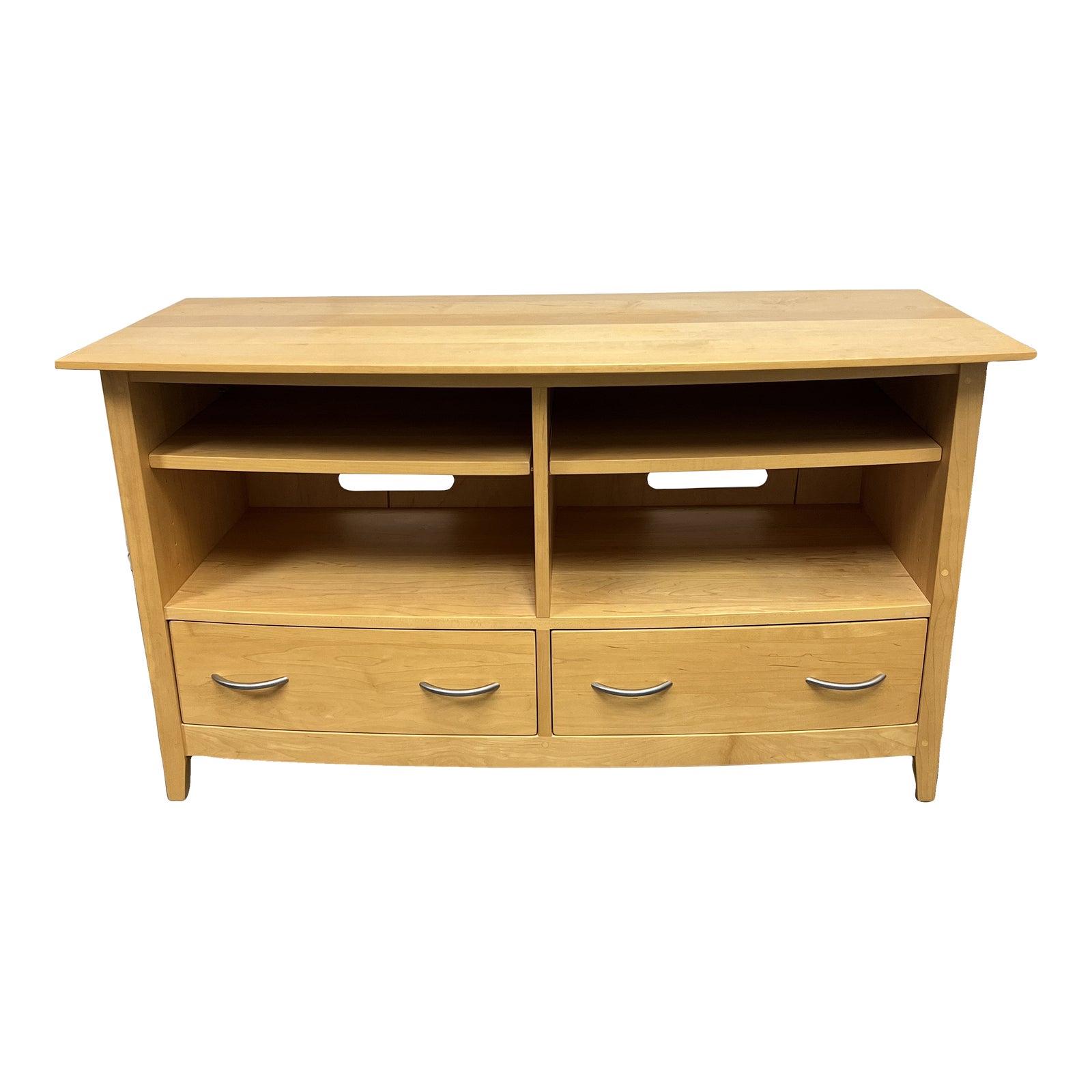 Design Plus Gallery presents a Chelsea Media Center by Pompanoosuc Mills. Sleek, stylish, and so very sturdy. The cabinet has room for all your audio-visual equipment, plus storage. Crafted from solid maples in a natural finish with nickel finish pulls. Just outs on the back for wire passage. Minor wear from usage. Made in East Thetford, Vermont, USA.
