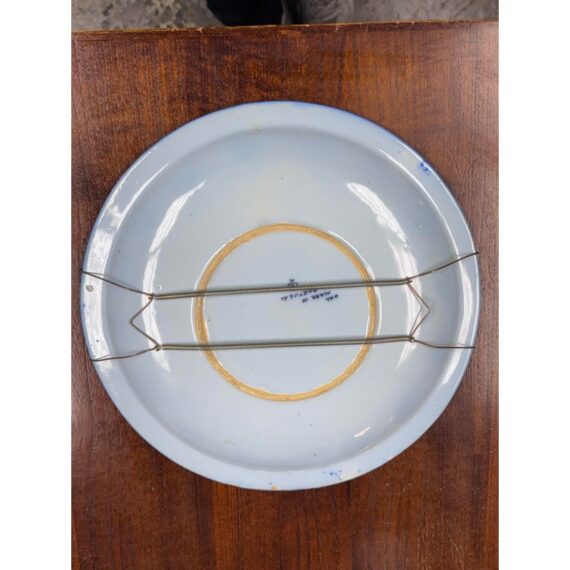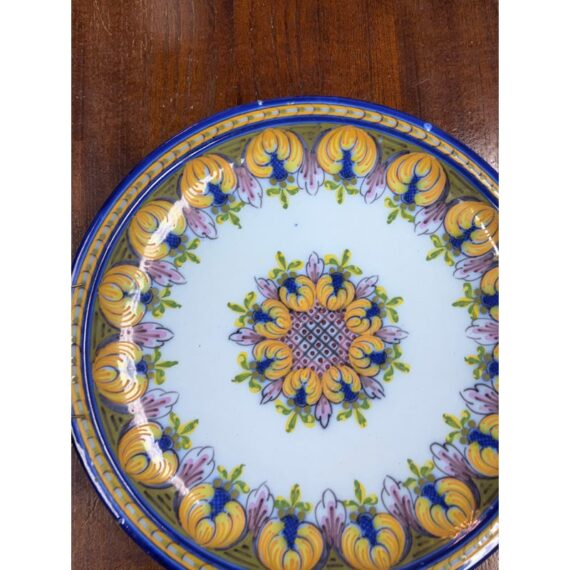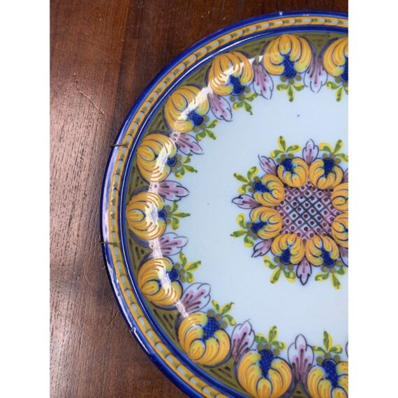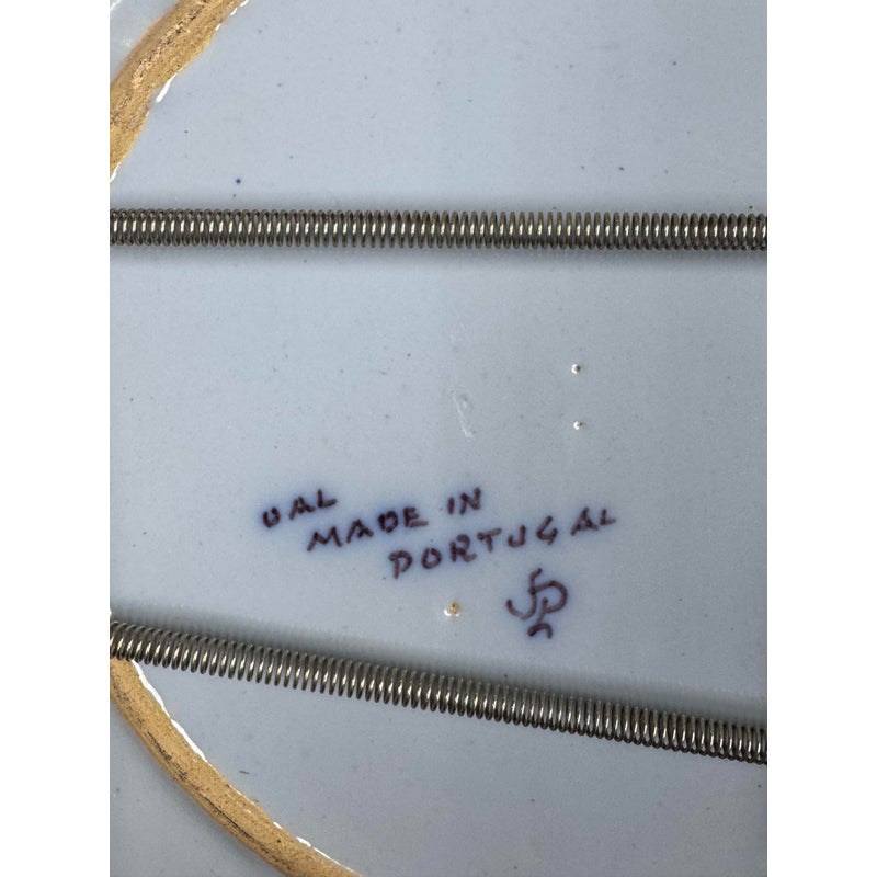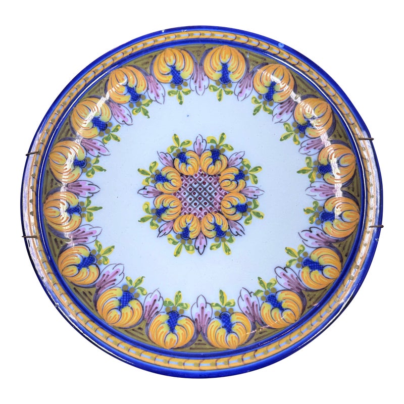 Design Plus Gallery presents a Ceramic Wall Plate made in Portugal. This decorative plate showcases a classic floral and foliate motif, arranged in a balanced circular composition with a central medallion and repeating border pattern. Hand-applied glazing highlights tones of blue, yellow, green, and soft lavender against a pale ground, reflecting traditional Portuguese ceramic artistry. The plate is fitted on the reverse with a metal spring hanger, allowing for secure wall display, while also remaining suitable for shelf or tabletop presentation. Marked on the back as made in Portugal, it offers an authentic example of regional decorative ceramics well suited to a variety of interiors, from traditional to eclectic collections. In good condition, visible and minimal wear from usage.