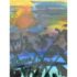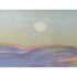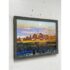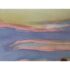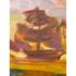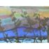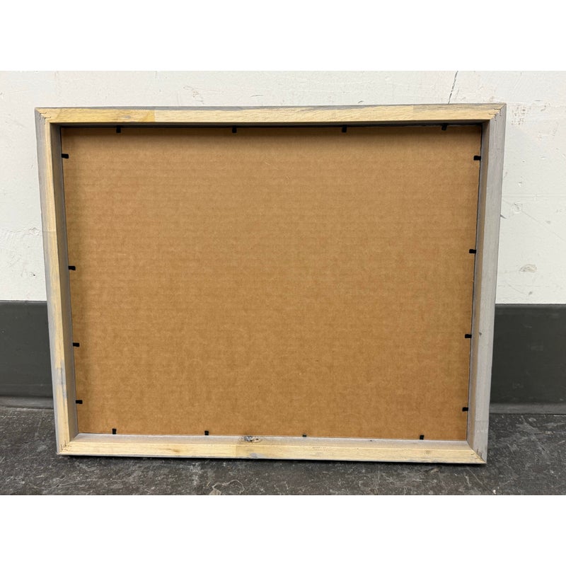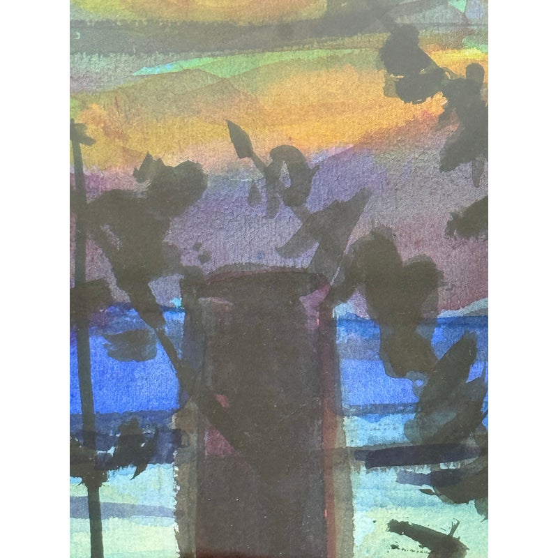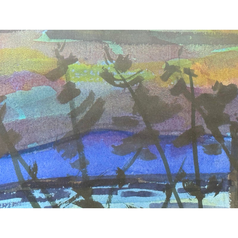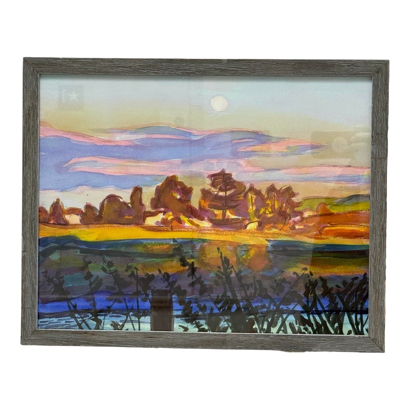 Design Plus Gallery presents a Landscape Art Work with a Post Impressionistic Style. The painting has visible brushstrokes with a bold use of color. It is capturing sunrise or set over. body of water, reflecting the colors of the sky. The foreground has a dark silhouette of vegetation and a fence line that contrasts the vibrant background. The art is unsigned and encased in a weathered gray frame. It is in good overall condition for its usage.