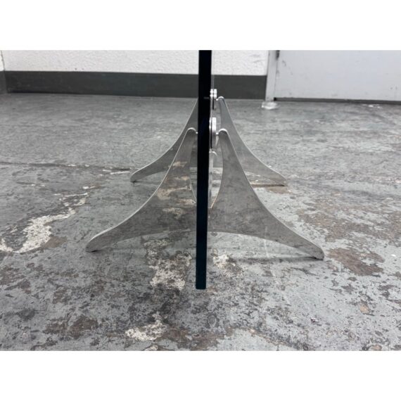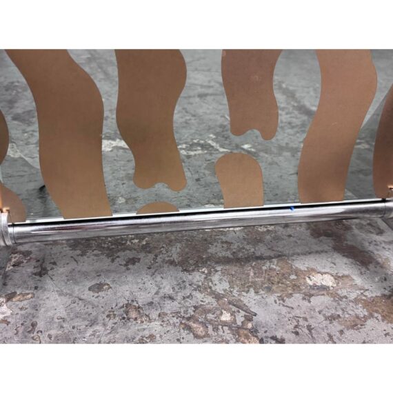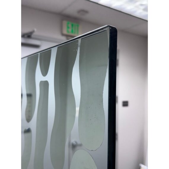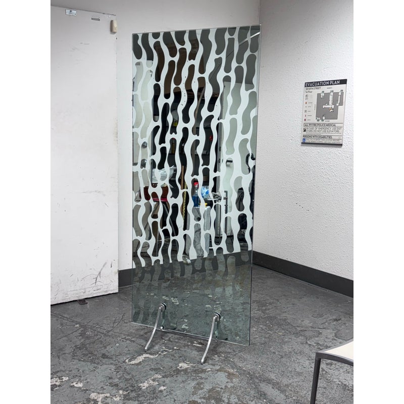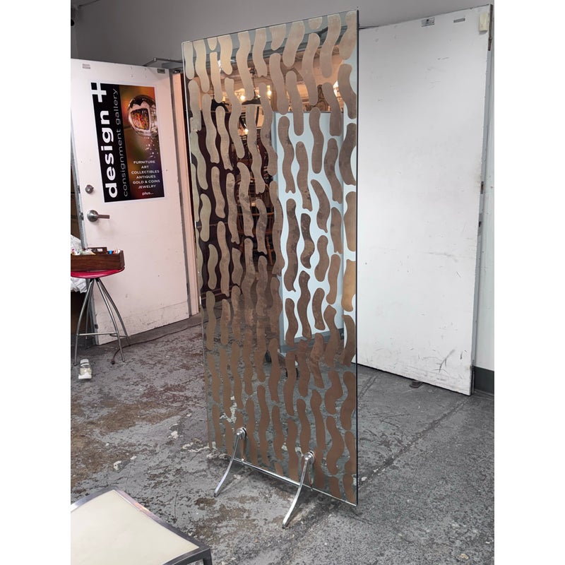Design Plus Gallery presents a Post Modern Sculptural Glass Panel Wall Divider from Fiam, Italia. This rectangular, free-standing piece functions as both a floor mirror and a space divider, blending art with utility. It has elegant chrome-finished sculptural feet and glass adorned with flowing wavy mirror film design that creates depth and visual movement. This model is no longer in production with the brand and is in good condition, visible and minimal wear from usage. Made in Italy.
