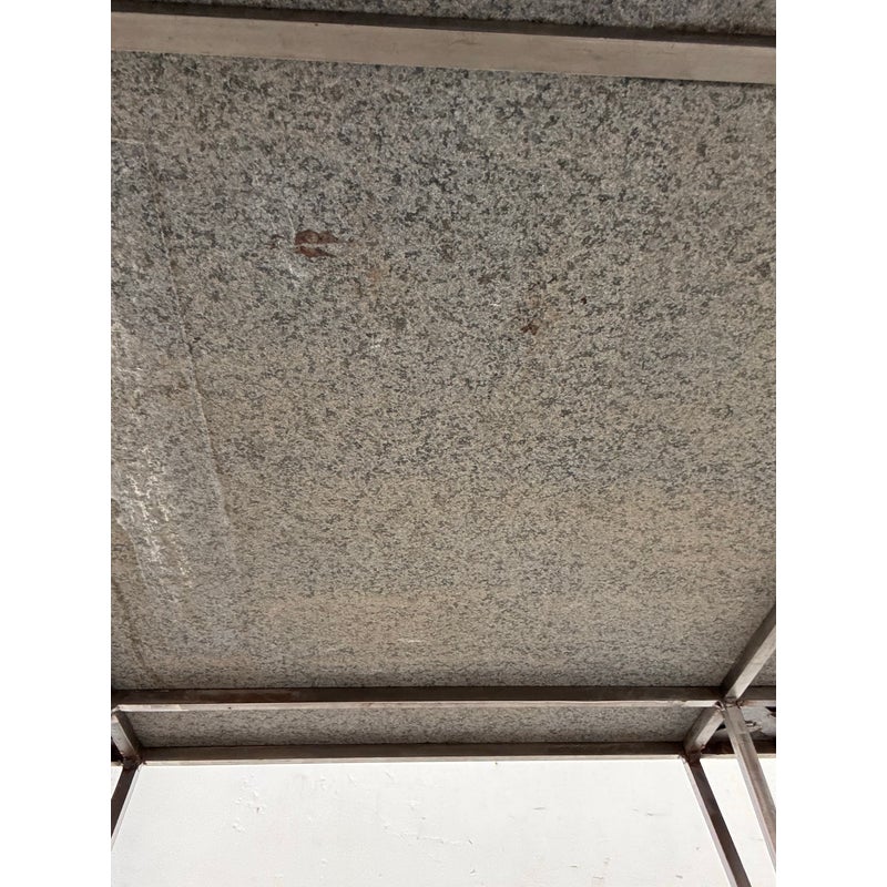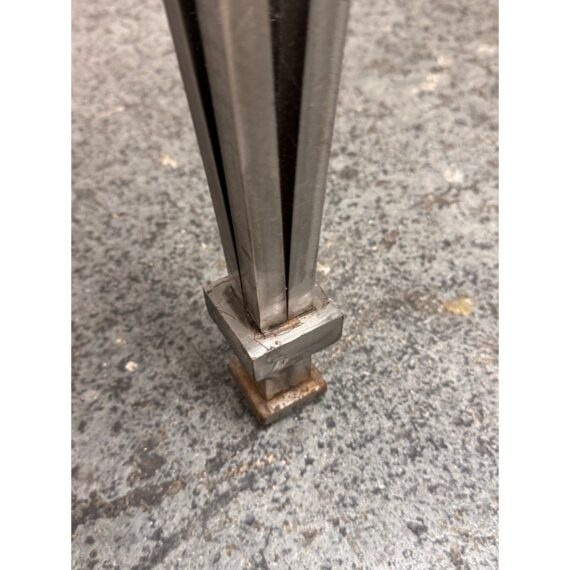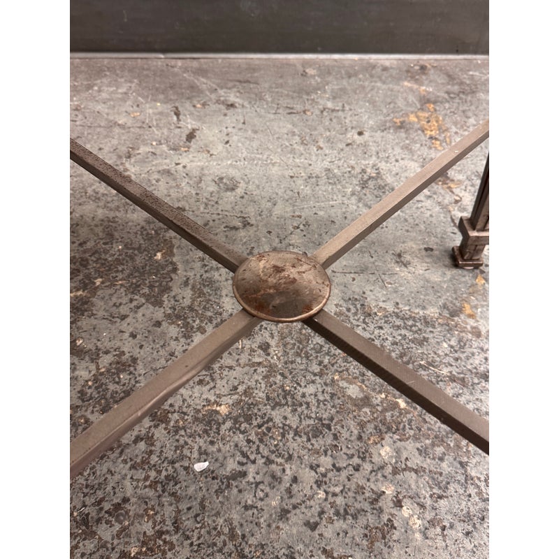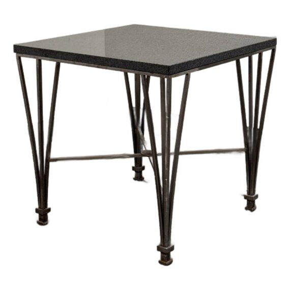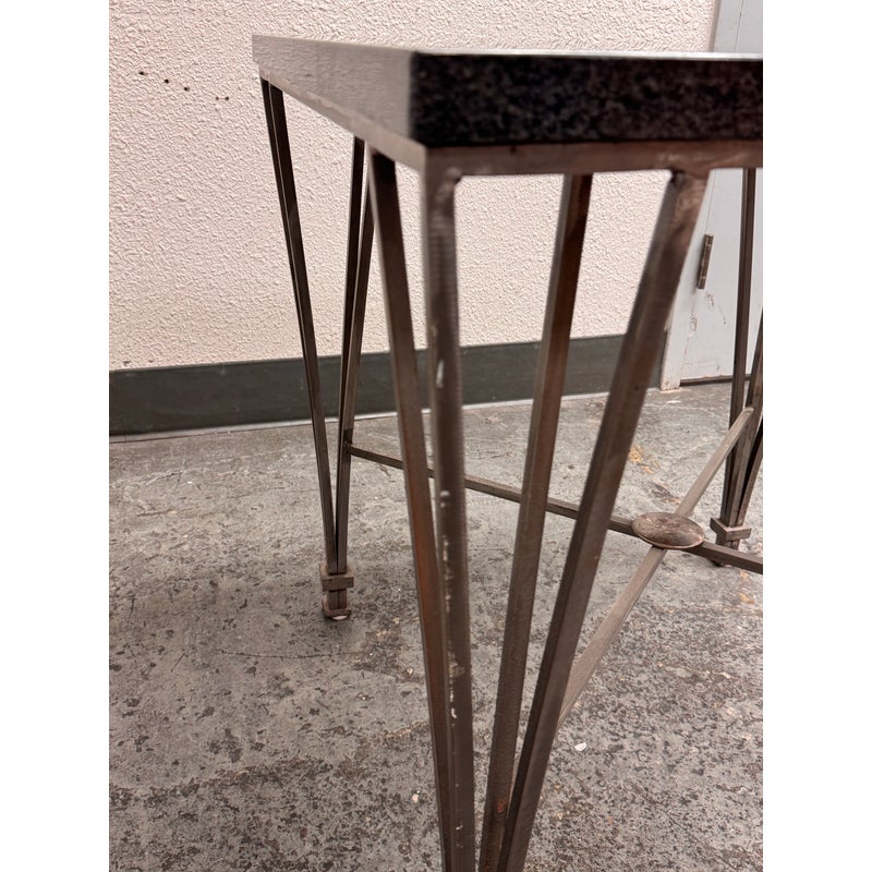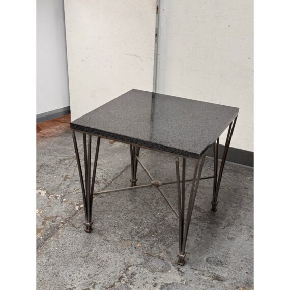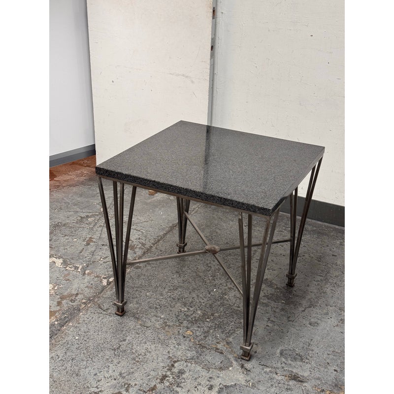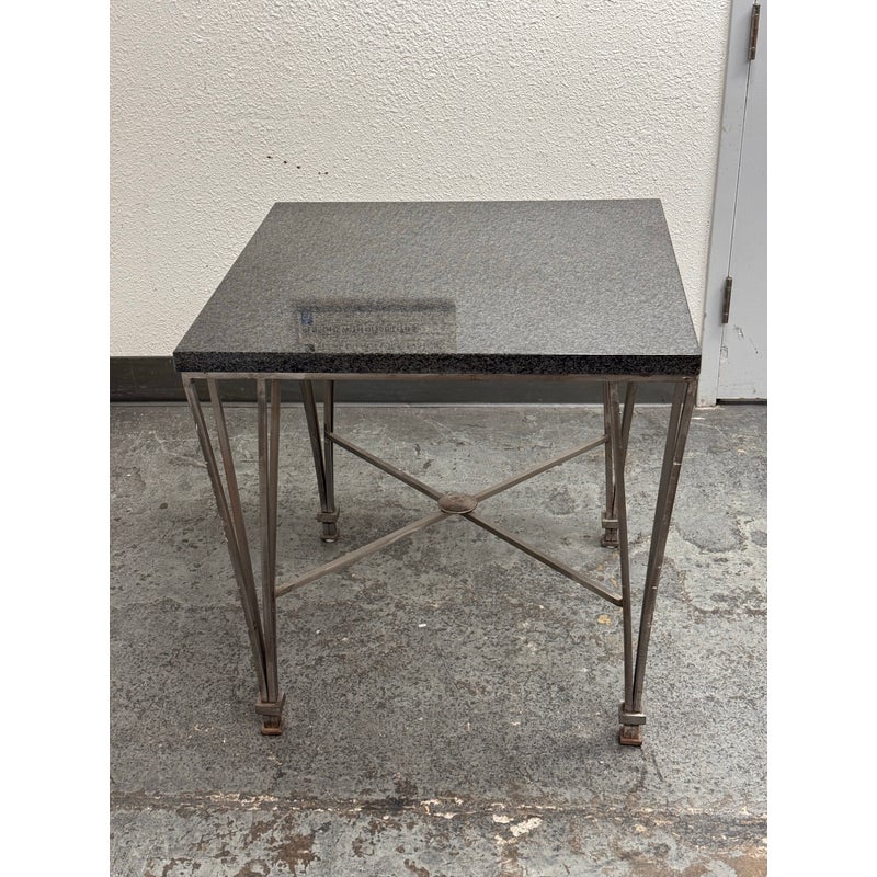 Design Plus Gallery presents a Post Modern Granite-Top Occasional Table. The table has a steel metal base with tapered and flared legs. The polished stone surface shows a fine speckled pattern and a subtly beveled edge for a sleek profile. There is an X-form stretcher to connect the legs and it meets at a round center medallion promoting its strong structure with a graphic silhouette. It is in good condition with visible patina and minimal wear from usage.