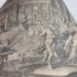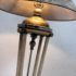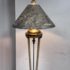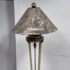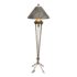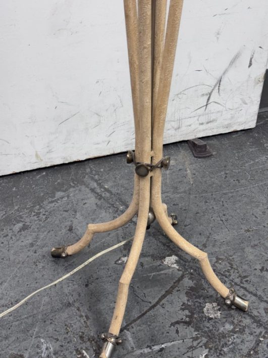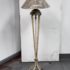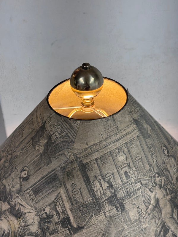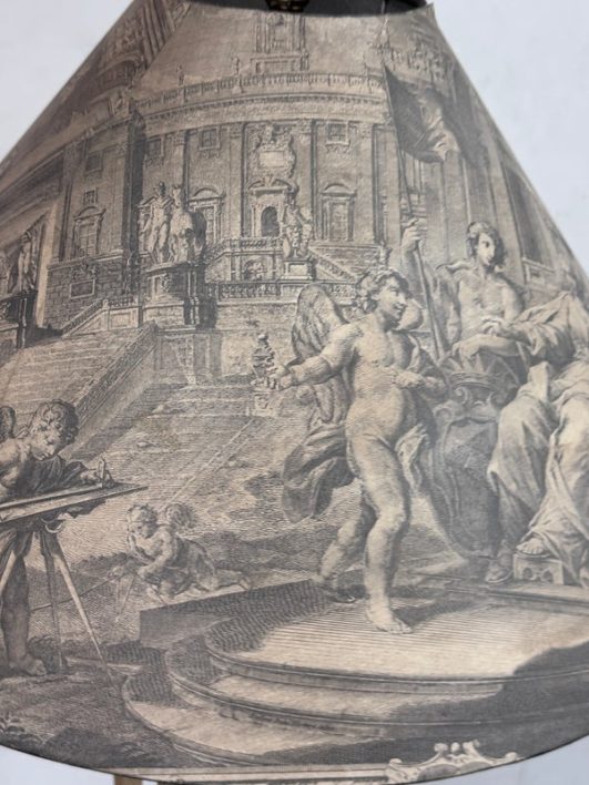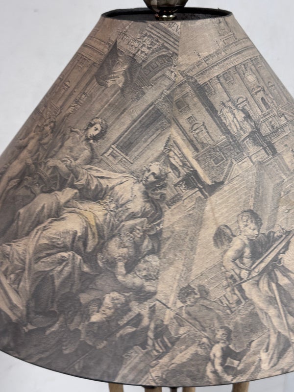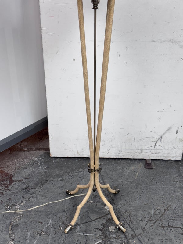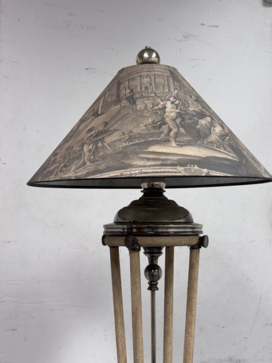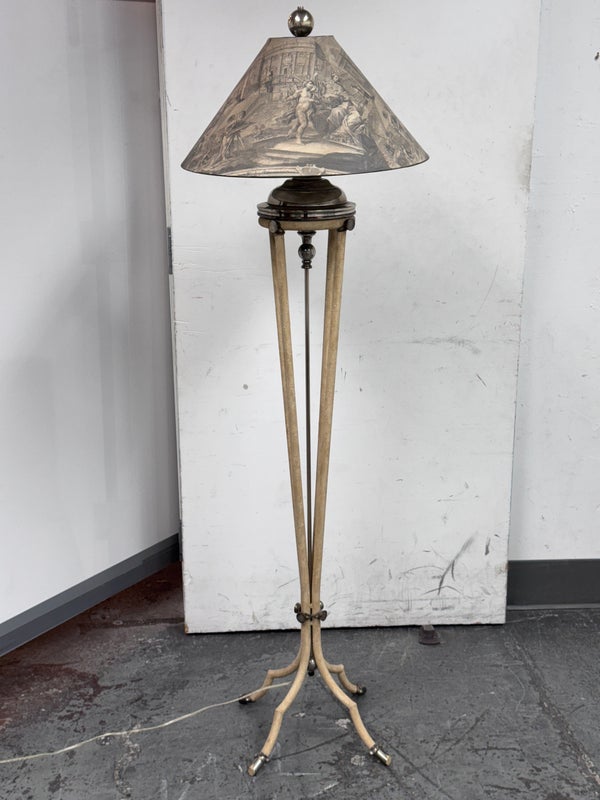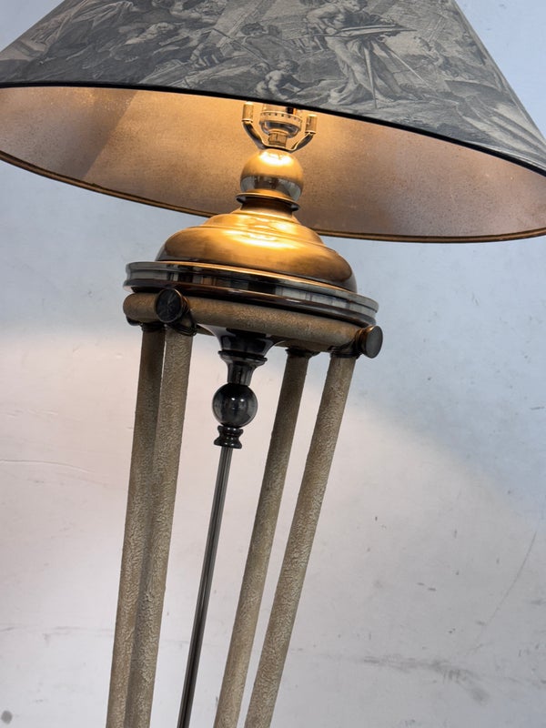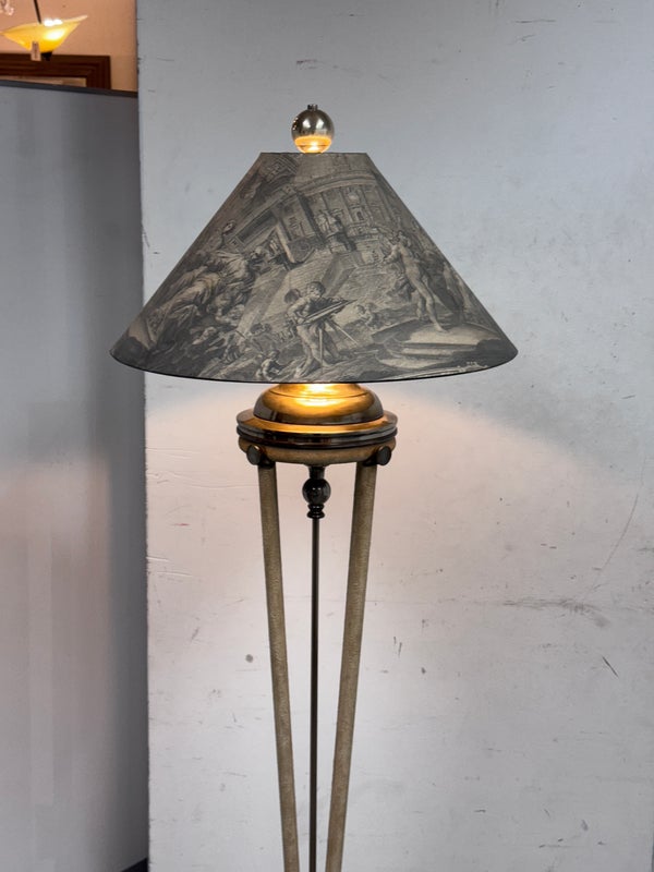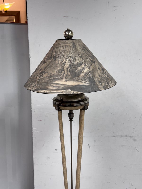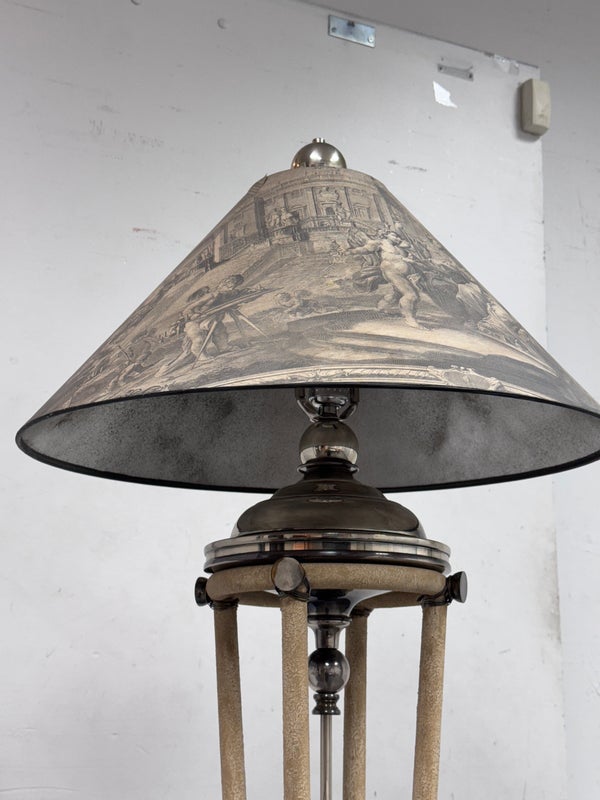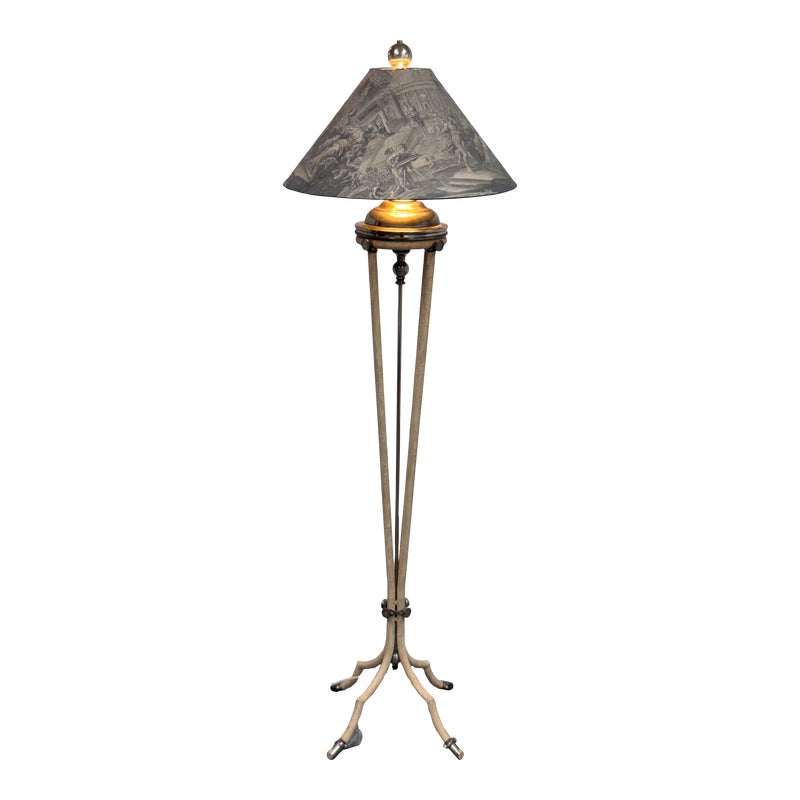 Design Plus Gallery presents a Floor Lamp with Neoclassical Shade from the Late 20th Century. Four stucco cream pointed legs with wrapped silver tone metal robots. Brass stem in center. Legs attach to a round stucco cream painted and black cherub with gold interior. Is in good condition with minimal signs of wear for their age + use.
