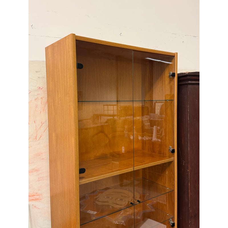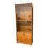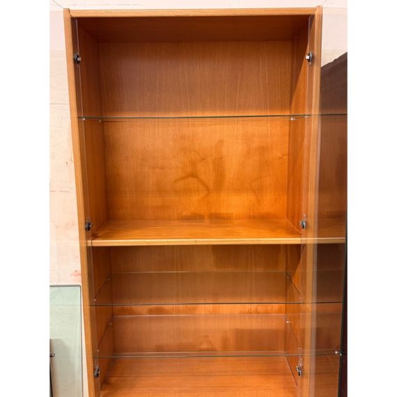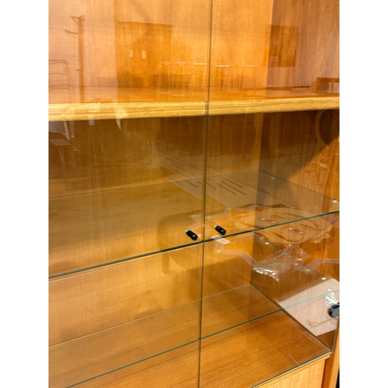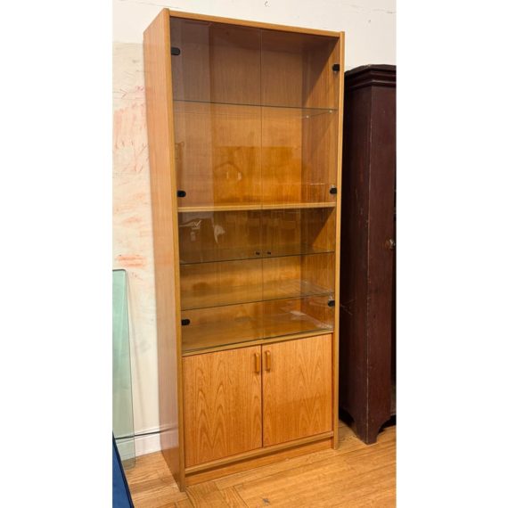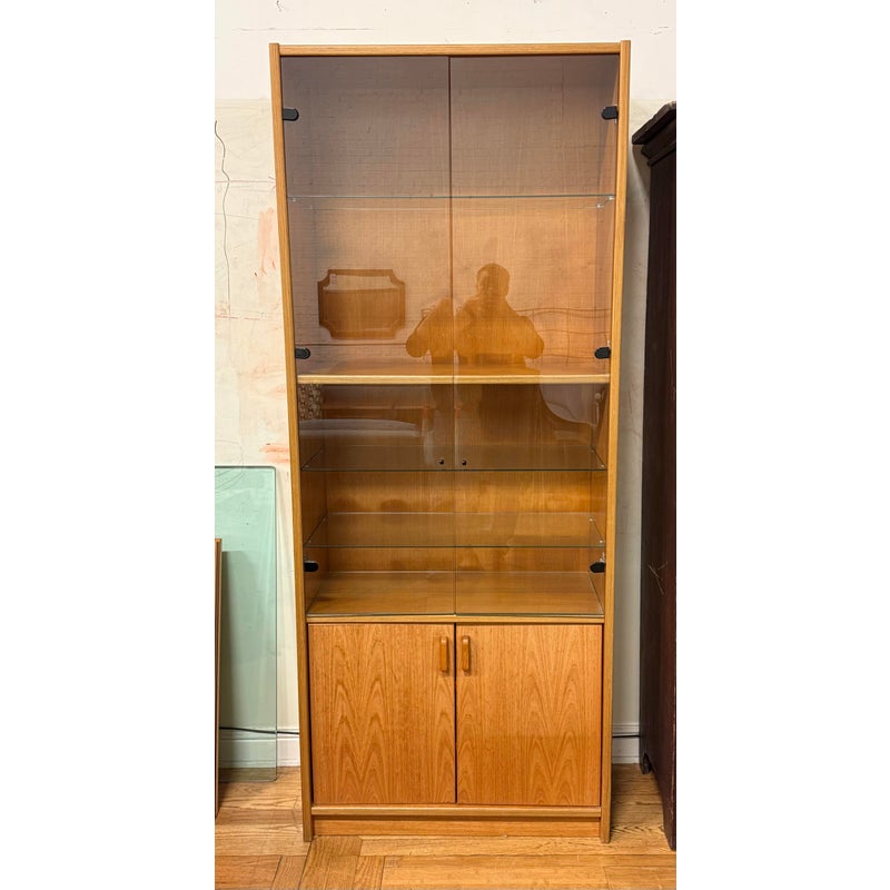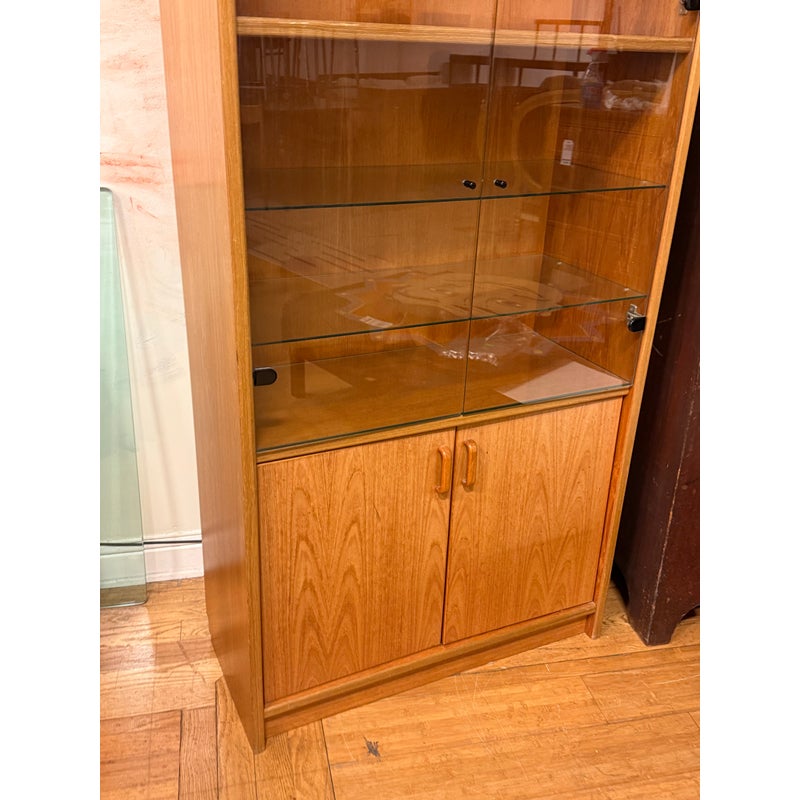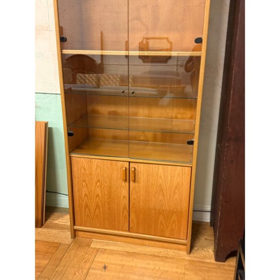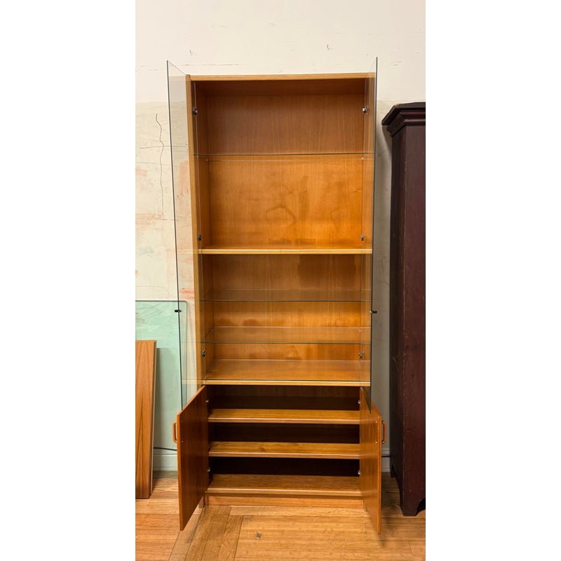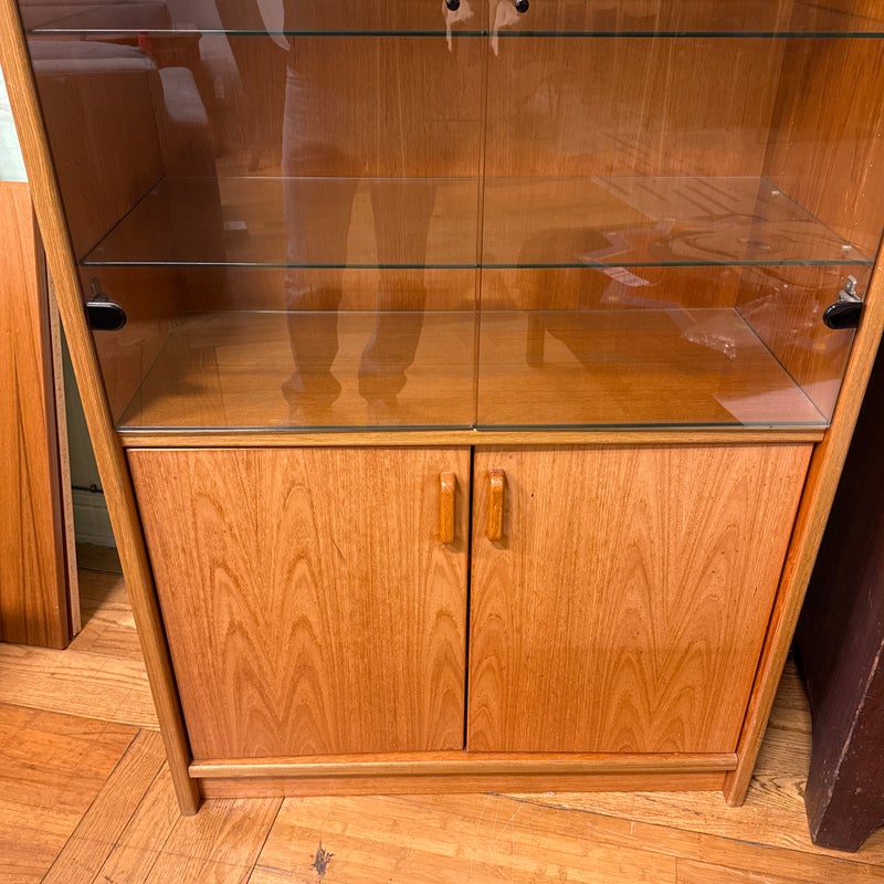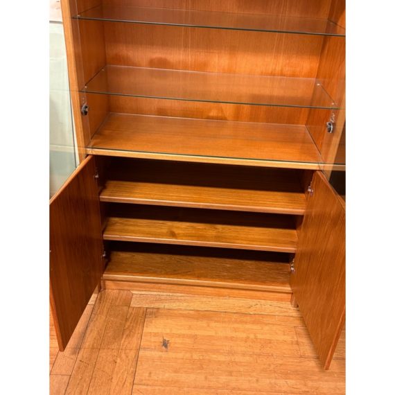 Design Plus Gallery presents a Teak Wood Tall Cabinet from Scandinavian Designs. The cabinet is great for a home theater or even for storage of linens, clothing. The bottom has two cabinet doors with three internal shelves. The upper section has glass doors that safely hold items while being able to view them. Is in good condition with minimal visible wear for its usage.