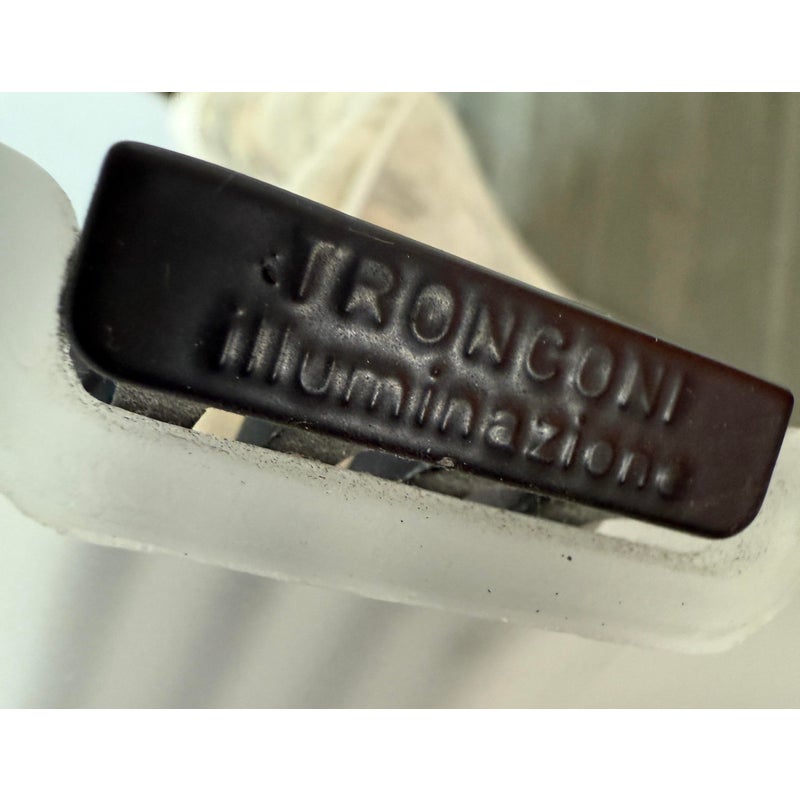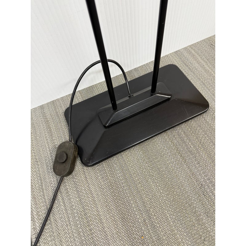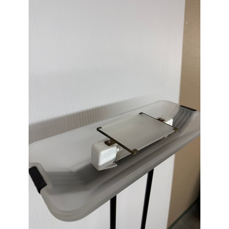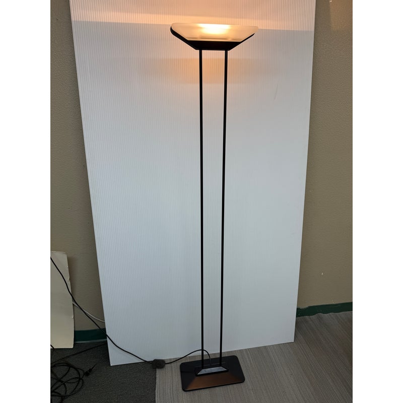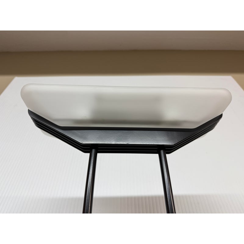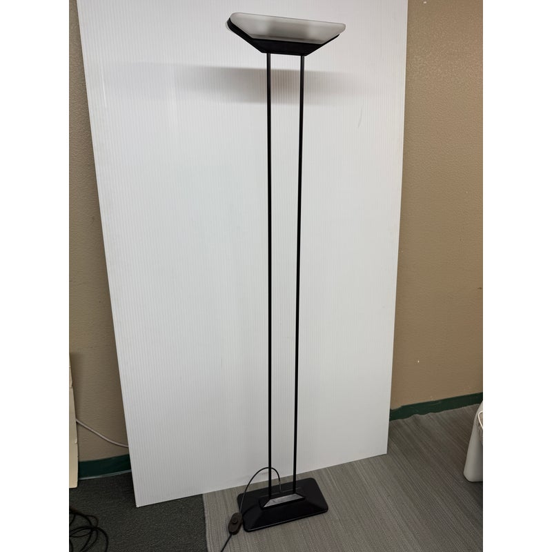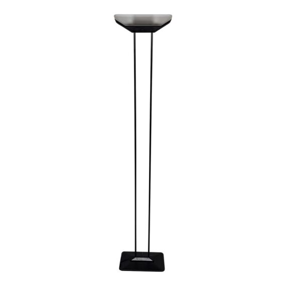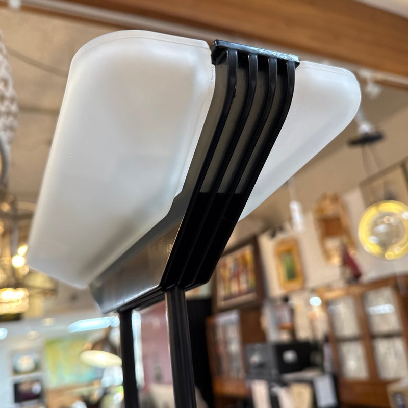 Design Plus Gallery presents the Frack floor lamp by Barbieri e Marianelli for Tronconi. The vintage 1980s Murano frosted glass shade is elevated on a modern black powder-coated steel brace. The foot switch should power up the LED bulb for dramatic uplighting, however it does not work properly, but light works when plugged in. Made in Italy. Condition is fair for age and use.