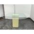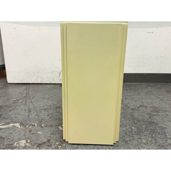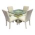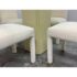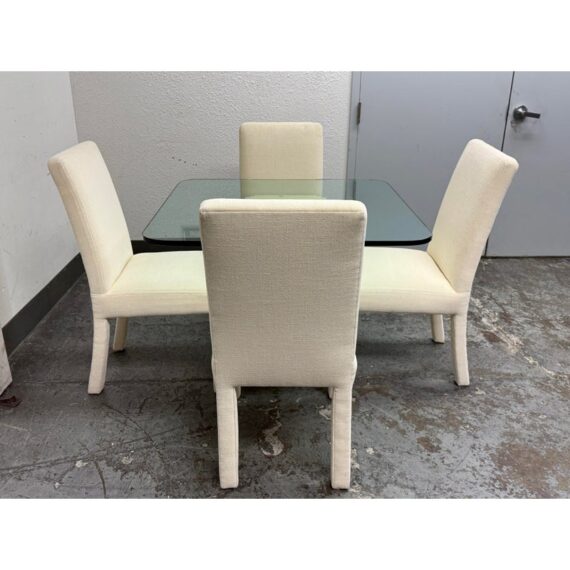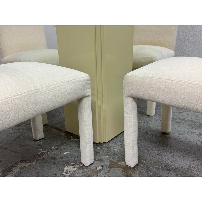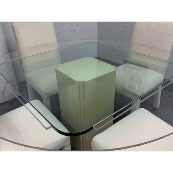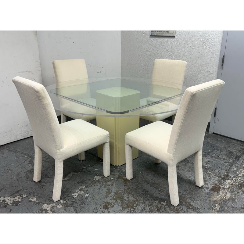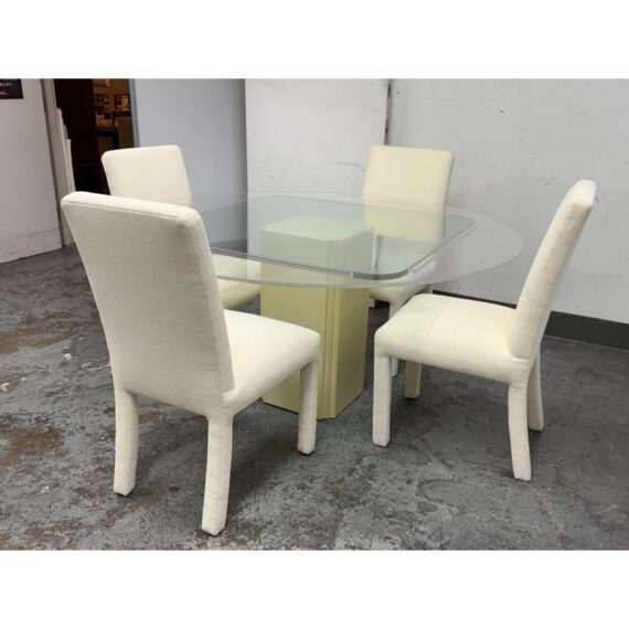 Design Plus Gallery presents a Vintage Post Modern Style Game Table and Set of Four Ivory Dining Side Chairs. The design of this set gives off “Golden Girls” vibes; very Fort Lauderdale with the ladies coming together for some bridge + gossip. The cream tone pedestal base is of a smooth lacquer with a glass table top with rounded corners. The chairs transition seamlessly with their sophisticated tone of ivory. They are completely padded wrapped in the upholstery, top to bottom, and even wrapped around the legs. The game table is in good condition with visible wear to the fabric on the dining chairs as shown on some images but overall they are considered to be in good condition with professional cleaning recommended.
