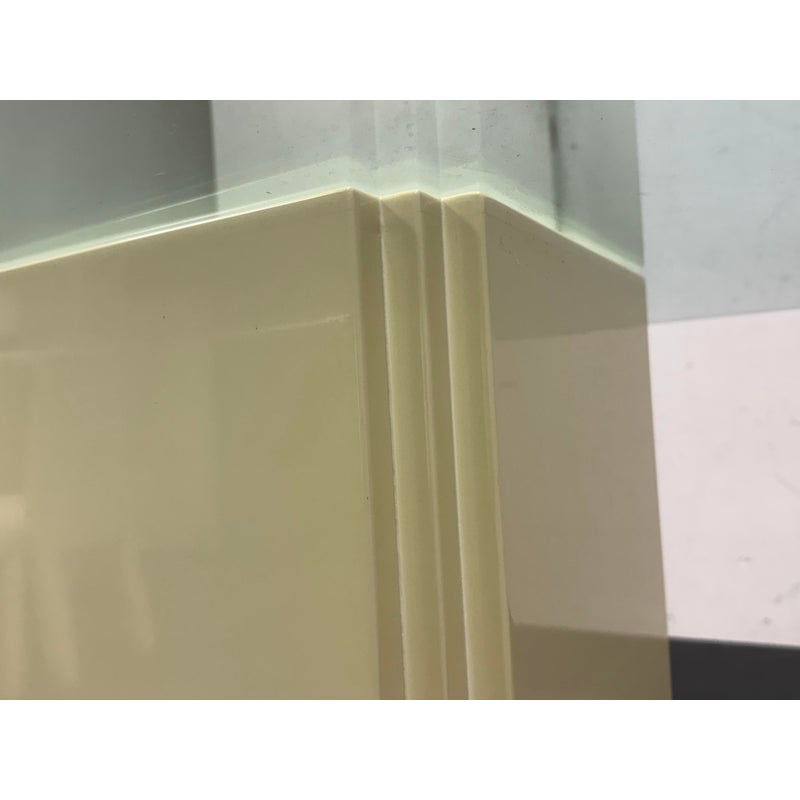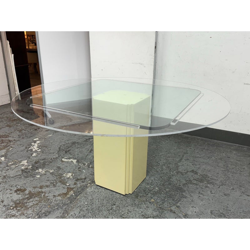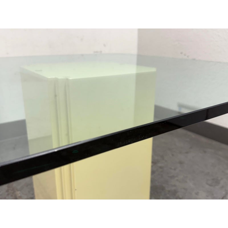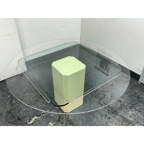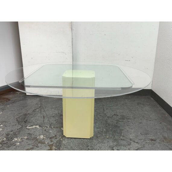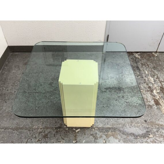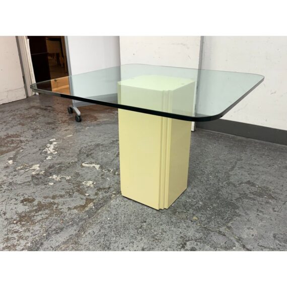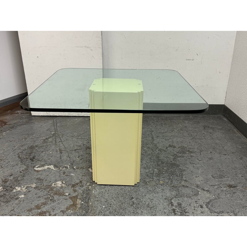 Design Plus Gallery presents a Vintage Post Modern Style Game Table. The design of this table gives off “Golden Girls” vibes; very Fort Lauderdale with the ladies coming together for some bridge + gossip. The cream tone pedestal base is of a smooth lacquer with a glass table top with rounded corners. The game table is in good condition for its usage with minimal visible wear.