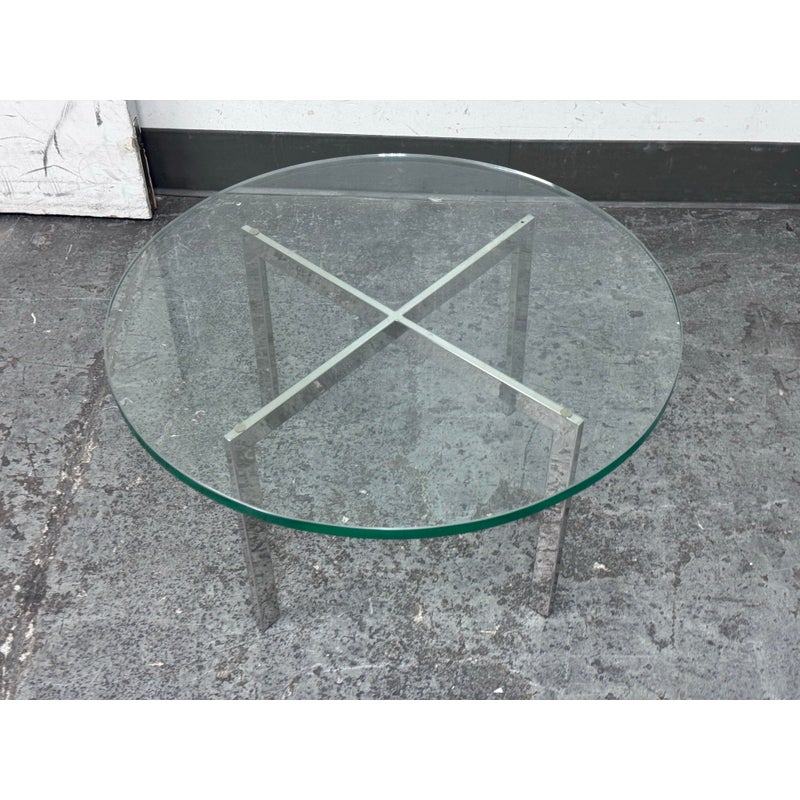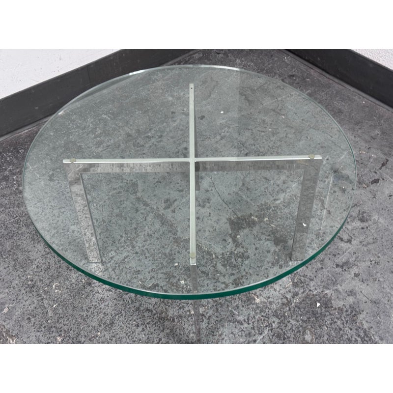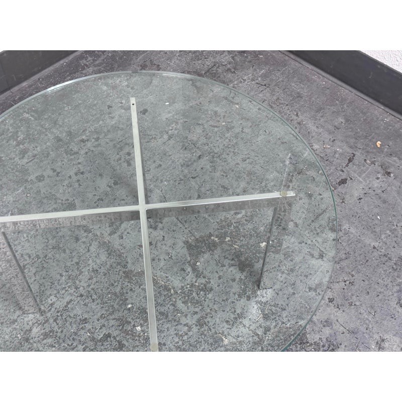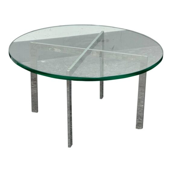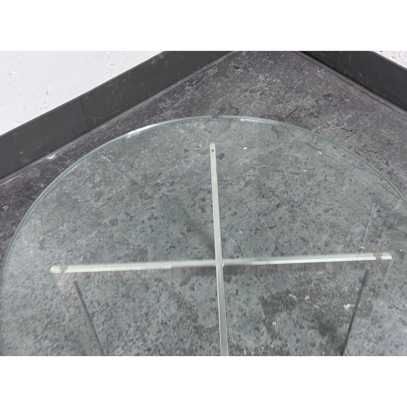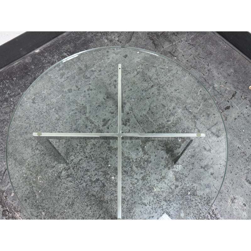 Design Plus Gallery presents a Chrome + Tempered Glass Coffee Table from the Post Modern Design Style. The coffee table offers a sculpted cross base of chrome, a hallmark of 1980s postmodern luxury. It has a round, thick beveled glass top allowing the crisp geometry and contrast of transparent and metallic materials to reflect the bold elegance and architectural influence that defined this era. Though it shows light surface wear consistent with age, it remains in good condition for its usage.