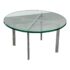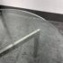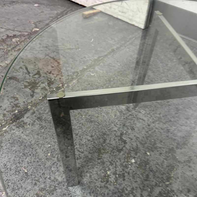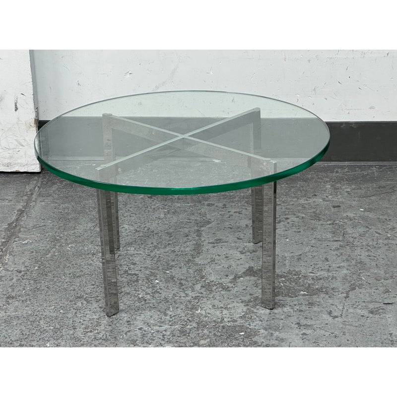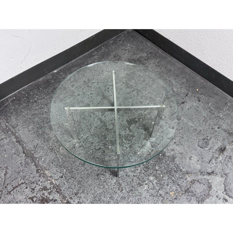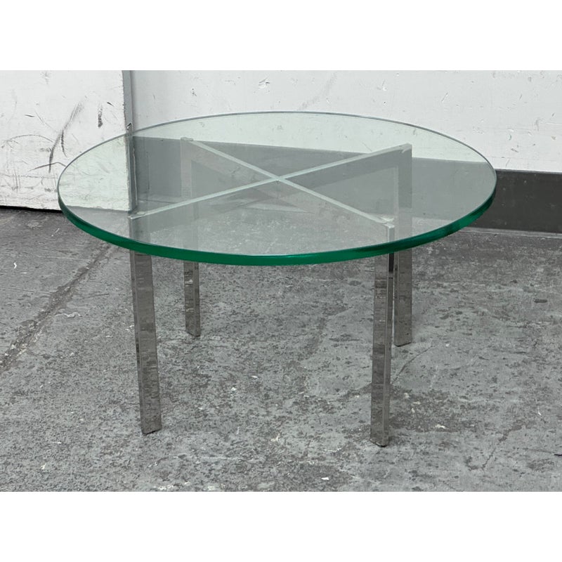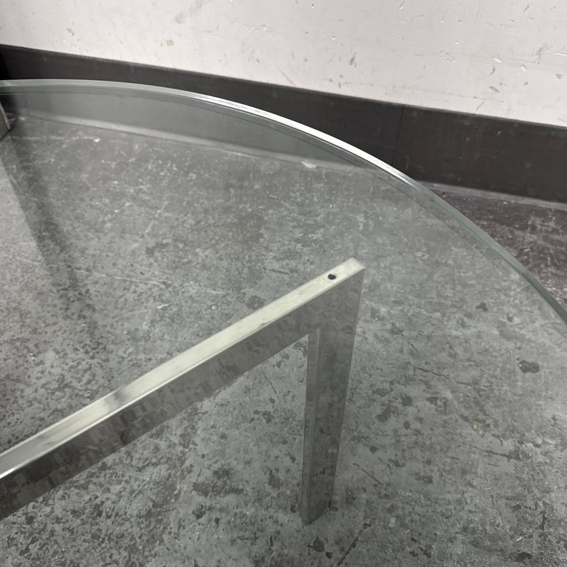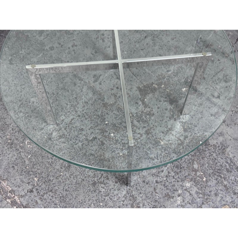 Design Plus Gallery presents a Chrome + Tempered Glass Coffee Table from the Post Modern Design Style. The coffee table offers a sculpted cross base of chrome, a hallmark of 1980s postmodern luxury. It has a round, thick beveled glass top allowing the crisp geometry and contrast of transparent and metallic materials to reflect the bold elegance and architectural influence that defined this era. Though it shows light surface wear consistent with age, it remains in good condition for its usage.