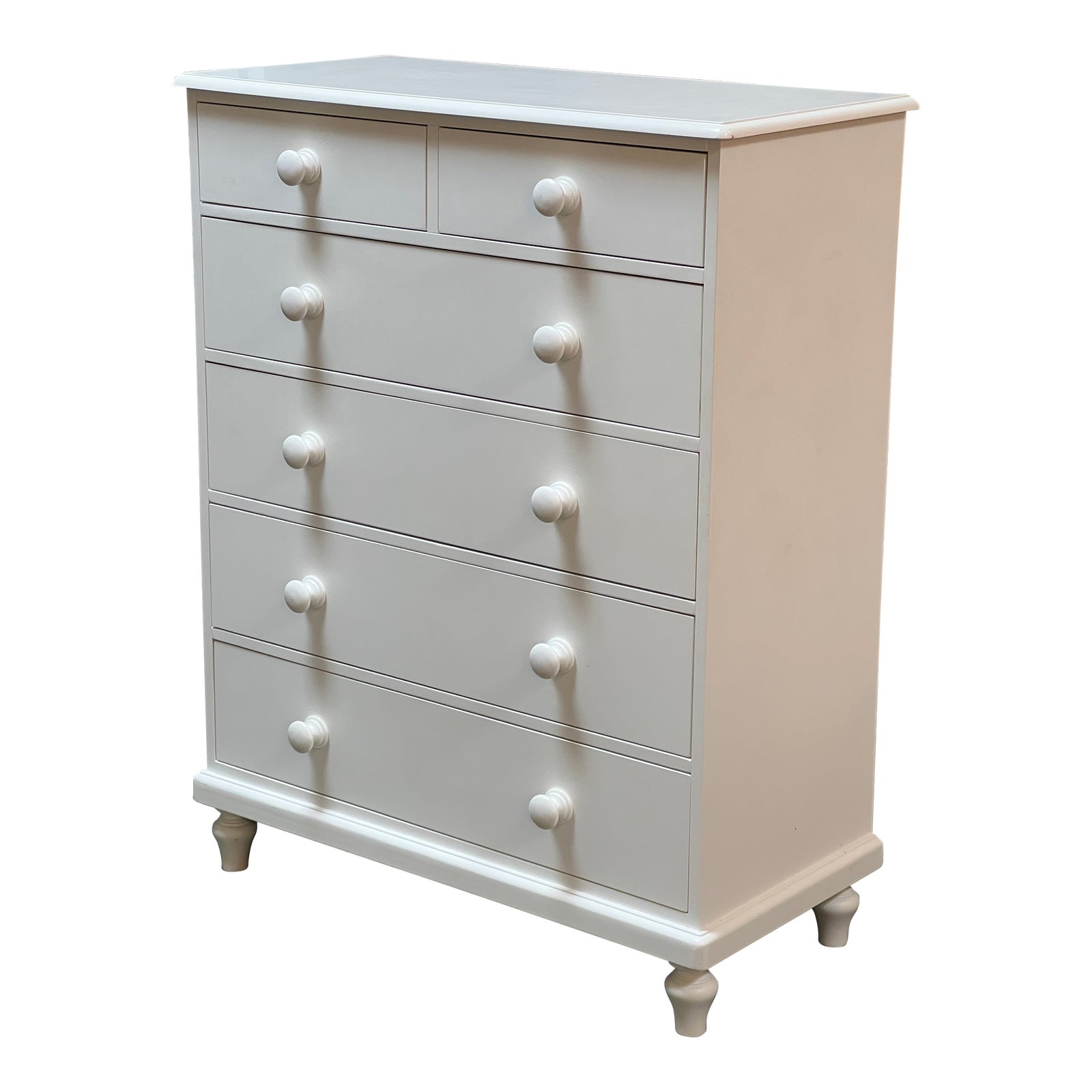 Design Plus Gallery presents a Pottery Barn Highboy Dresser in Berkeley White. Six dovetailed wood drawers offered storage space high on turned legs and within a small footprint. The exterior is finished with a white matte varnish, including turned knobs. Light surface wear; condition is good for age and use.